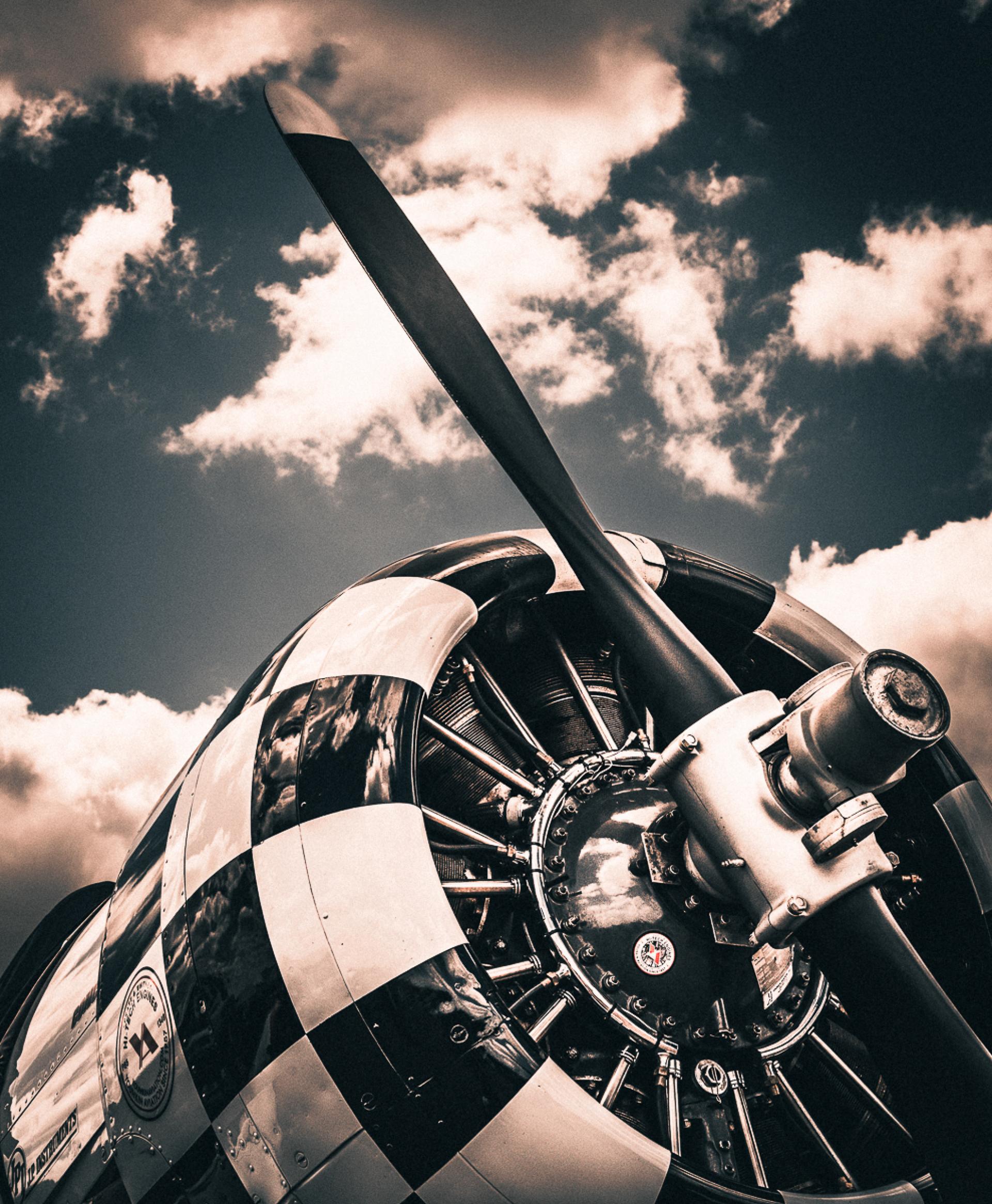 Post-processing this image in black and white allowed me to emphasize the form and texture rather than color. The polished metal reflected the clouds above, and the checkered cowling offered structure to the composition. From this low angle, the propeller seems to rise toward the open sky, suggesting both the power and grace that made these aircraft legendary.
