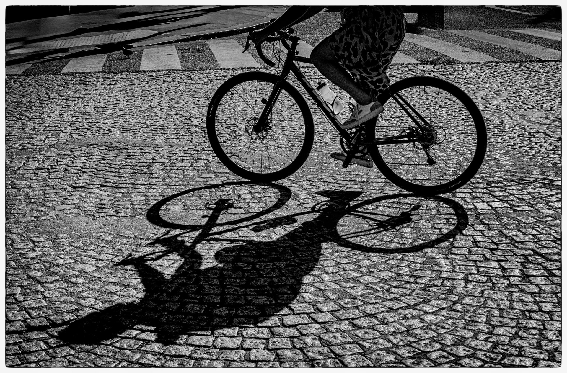 The cobblestone street becomes an essential part of the composition, grounding the scene while the rider’s shadow stretches across the frame, creating a quiet visual echo. In black and white, shape and contrast take priority, allowing the geometry of the bicycle and the texture of the street to speak.
