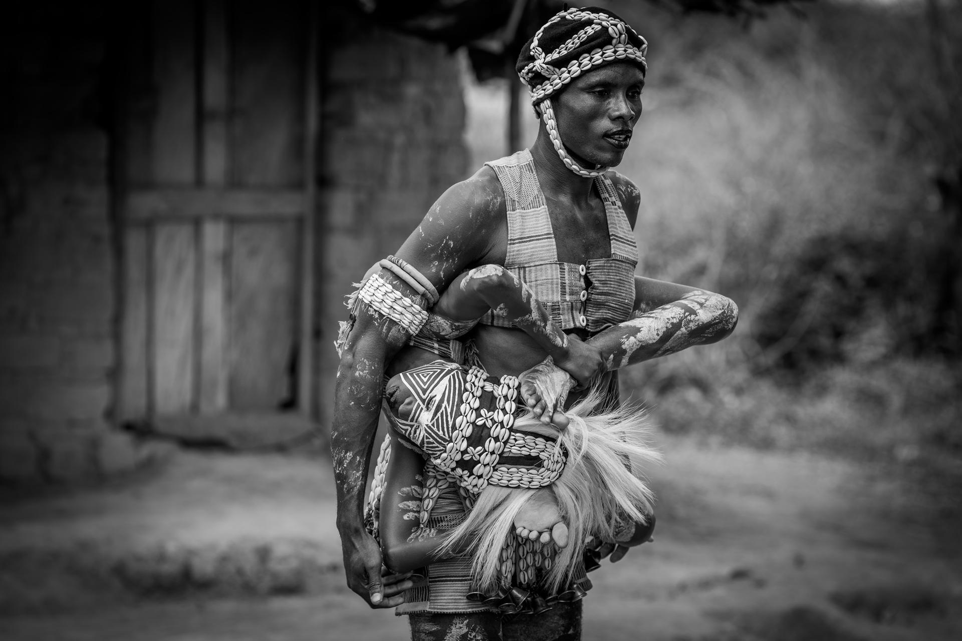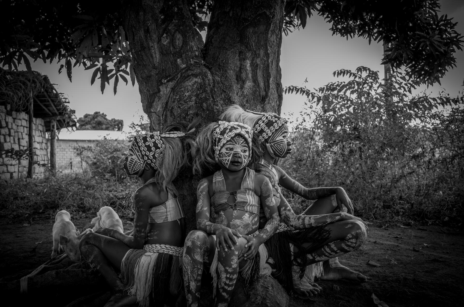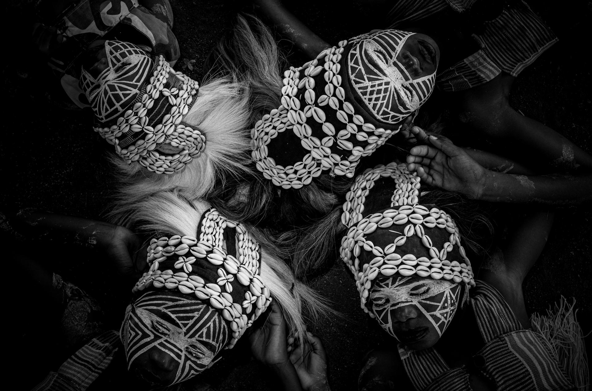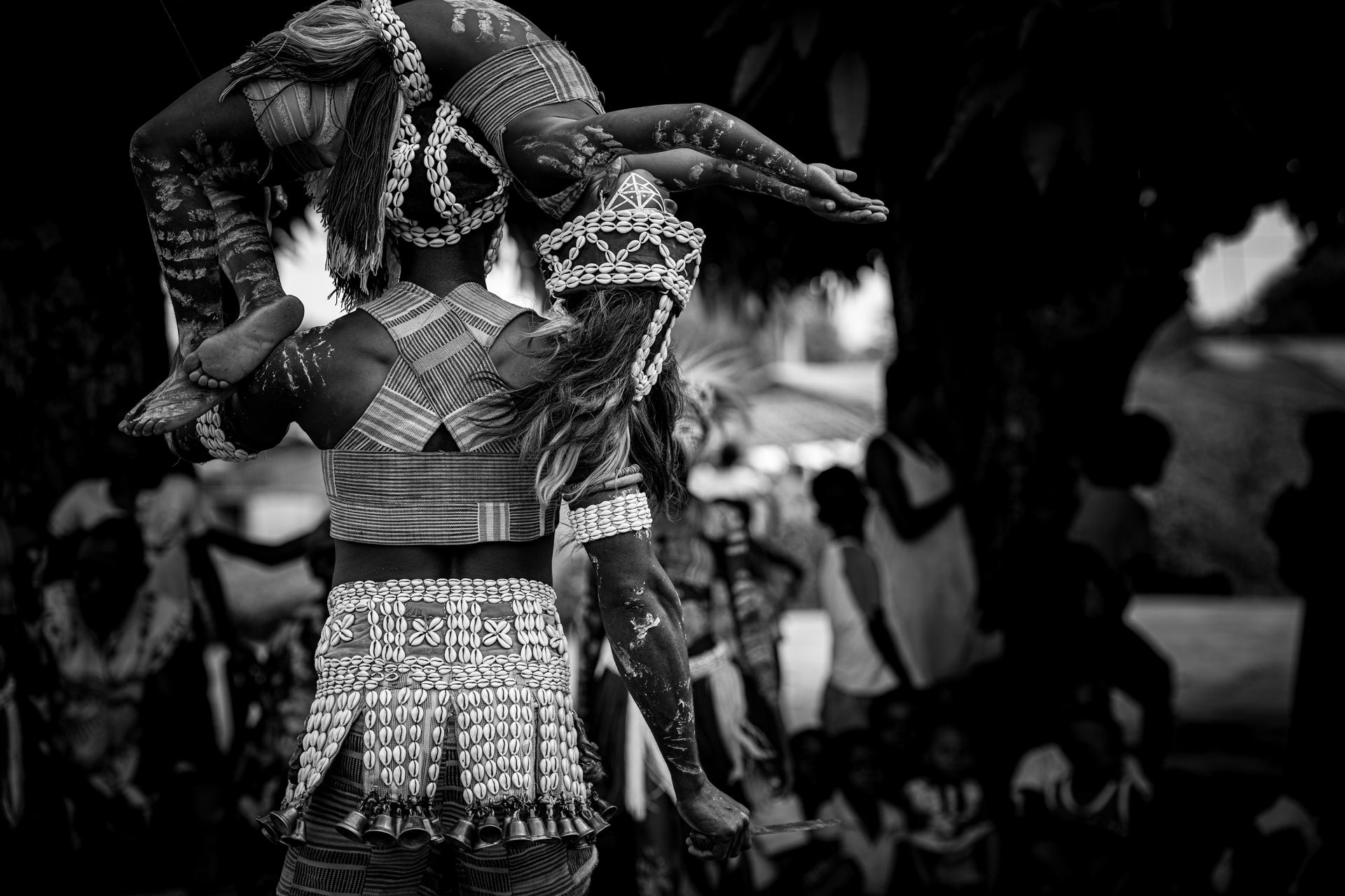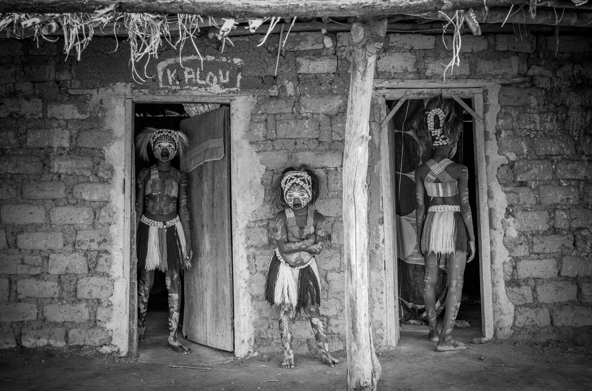 Young Guéré girls protect the village by the animal spirits of the forest, particularly snakes. The so-called snake girls begin their initiation at the age of three. The community's shaman 'Simbo' teaches them to capture the essence of nature, in the form of the soul of a snake. Moreover, the girls were trained and drilled to perfect the technique of the snake dance - dance of the Jugglers. They are neither allowed to speak, communicate, nor to smile. During the dance the girls mimic snake movements, supposedly while in trance, and demonstrate spiritual protection. When they turn 10 years old, their relationship with this brotherhood ends, and they are released to live a normal life. The snake girl ritual is usually celebrated in communities that live in isolated and difficult-to-access regions in Ivory Coast and Liberia.