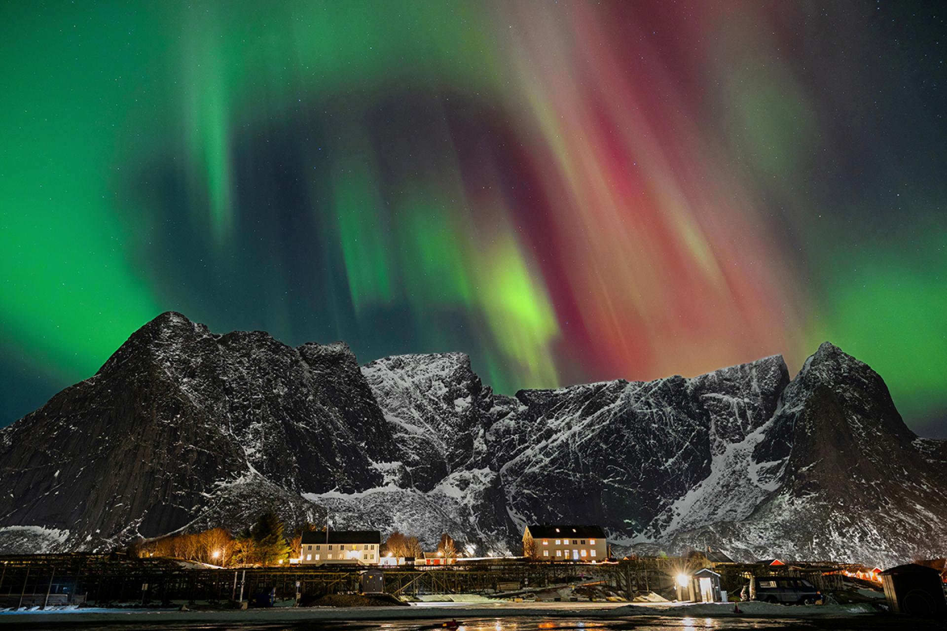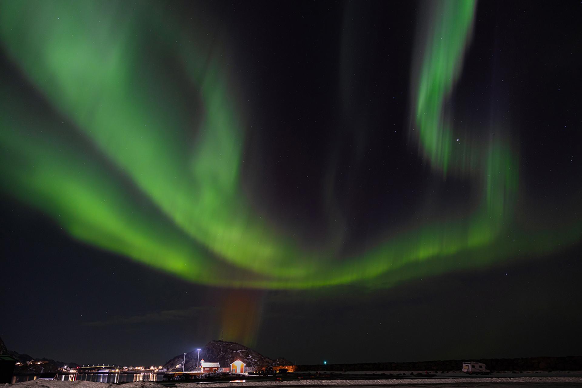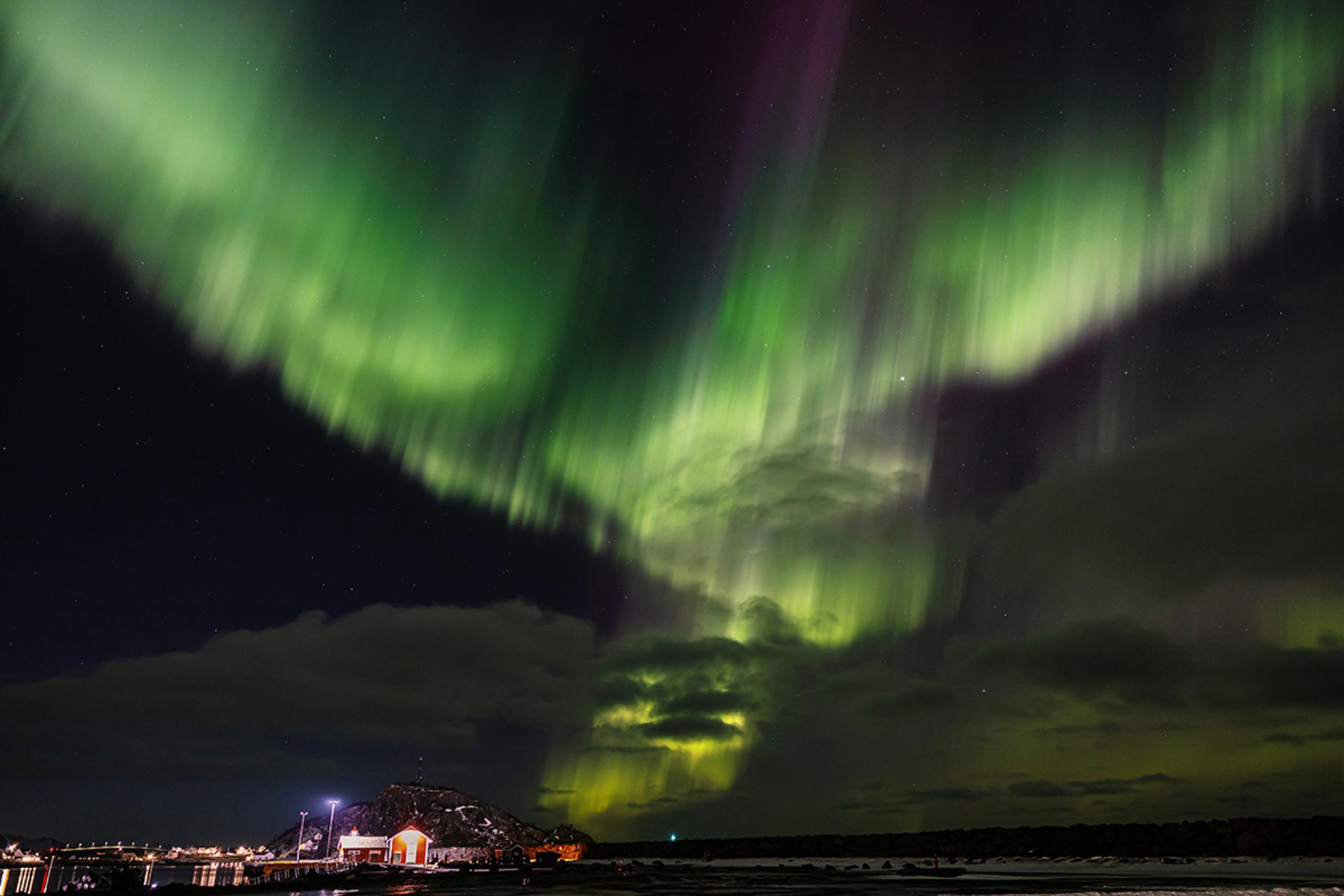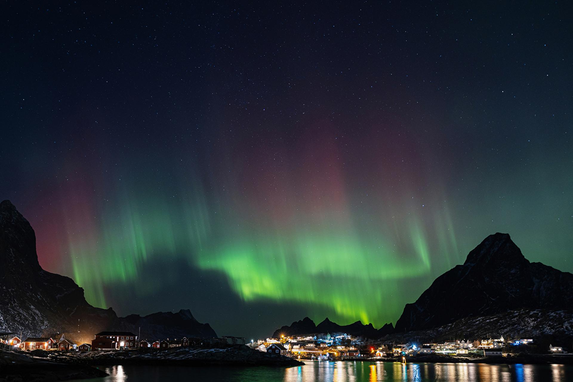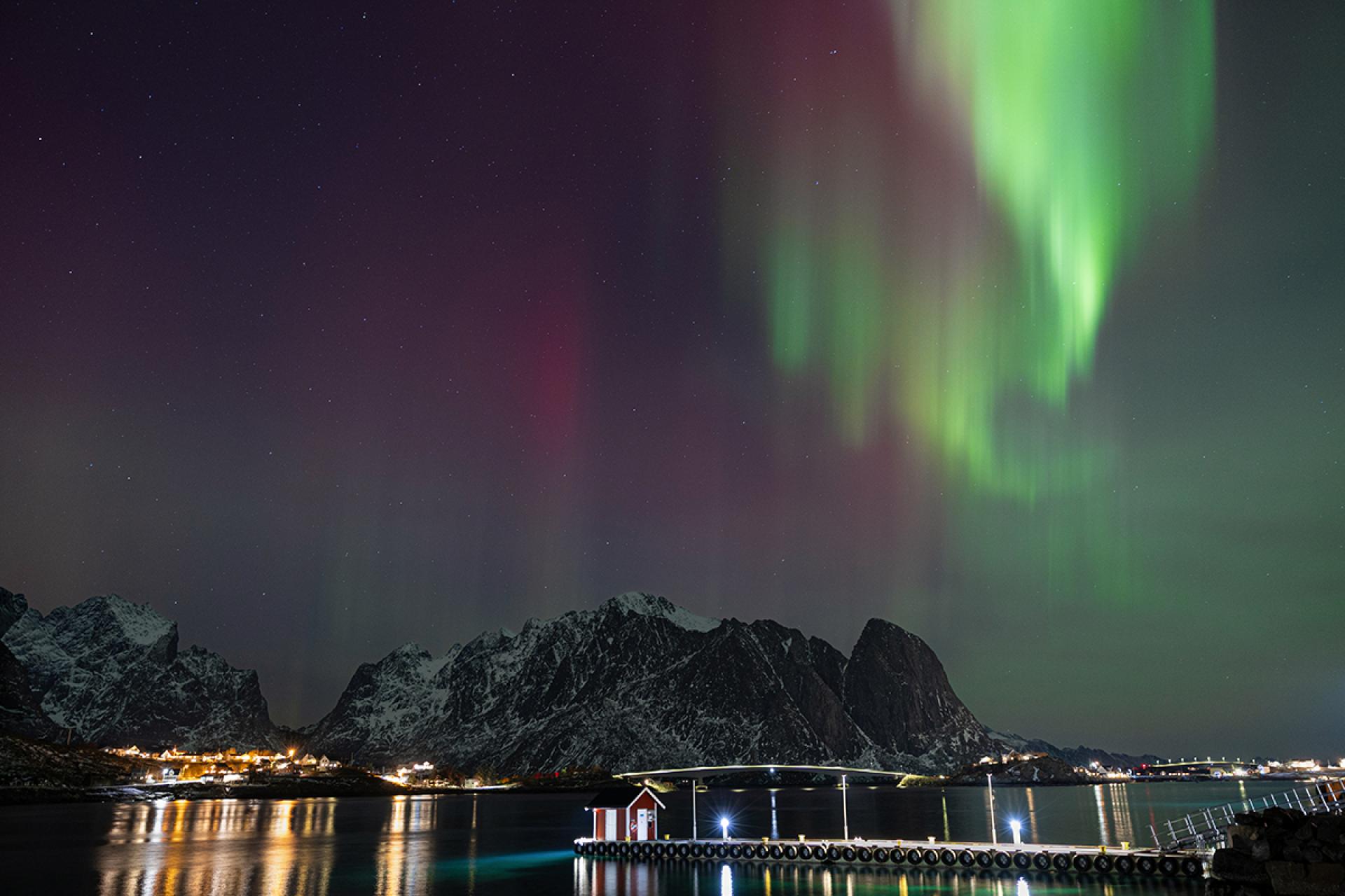 A series of photographs depicting the spectacular light phenomenon in the sky known as the aurora borealis. The photo was taken during a trip to Norway, on the island of Moskenesøya in the Lofoten archipelago, in the town of Reine.