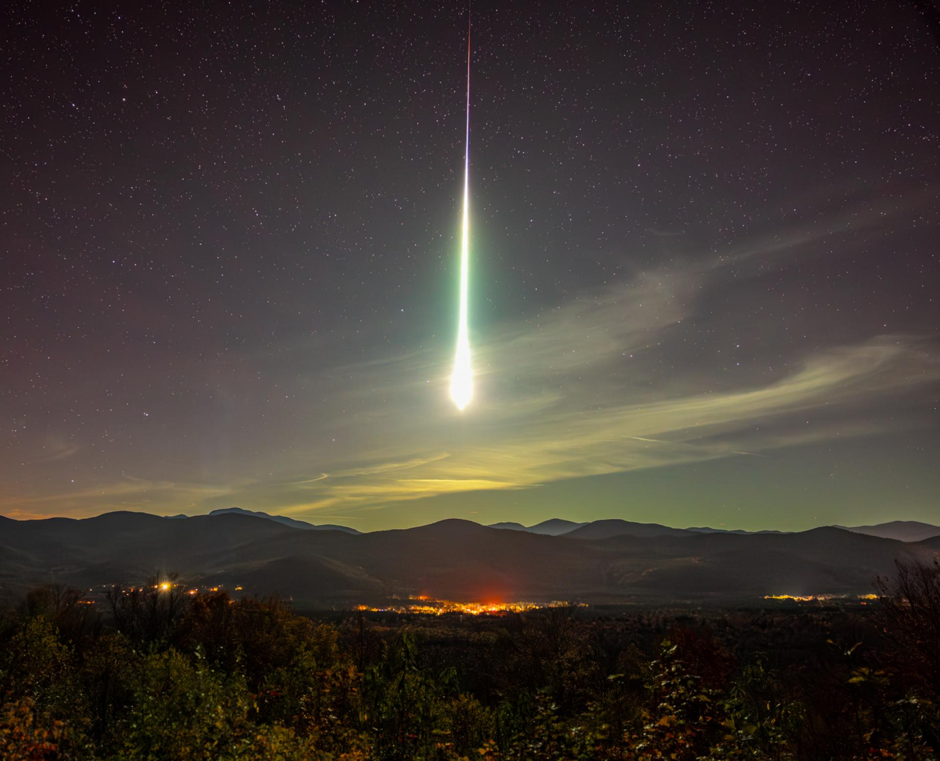 A bright green meteor is captured in a single shot. This beautiful bolide shot across the sky in the White Mountains of New Hampshire and was part of the Orionid meteor shower. The dark skies of the White Mountains offer a prime location for star gazing.