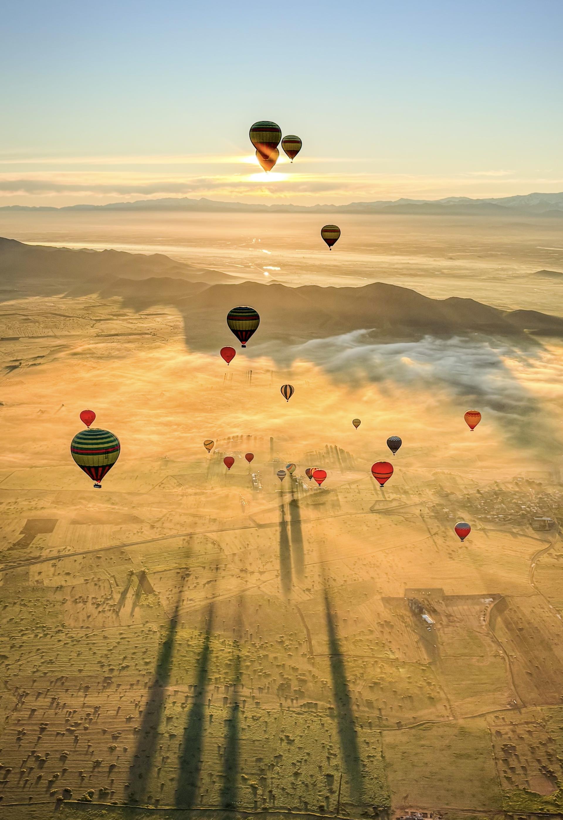 As the first rays of the sun peek from behind the mightly Atlas mountains, colorful balloons take the sky, rising above the low fog, casting long dramatic shadows as they chase the sunrise above Marrakech