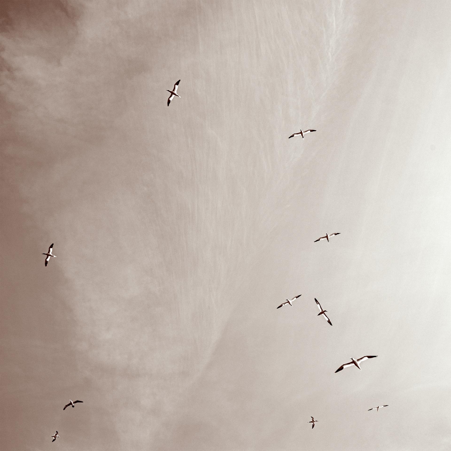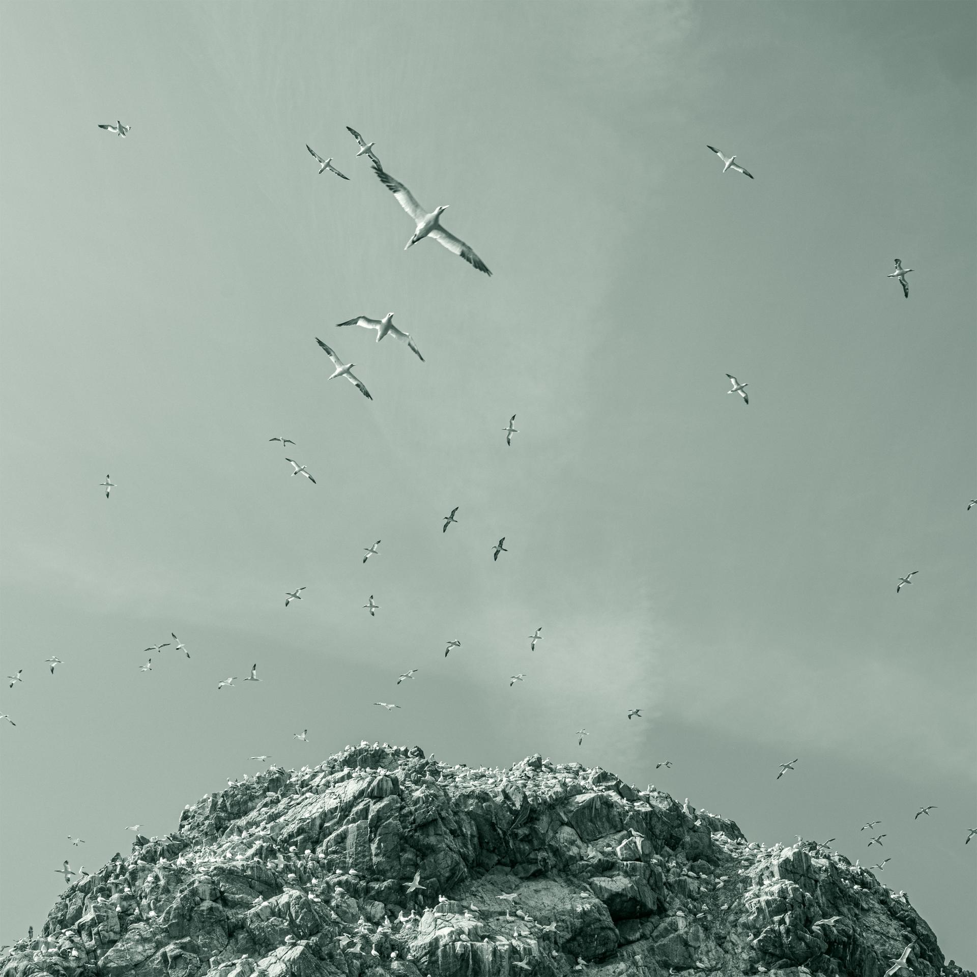 This two-part series presents a minimalist study of the Northern Gannet colony on Île Rouzic. By isolating the birds’ rhythmic flight patterns against a delicate, ephemeral sky, the work explores the 'metabolic intimacy' of maritime ecosystems. These compositions function as a biological script, where the avian forms become calligraphic traces of an increasingly precarious existence amidst planetary shifts. Moving beyond traditional wildlife documentation, this fine art approach visualises the fragile boundary between resilience and disappearance in the Anthropocene, recording the 'traces of transition' in the air.
