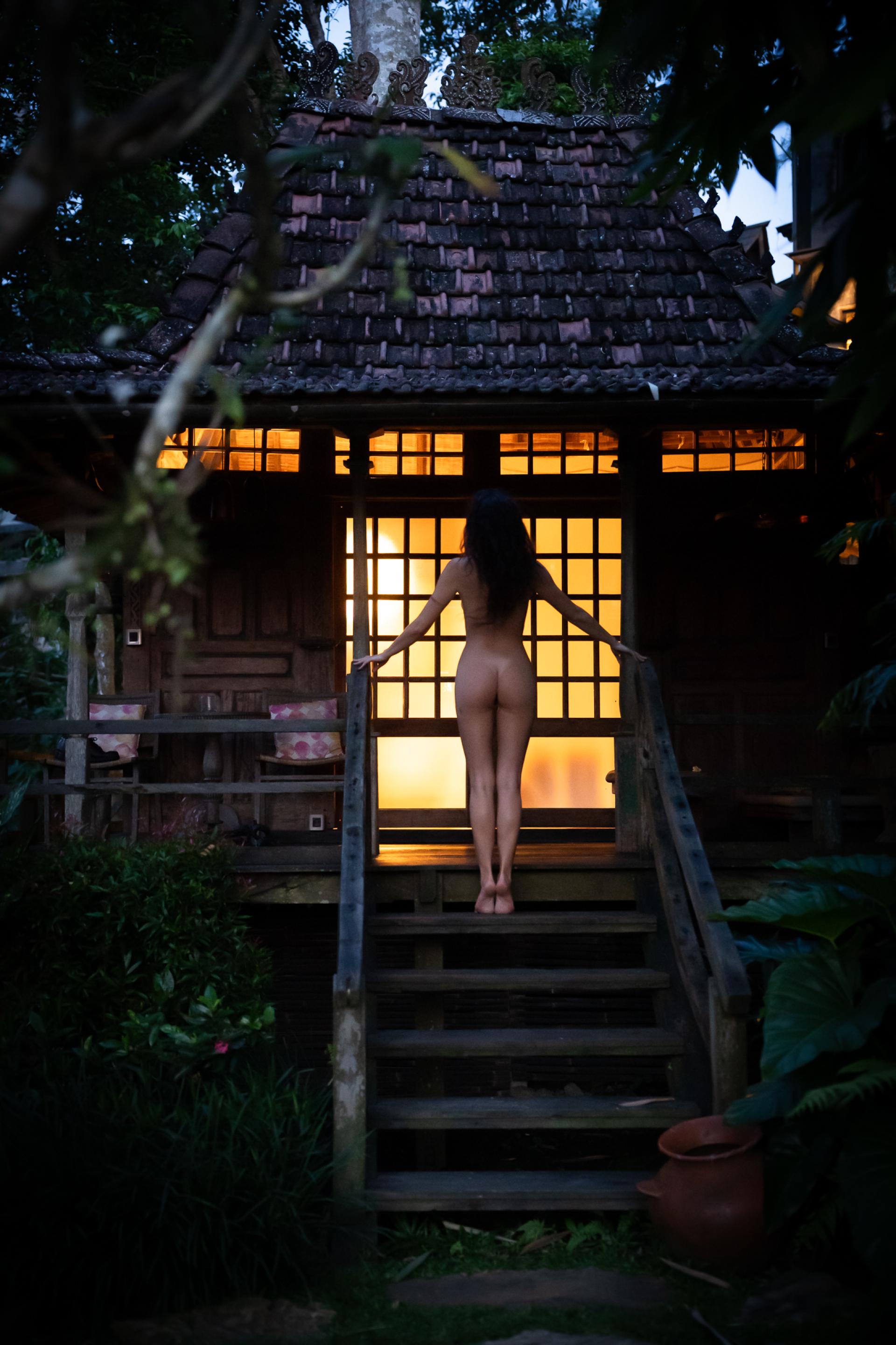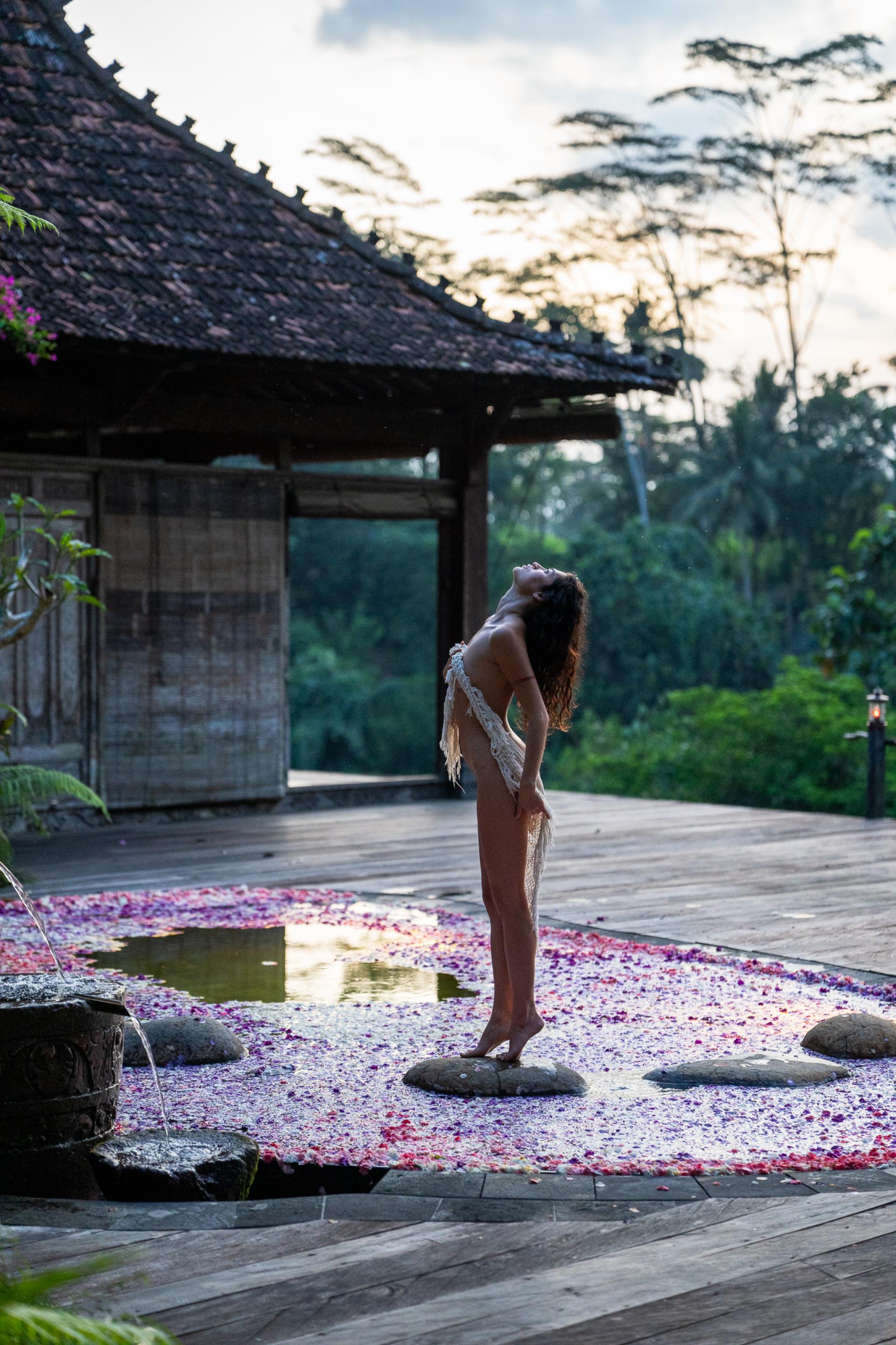 Evoking a dream of Bali with sensual intimacy and stillness, with interior natural light and silver hour lighting, as a contrast to the more expected sun drenched and dynamic tropical beach images of Bali.