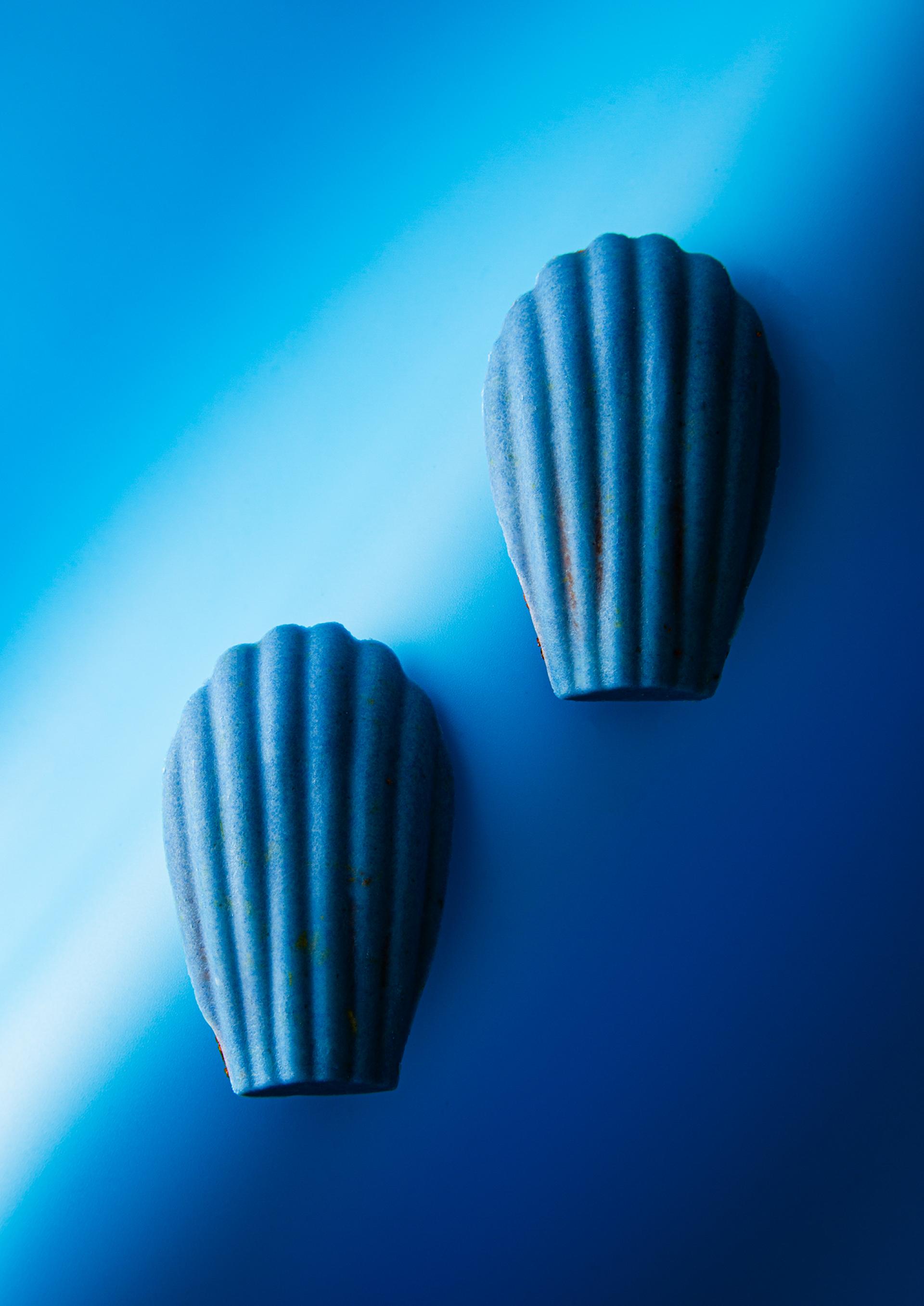 Two identical shell-shaped forms float in a vast blue field.