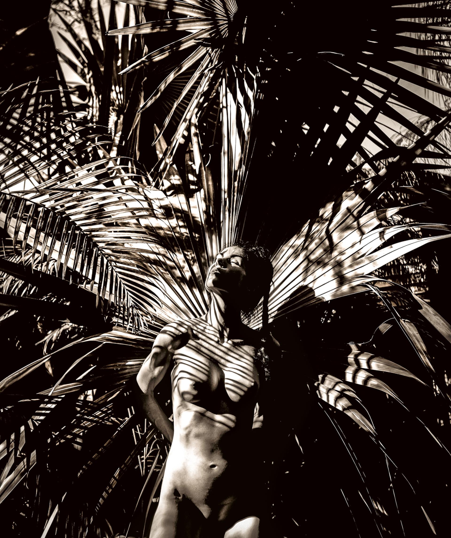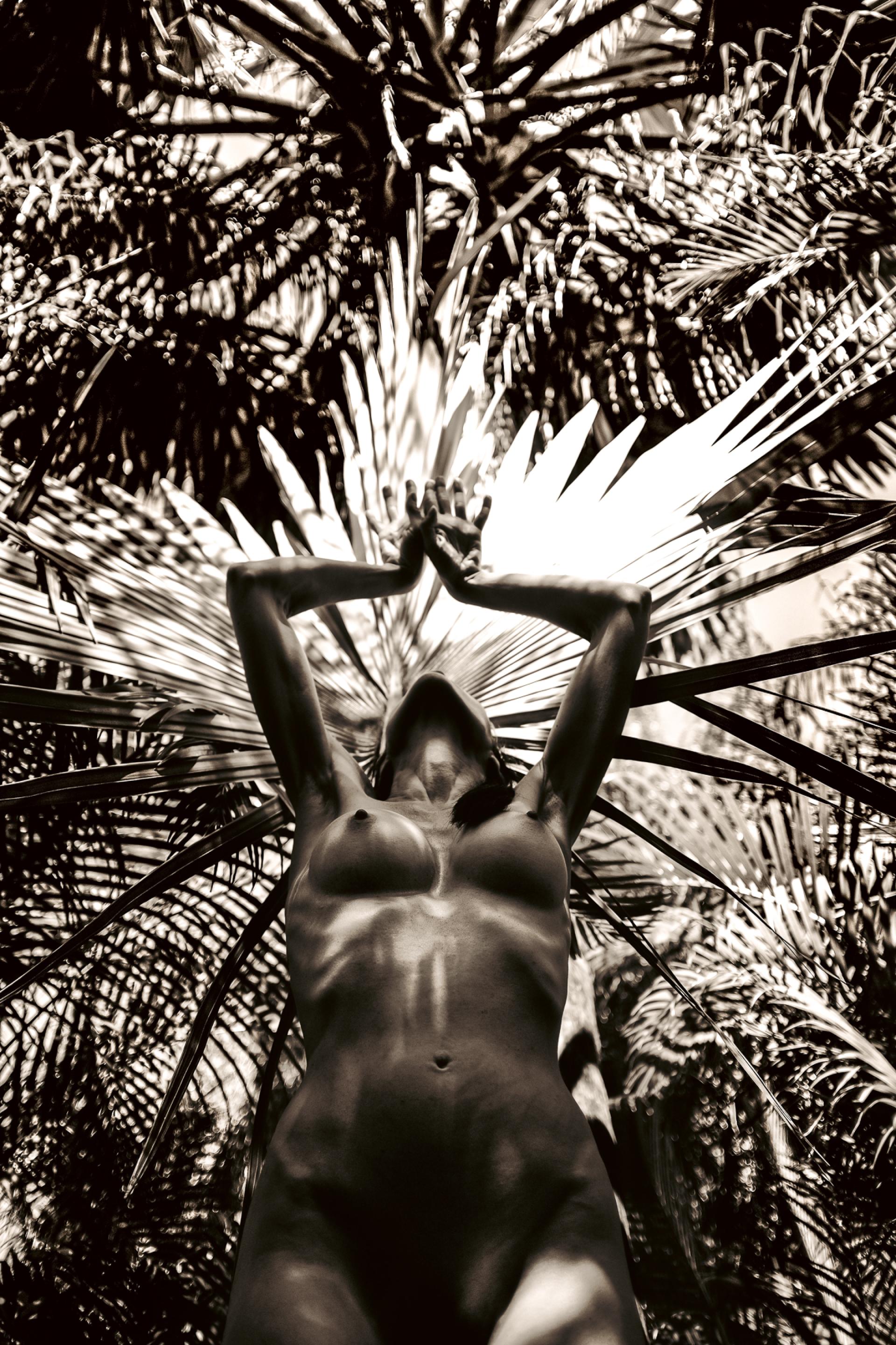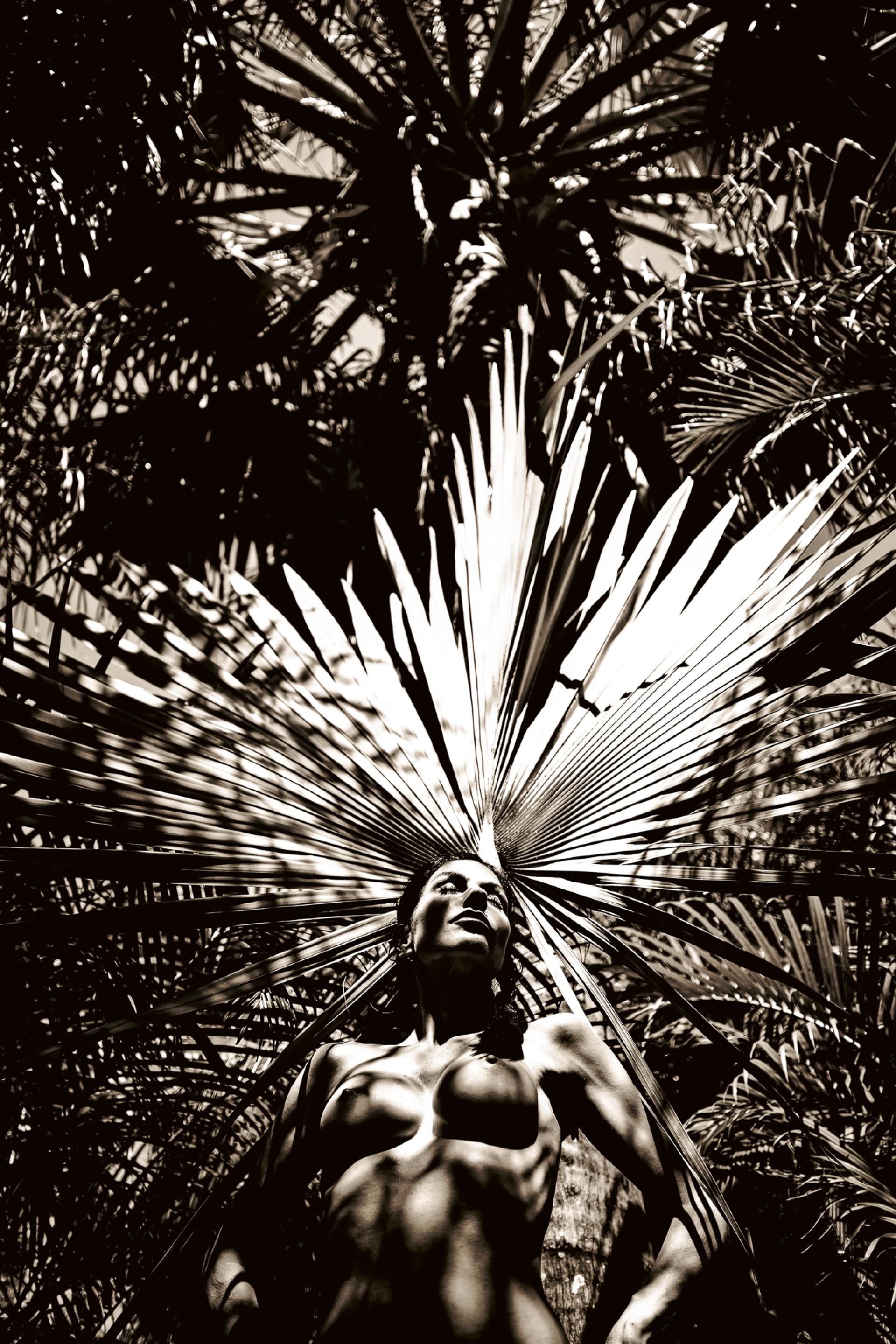 The Headwoman presents the female nude as an embodied presence immersed in tropical foliage and uncompromising sunlight. Within this charged environment, the figure appears sovereign—at once grounded, self-possessed, and alert. Crowned in the tropic light, her presence exudes strength and independence, casting wide the shadow of her authority. Light and shadow fall across her body in geometric patterns formed by palm fronds, transforming skin into surface and landscape into collaborator. Just as an emperor's profile adorns the silver coin so her profile cuts against the broad frond of the silver palm.