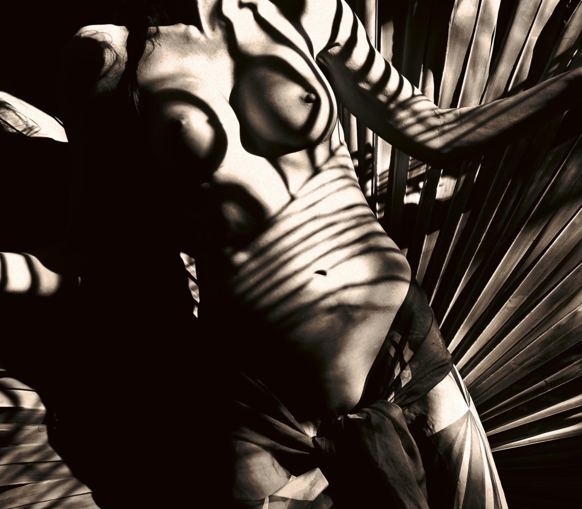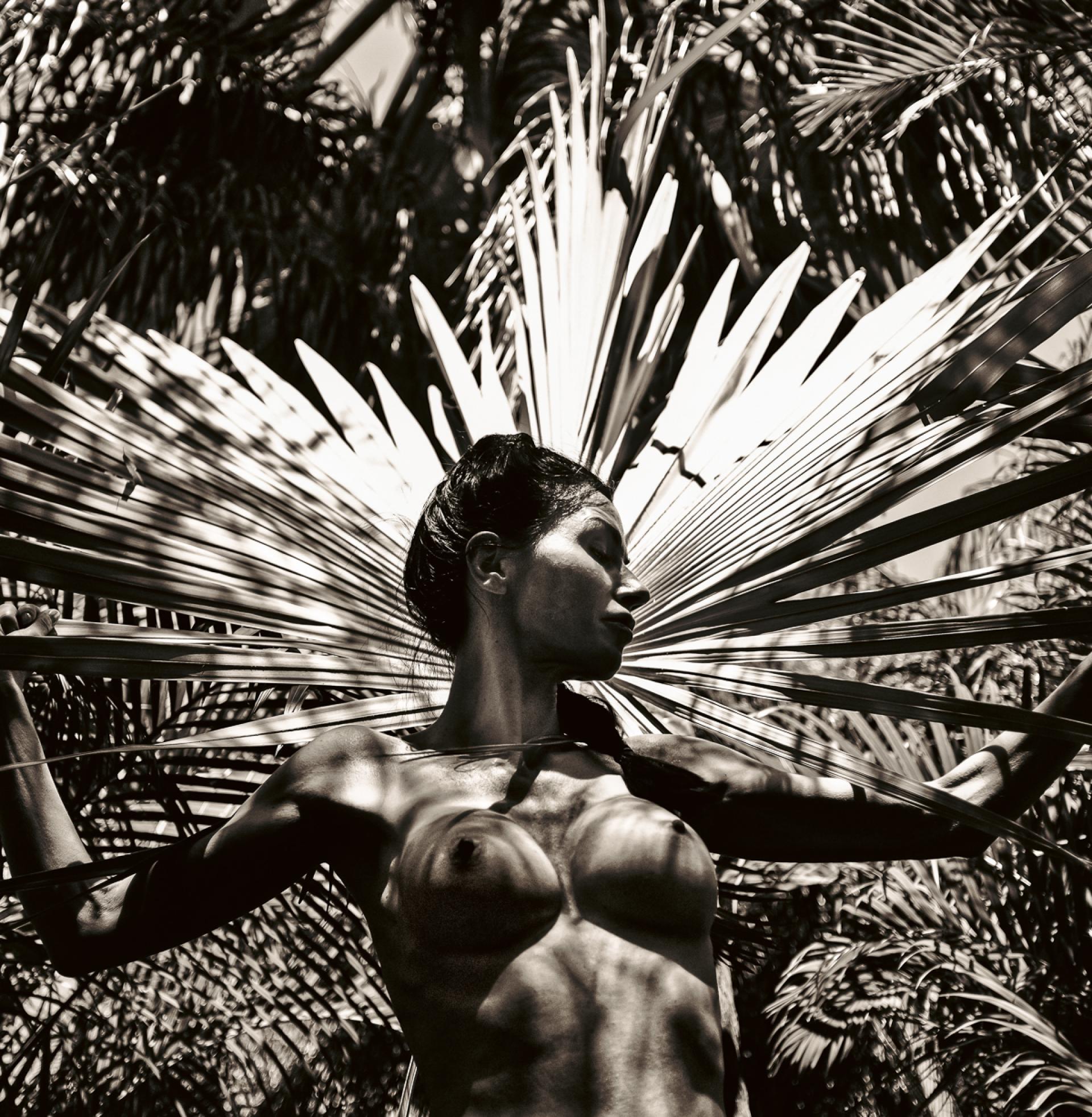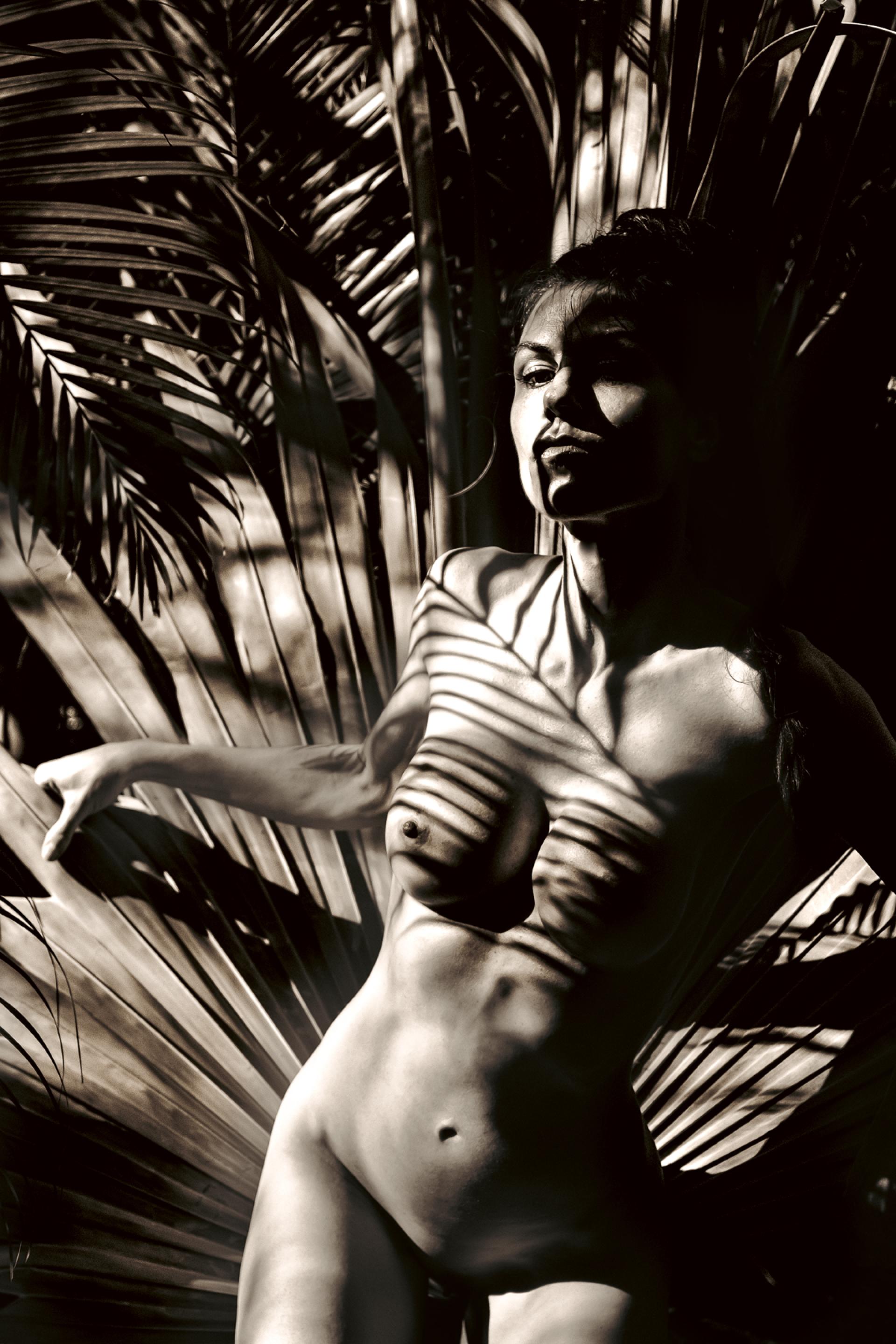 The Headwoman presents the female nude as an embodied presence immersed in tropical foliage and uncompromising sunlight. Within this charged environment, the figure appears sovereign—at once grounded, self-possessed, and alert. Crowned in the tropic light, her presence exudes strength and independence, casting wide the shadow of her authority. Light and shadow fall across her body in geometric patterns formed by palm fronds, transforming skin into surface and landscape into collaborator. Just as an emperor's profile adorns the silver coin so her profile cuts against the broad frond of the silver palm.