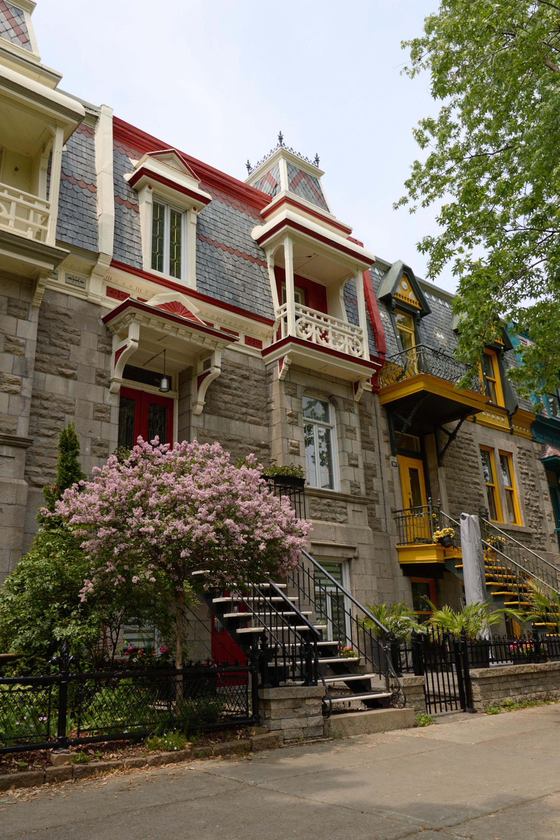 A row of historic Montréal townhouses rises from the sidewalk, their grey stone façades crowned by slate mansard roofs and finely detailed dormers. Carefully maintained trim—reds, creams, and ochres—highlights cornices, balconies, and window frames, while a blooming lilac and summer foliage soften the scene with seasonal life. Photographed from street level, the upward perspective emphasizes rhythm, craft, and the layered textures of a lived-in heritage streetscape.