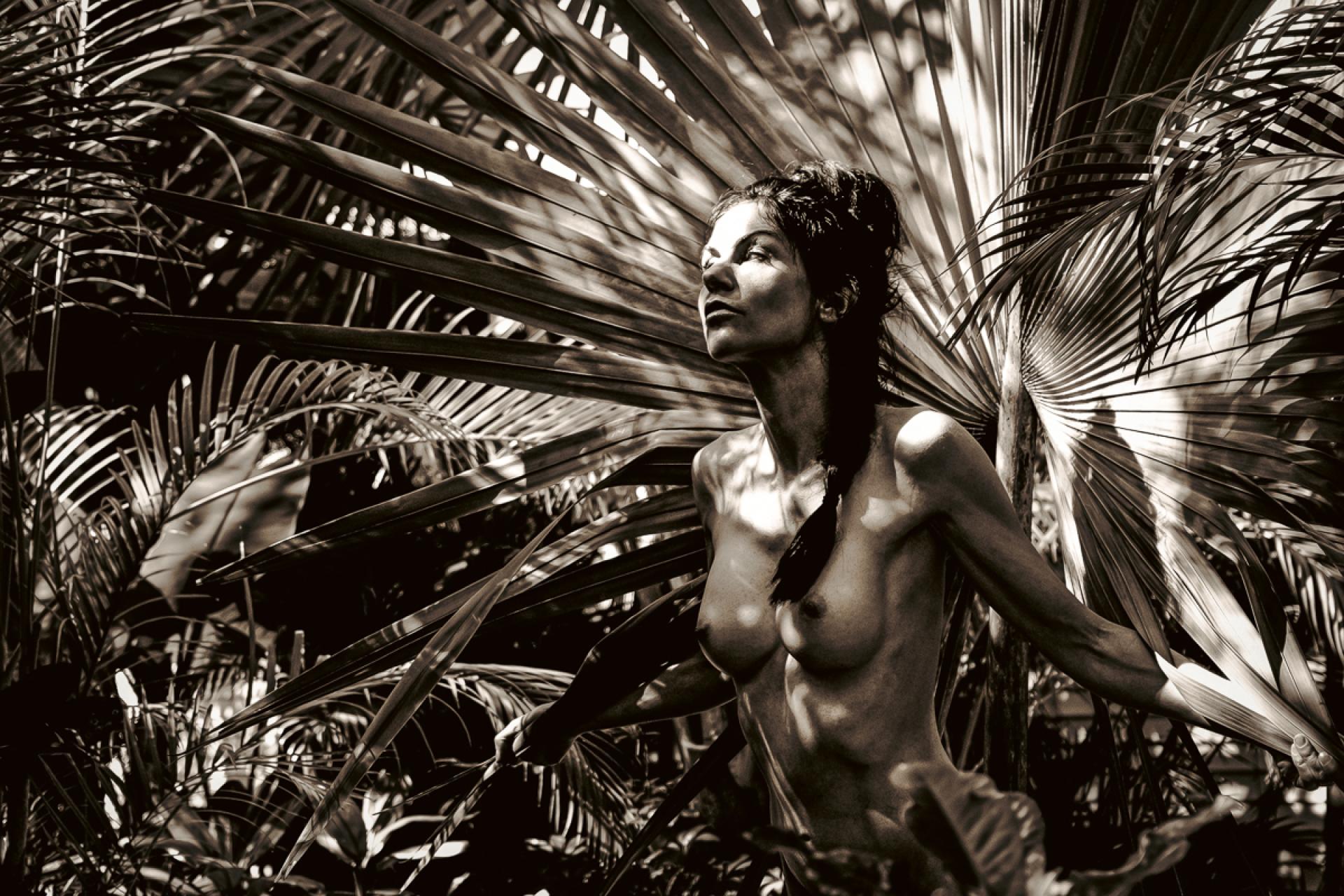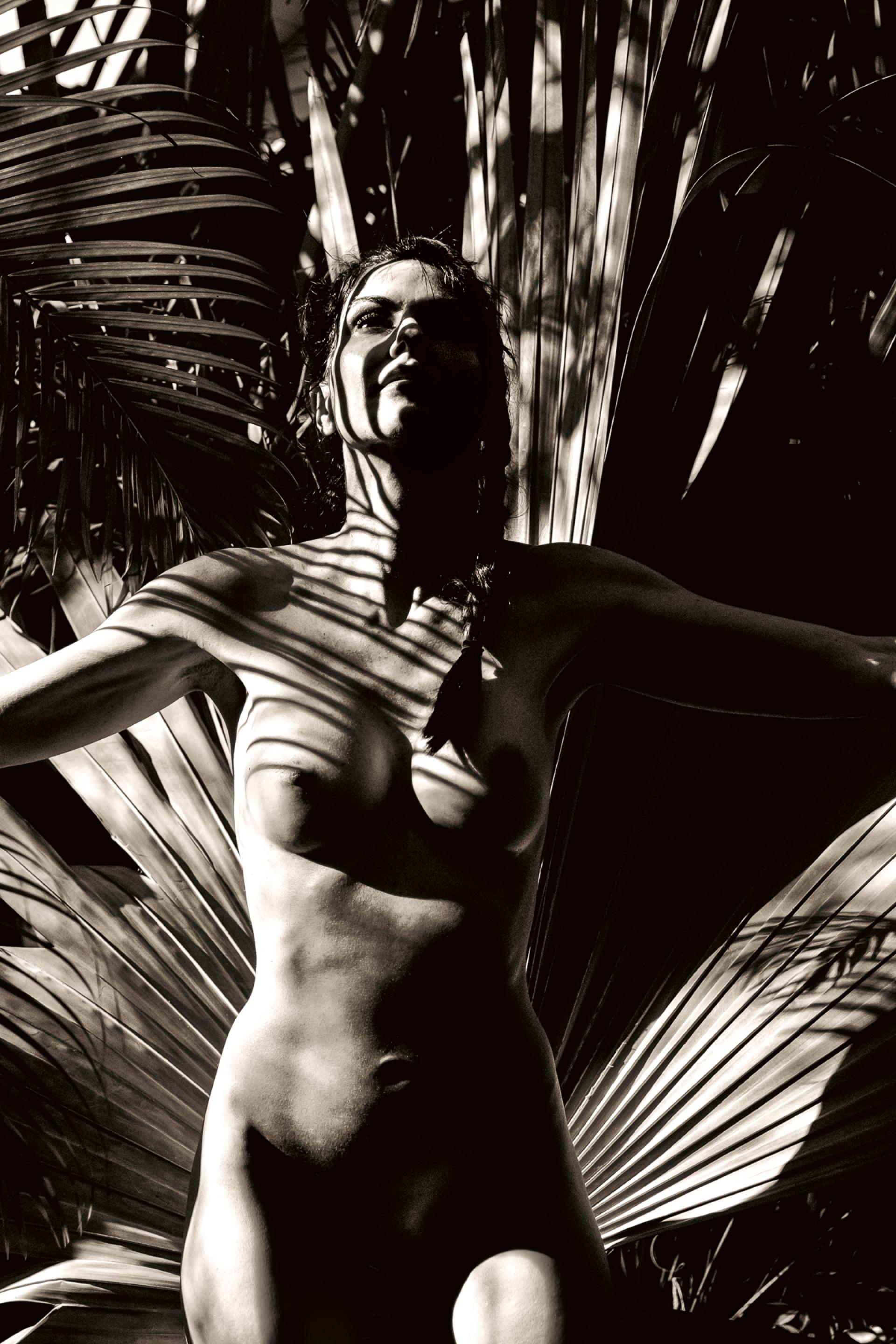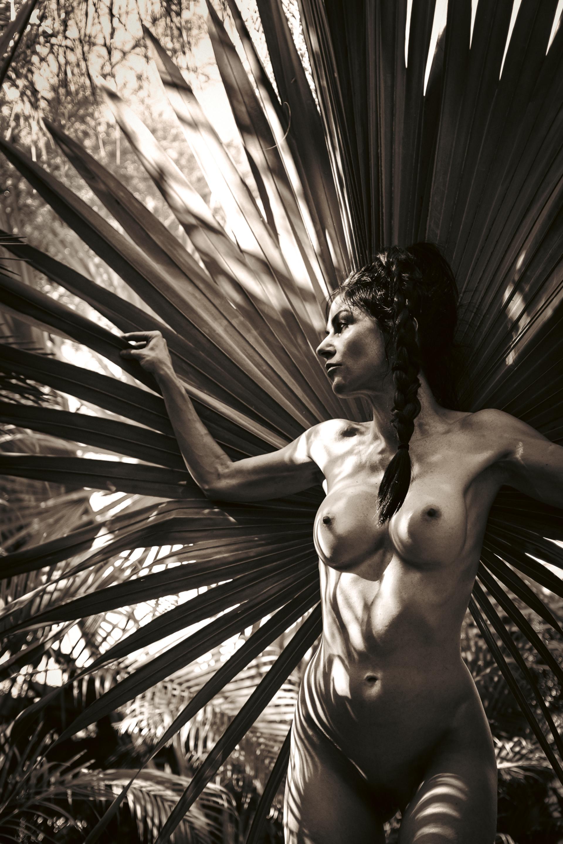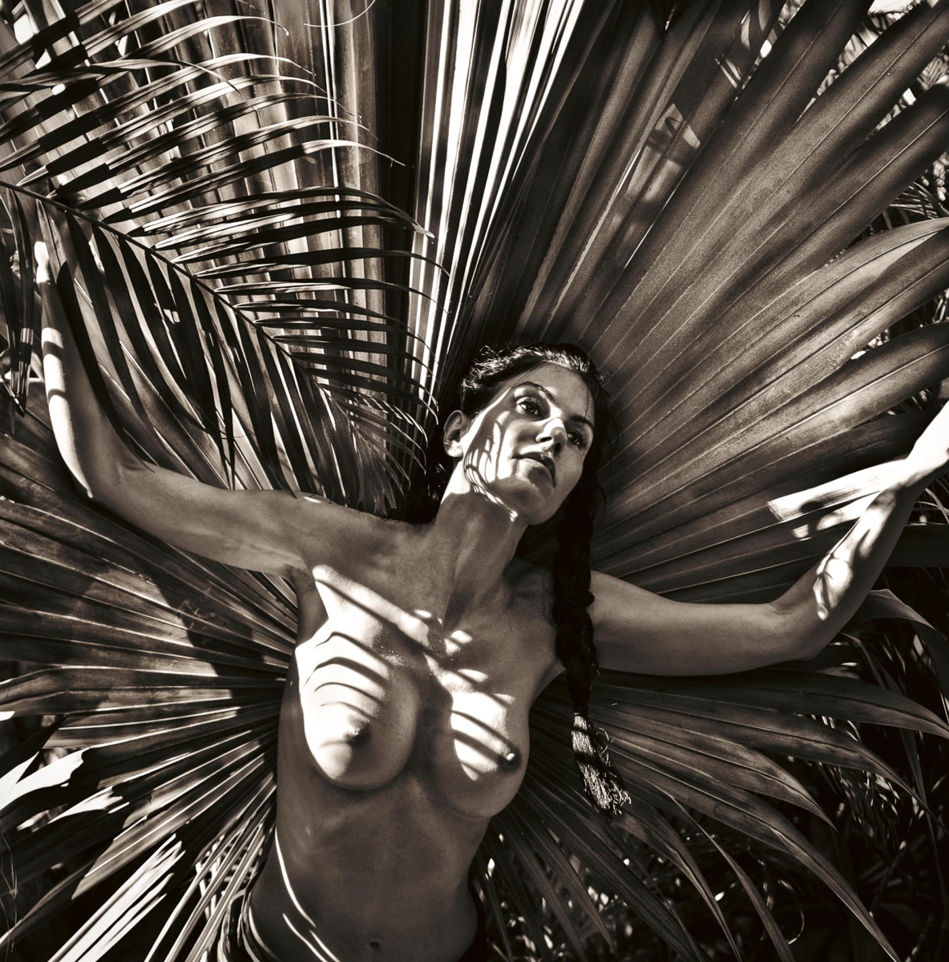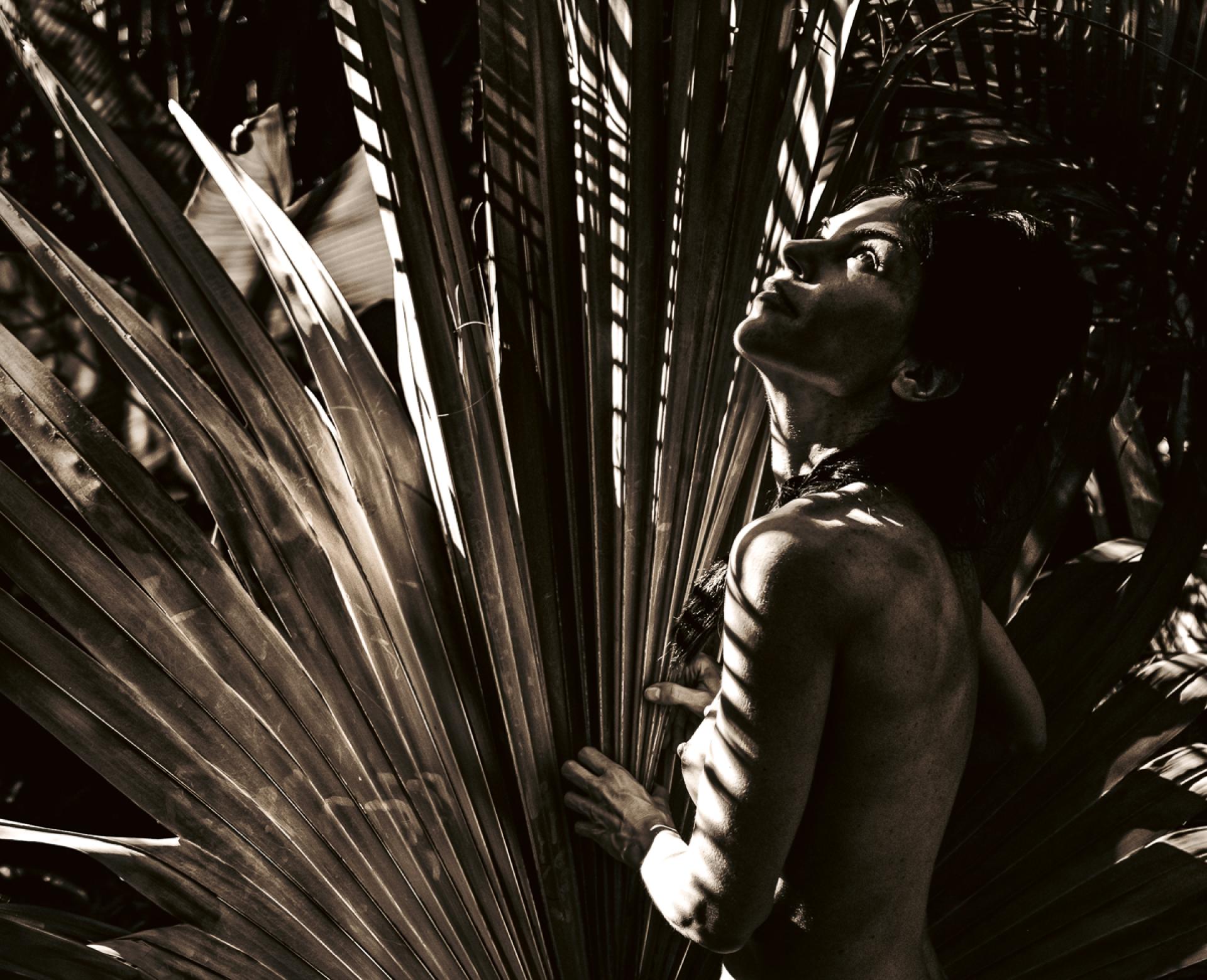 The Solar Ascendant explores the female nude as a figure of transformation within an atmosphere of intense solar illumination. Engaging directly with the sun’s radiance, the subject appears both human and other—poised between stillness and becoming. Giant Bismarck palm fronds extend behind and around her body, at times suggesting wings, at times forming sculptural planes that merge figure and foliage.