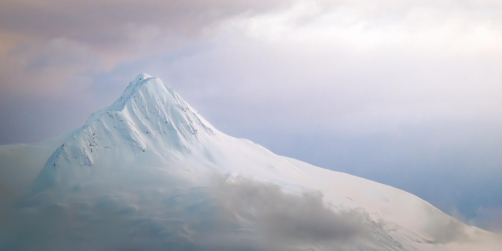 High Quiet was photographed in Alaska in December, where winter light moves slowly and the landscape settles into near silence. The mountain peak emerges through softened alpine air, suspended between shadow and low seasonal sun.