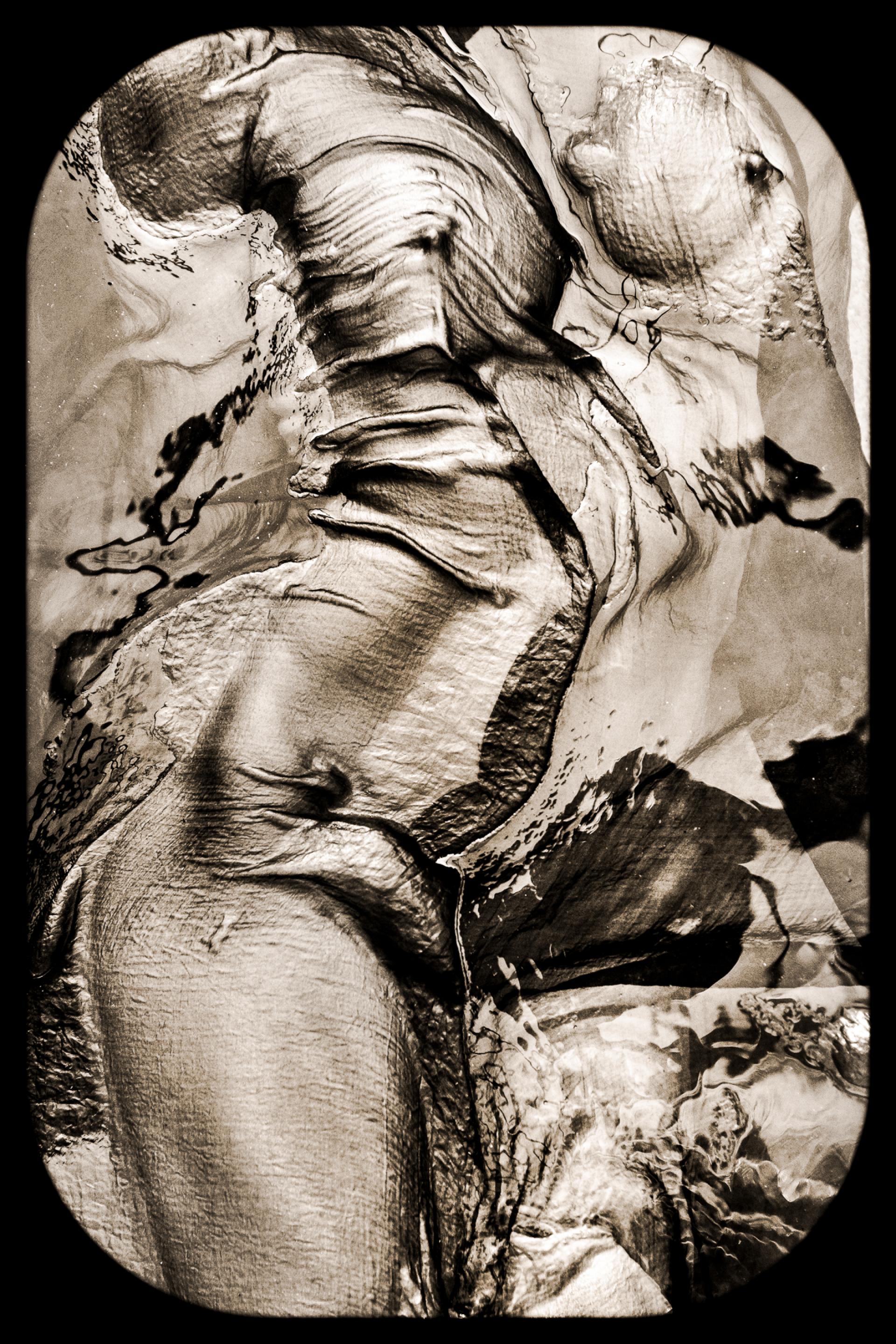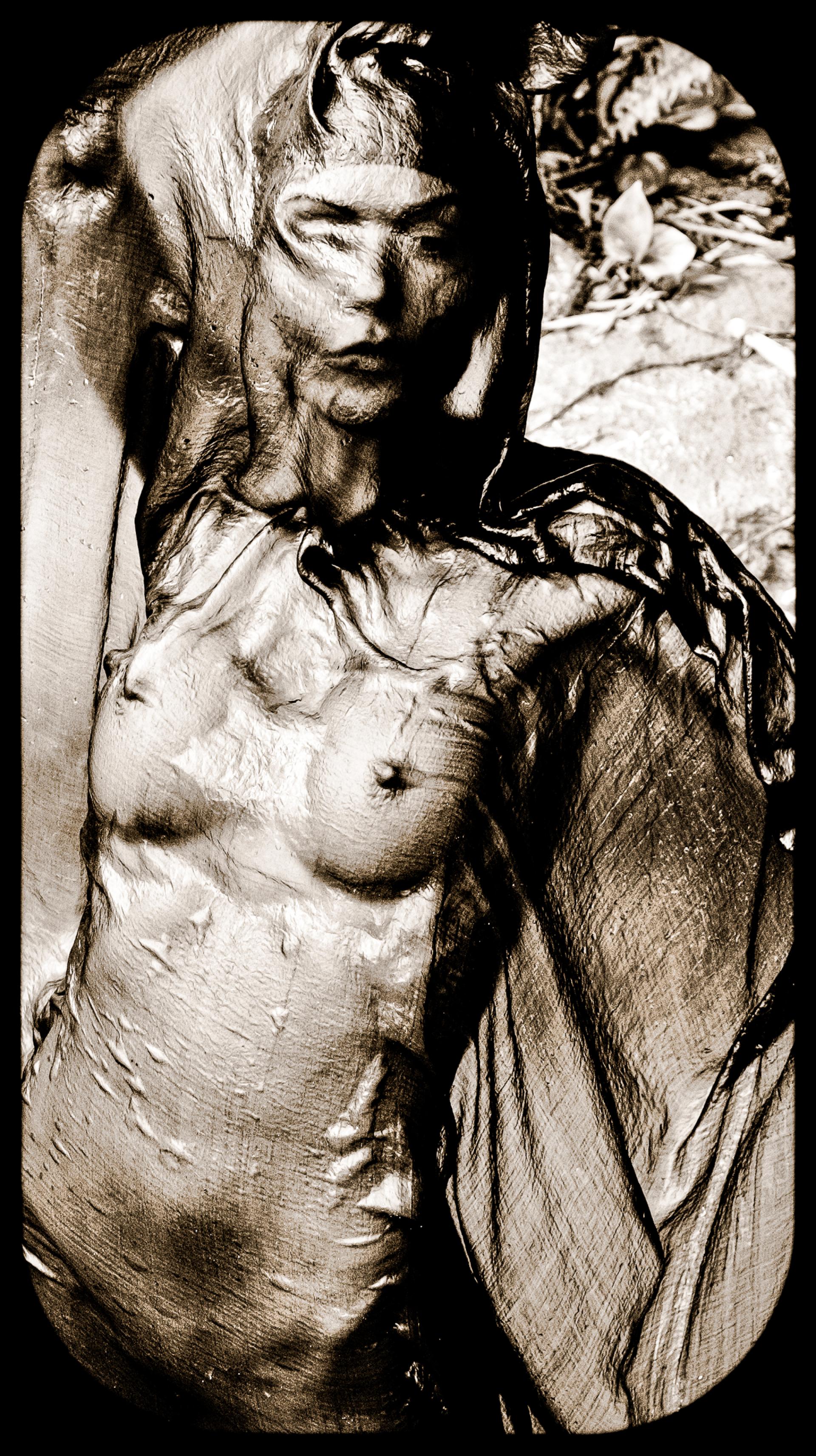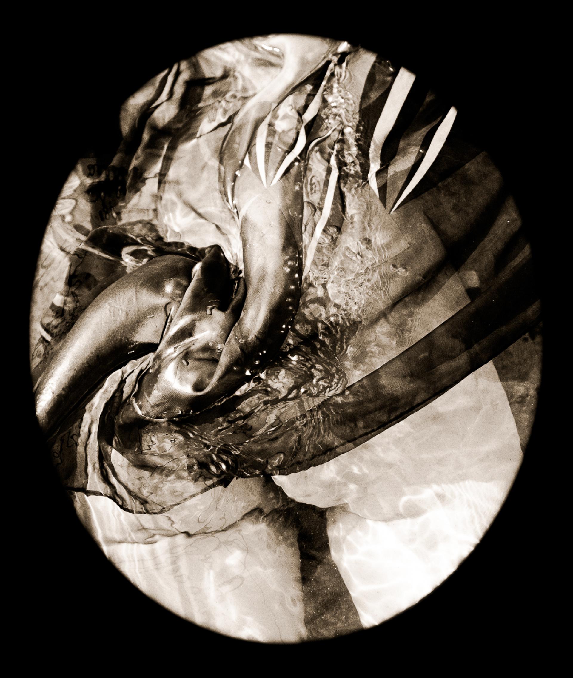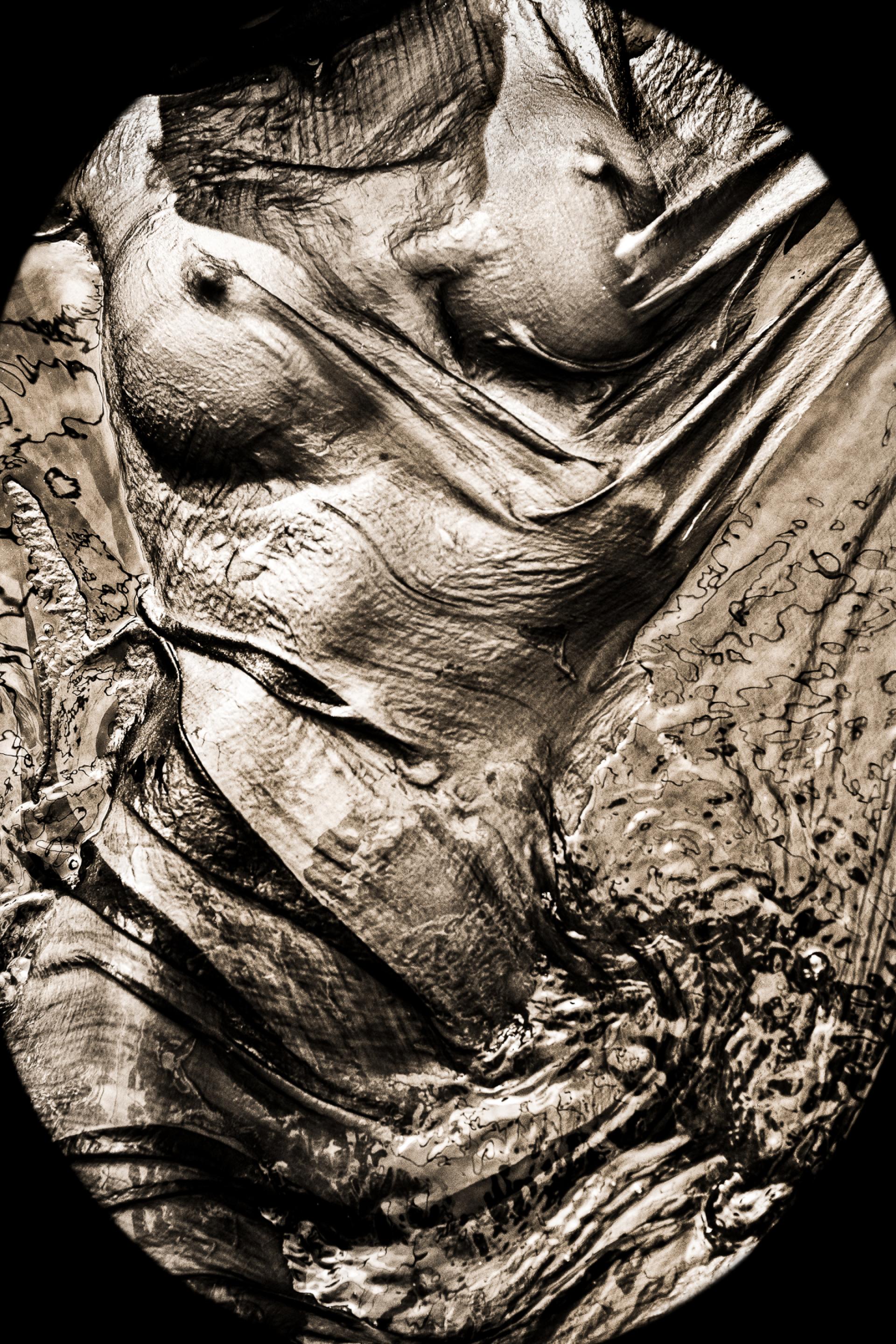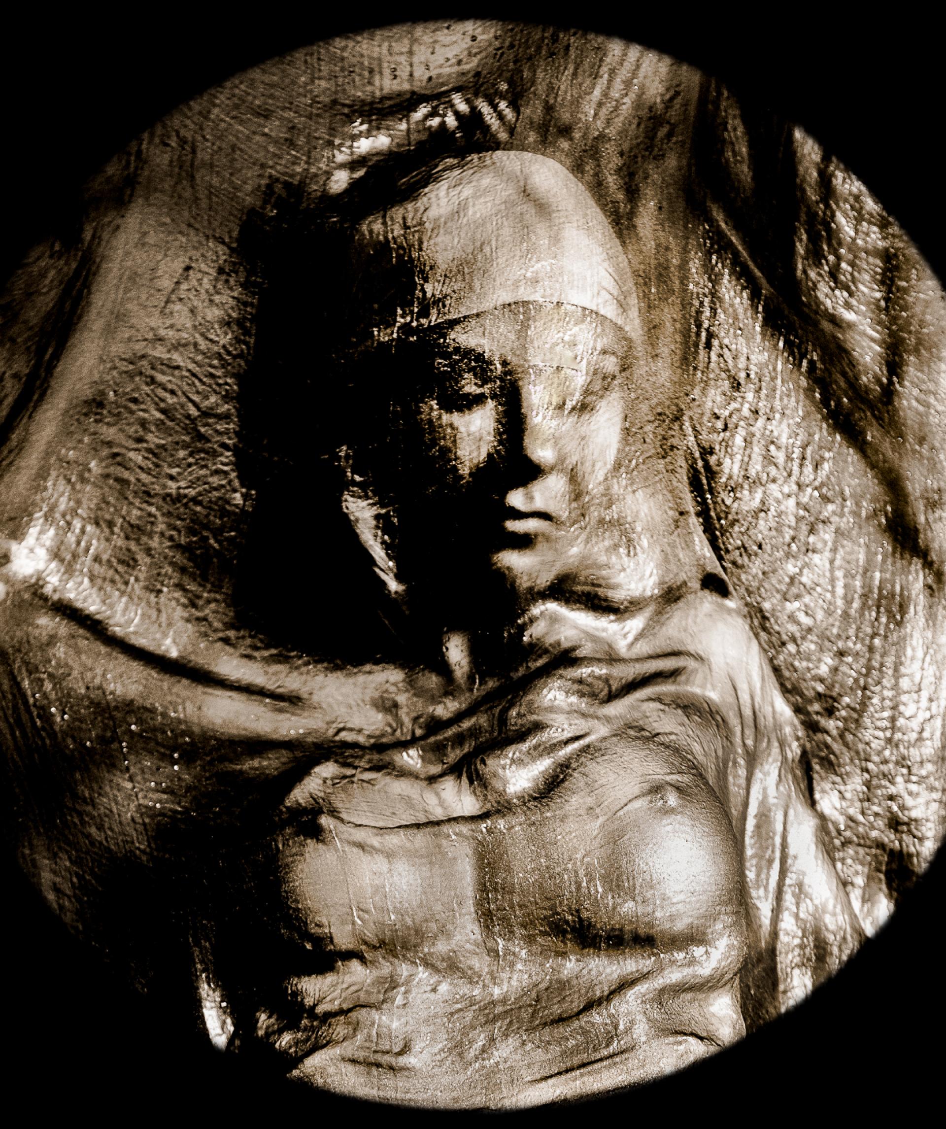 Theater of Twisted Vanities explores the human figure veiled in wet silk and suspended between revelation and distortion. Bodies emerge through translucent fabrics that simultaneously clothe, bind, obscure, and transform. Sepia toning and circular vignettes evoke antique viewing devices, inviting the audience into a psychological spectacle where beauty bends toward myth, sanctity, monstrosity, and decay.