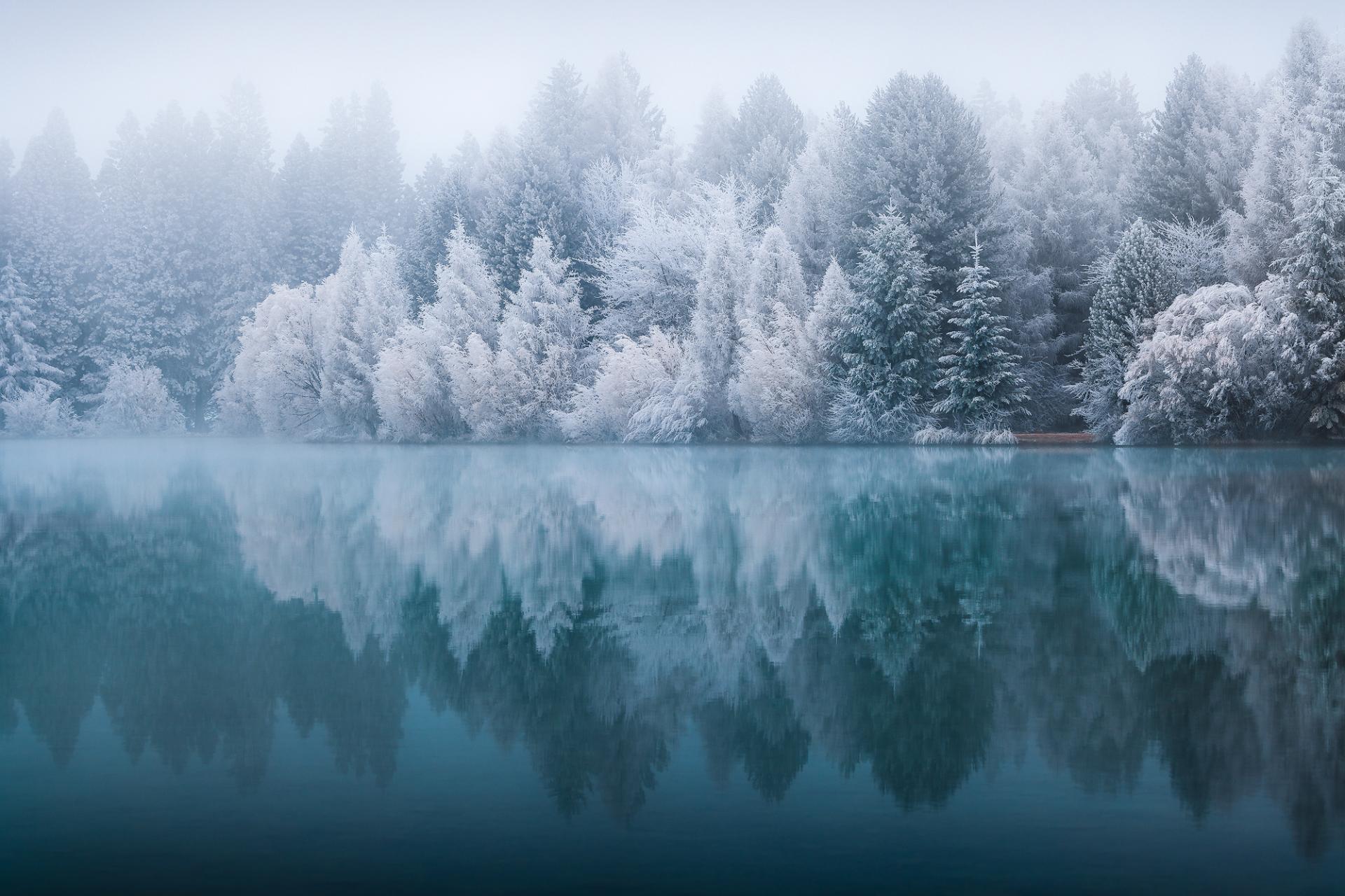 Taken during the winter of 2024, my favourite place & conditions to ever photograph. A heavy hoar frost in New Zealand's South Island. The mist brings together the turquoise glow of the glacial water, the delicate frost on the trees, and the dream‑quiet ambience, still reflections, and winter hush. You could hear a pin drop.