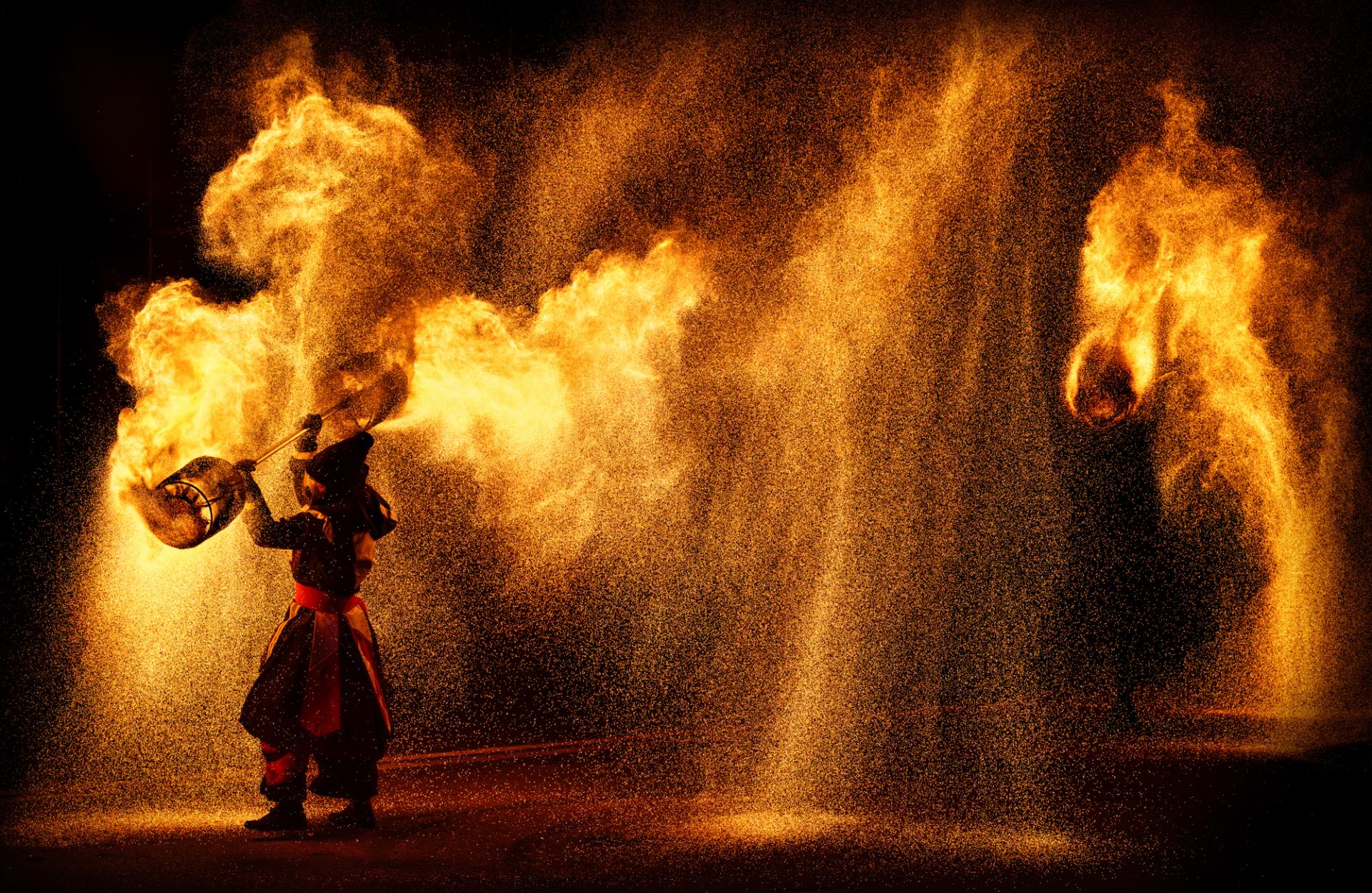 The figure of the fire dancer blends with the flames, as if dancing with the flames, performing a fiery dreamy performance.
