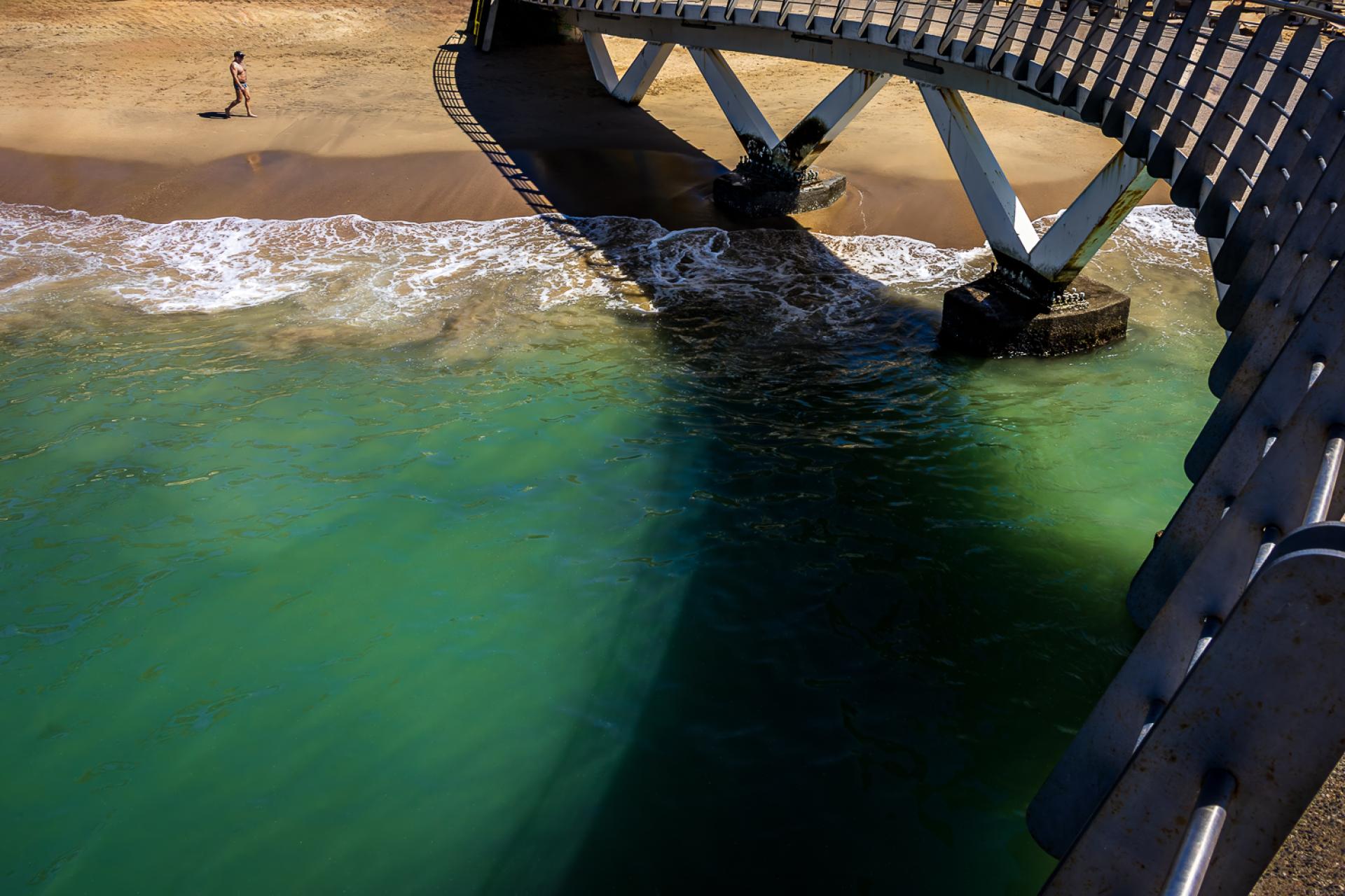 The iconic pier on Playa Los Muertos in Puerto Vallarta, presents a study in contrasts and connections. This photograph was conceived as an more abstract interpretation of a popular travel destination, aiming to transcend literal representation and evoke a deeper emotional and contemplative response. The choice of framing and perspective from the Playa Los Muertos pier was deliberate, intended to flatten the scene and emphasize its abstract qualities. The composition is built around the powerful curve of the pier, which acts as a dividing line between contrasting elements: light and shadow, land and sea, solitude and structure.
