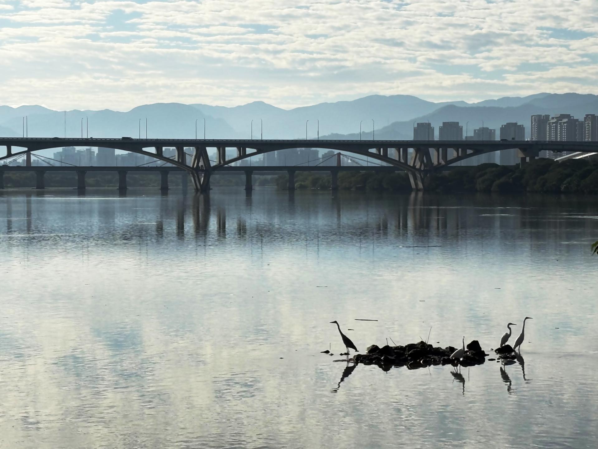 Captured at the intersection of human engineering and natural tranquility, this image transforms a routine riverbank scene into a timeless visual poem. Freed from industrial clutter and bathed in an ethereal, monochromatic blue-black palette, the clean lines of the bridge and the delicate forms of the three egrets are distillations of form and feeling. By emphasizing reflection and stillness, this composition invites the viewer to experience the profound silence of a city awakening.