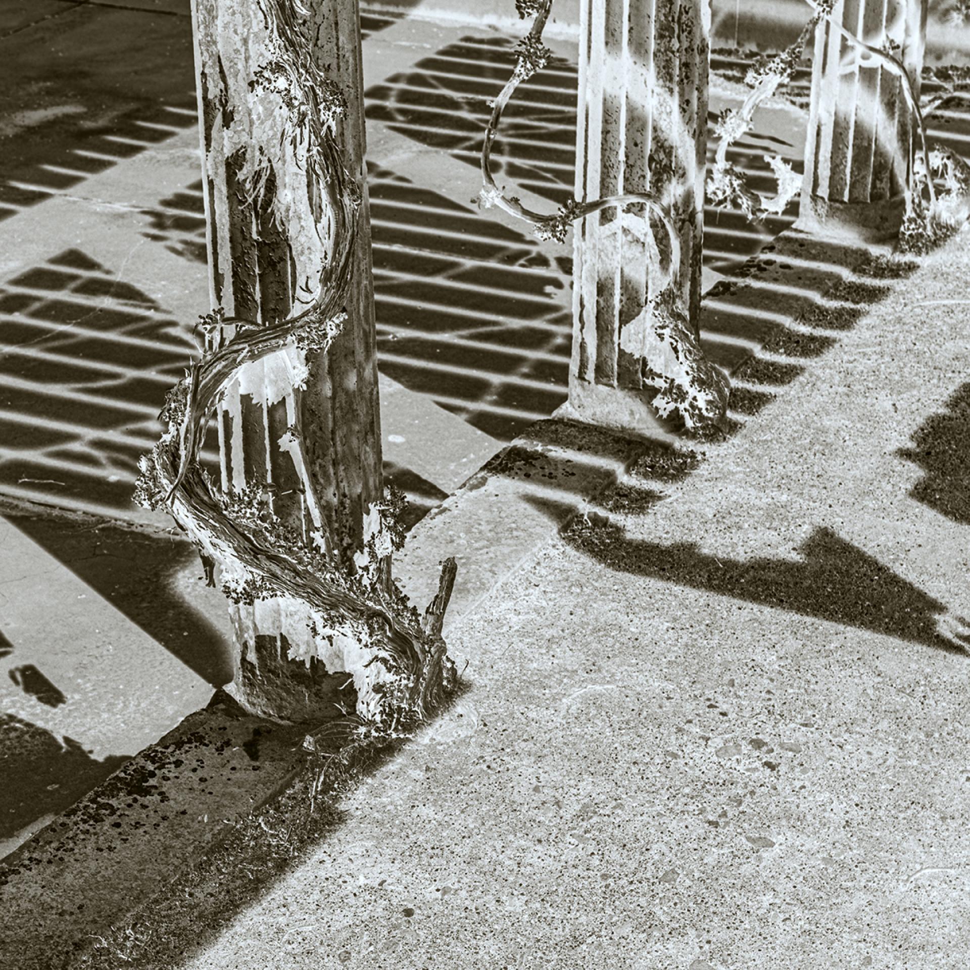 The title encapsulates this double movement. “Tendrils” evokes the creeping, organic life of the garden, while “reversed light” names the work’s decisive transformation. The photograph does not simply depict architecture; it visualises a condition where built order and organic pattern converge. The strict verticals of the columns are intersected by dark, rhythmic intervals, causing the structure to resemble a trellis or a framework for growth. This creates a constant oscillation between severity and delicacy, construction and vegetal suggestion.