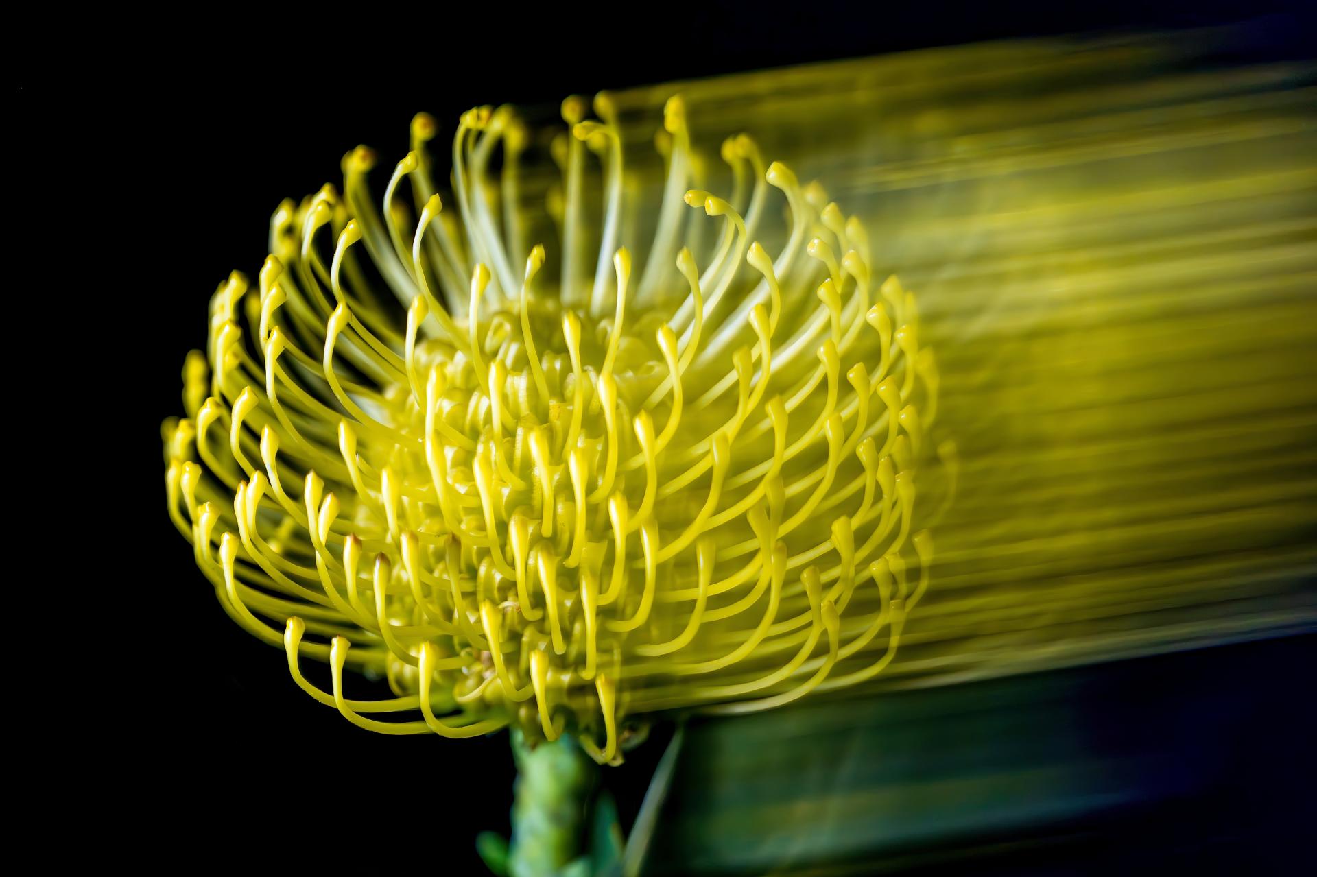 This was shot on a black, foam board. The motion is the result of the curvature properties of the CineFlow Lens Filter. It is a concave, thick lens that gives a special look to this Pincushion Flower.
