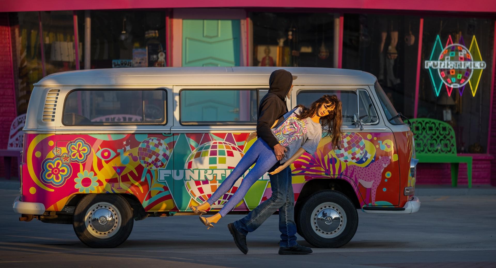 A man taking a leisurely stroll down Main Street with his mannequin.