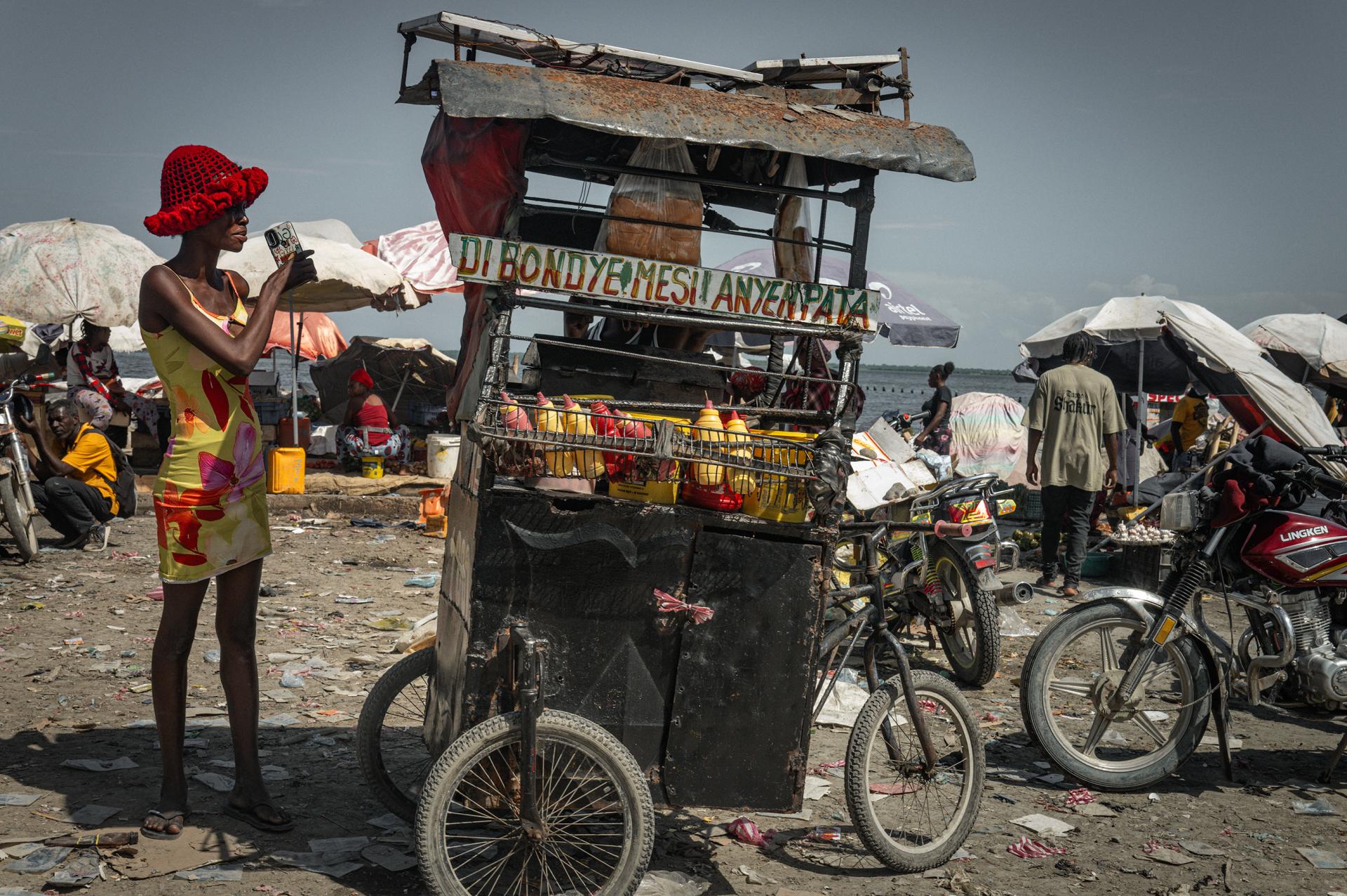 Thousands of Haitians have fled their homes in Port-au-Prince up to the north in Cap-Haitien following the gang violence. The street vendors try to make some money for living, being homeless and sleeping at the sea side in makeshift shelters. That woman shows perfectly matching colors with her mobile shop.