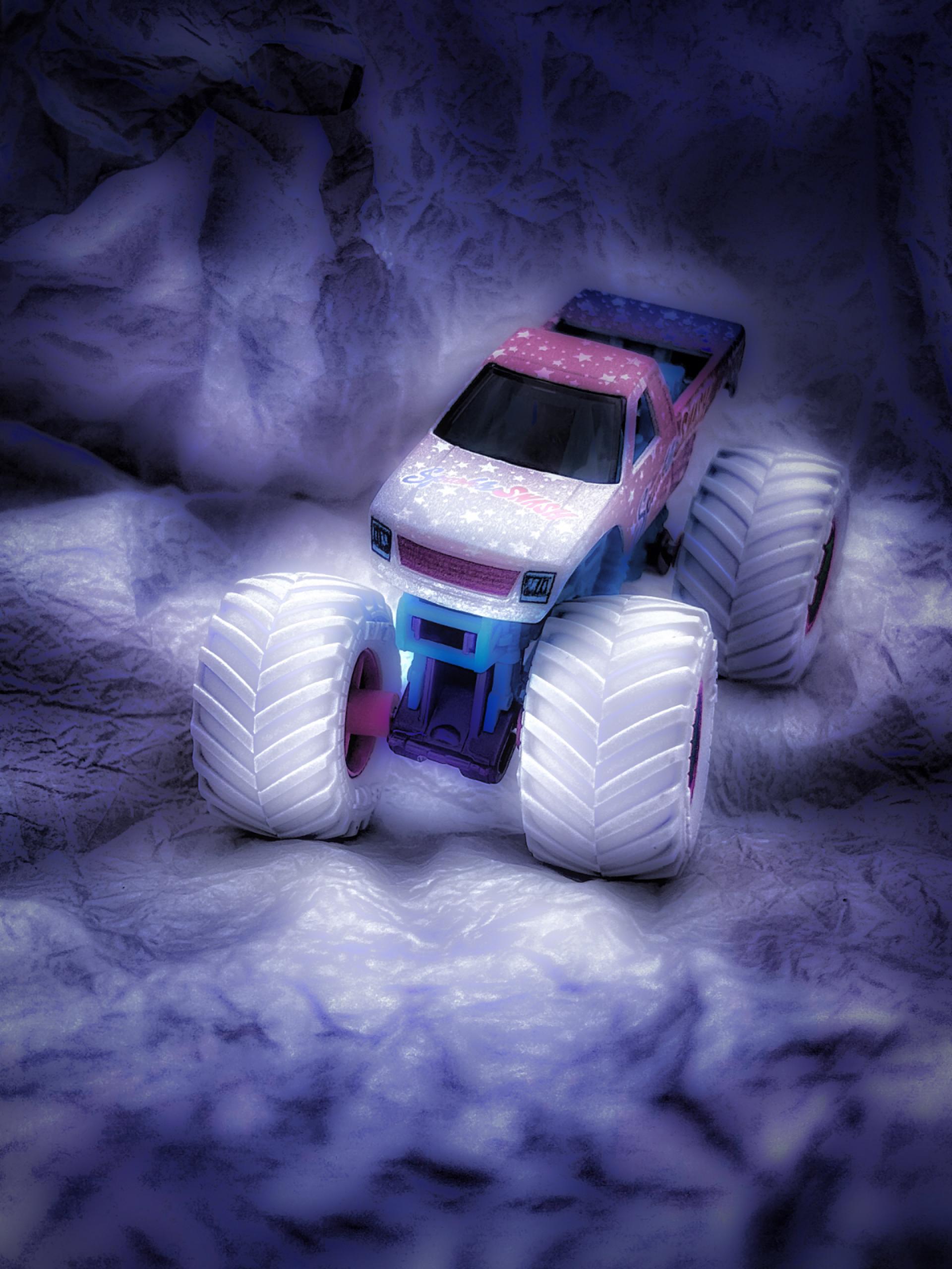This image transforms an ordinary toy monster truck into a cinematic subject suspended between reality and imagination. Through light, texture, and perspective, the small-scale object becomes a powerful, almost mythical presence.