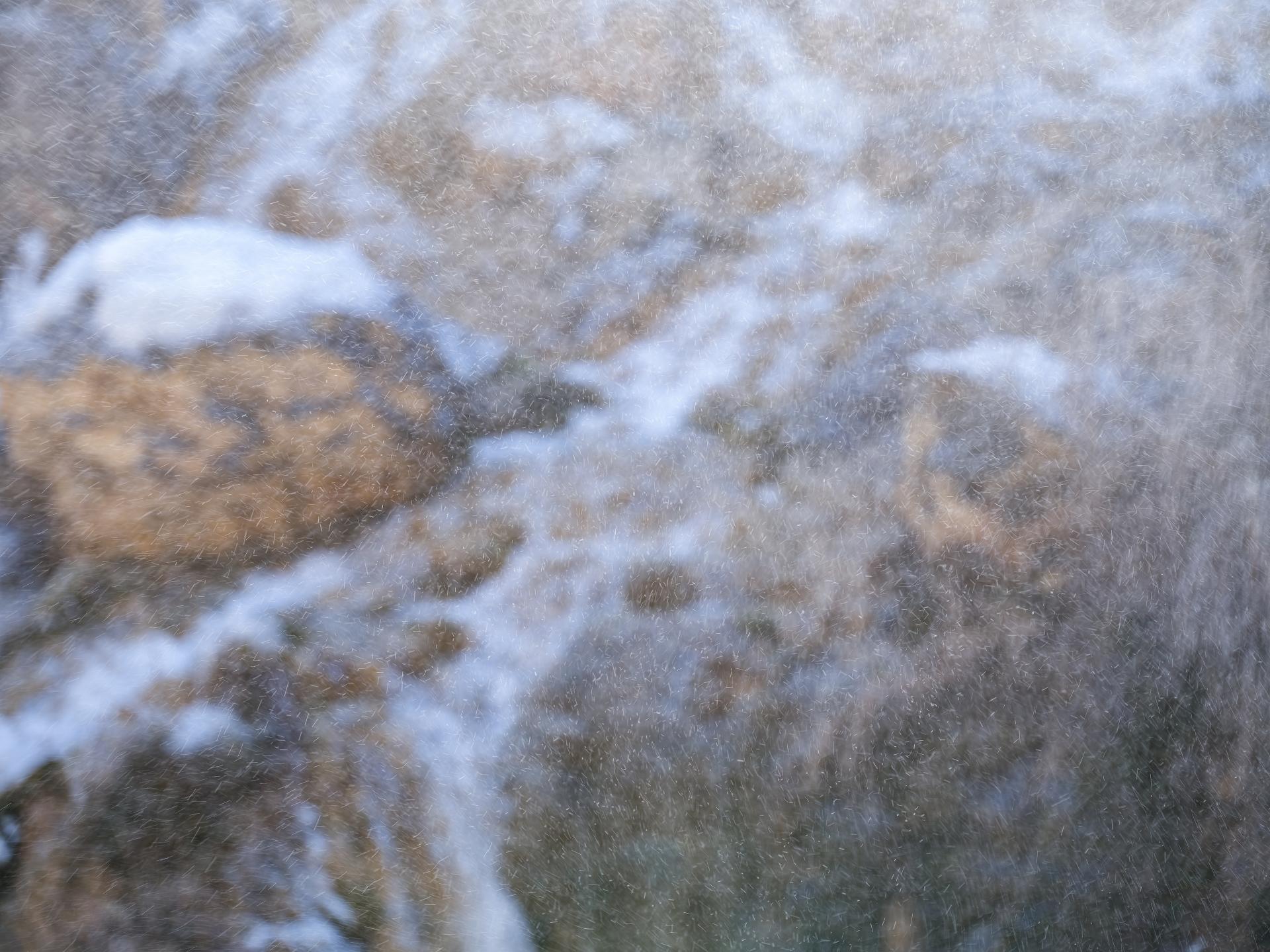 Breath captures airborne droplets suspended mid-flight before ochre rocks marked by traces of melting snow. Isolated from their source, these minute forms reveal delicate trajectories that evoke the rhythm of breathing. By reducing the scene to its essential