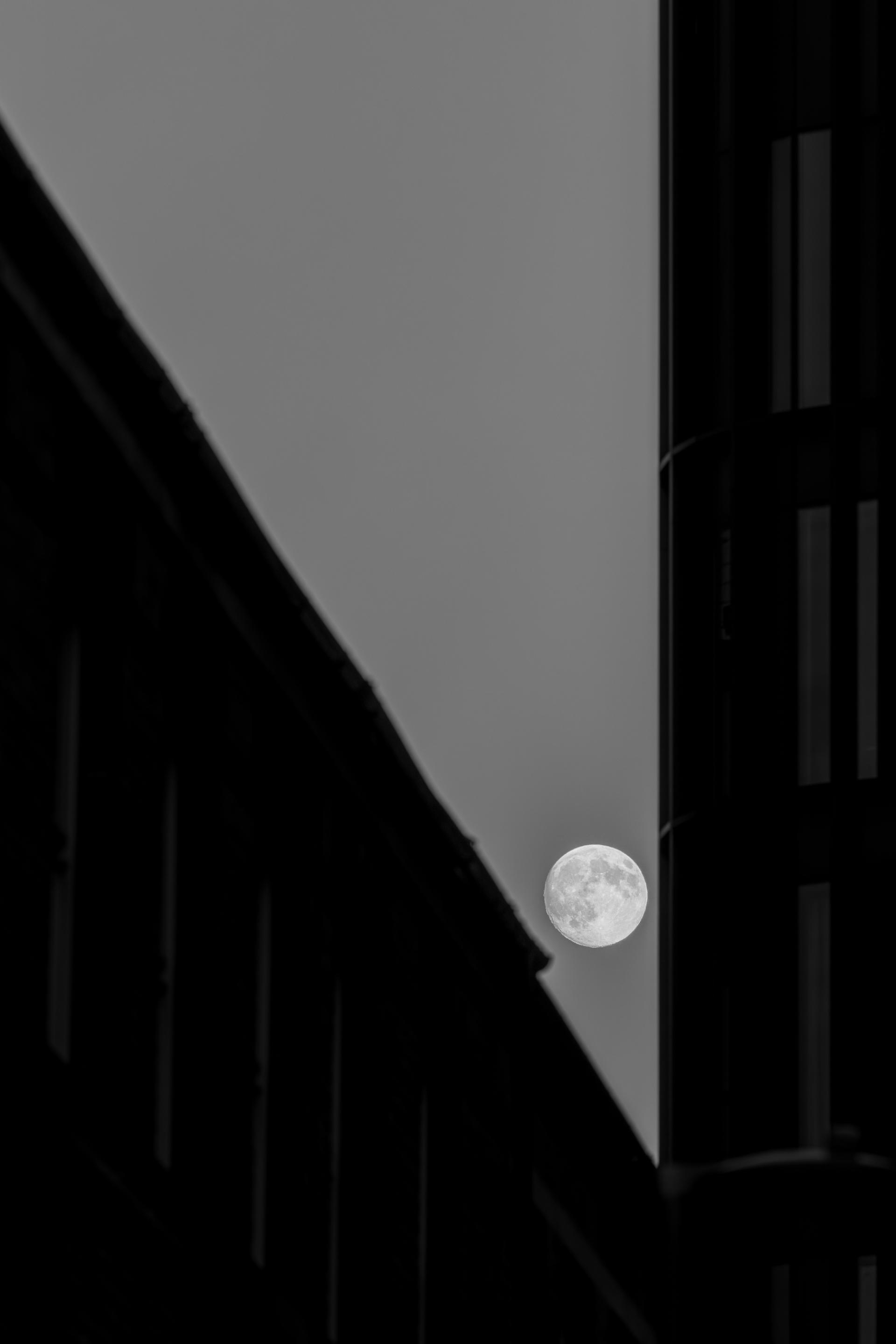 At dusk, I was weaving through the busy city streets, surrounded by towering, geometrically striking modern buildings. I glanced up casually and was struck by the scene before me. In that narrow rift of sky, squeezed by the structures on both sides, a bright, full moon was quietly emerging. The sharp edges and hard materials of the buildings unintentionally created a perfect geometric negative space frame for the soft moon. At that moment, the city's hustle seemed to fade away, leaving only a silent dialogue between the rigid man-made structures and the eternal celestial body.