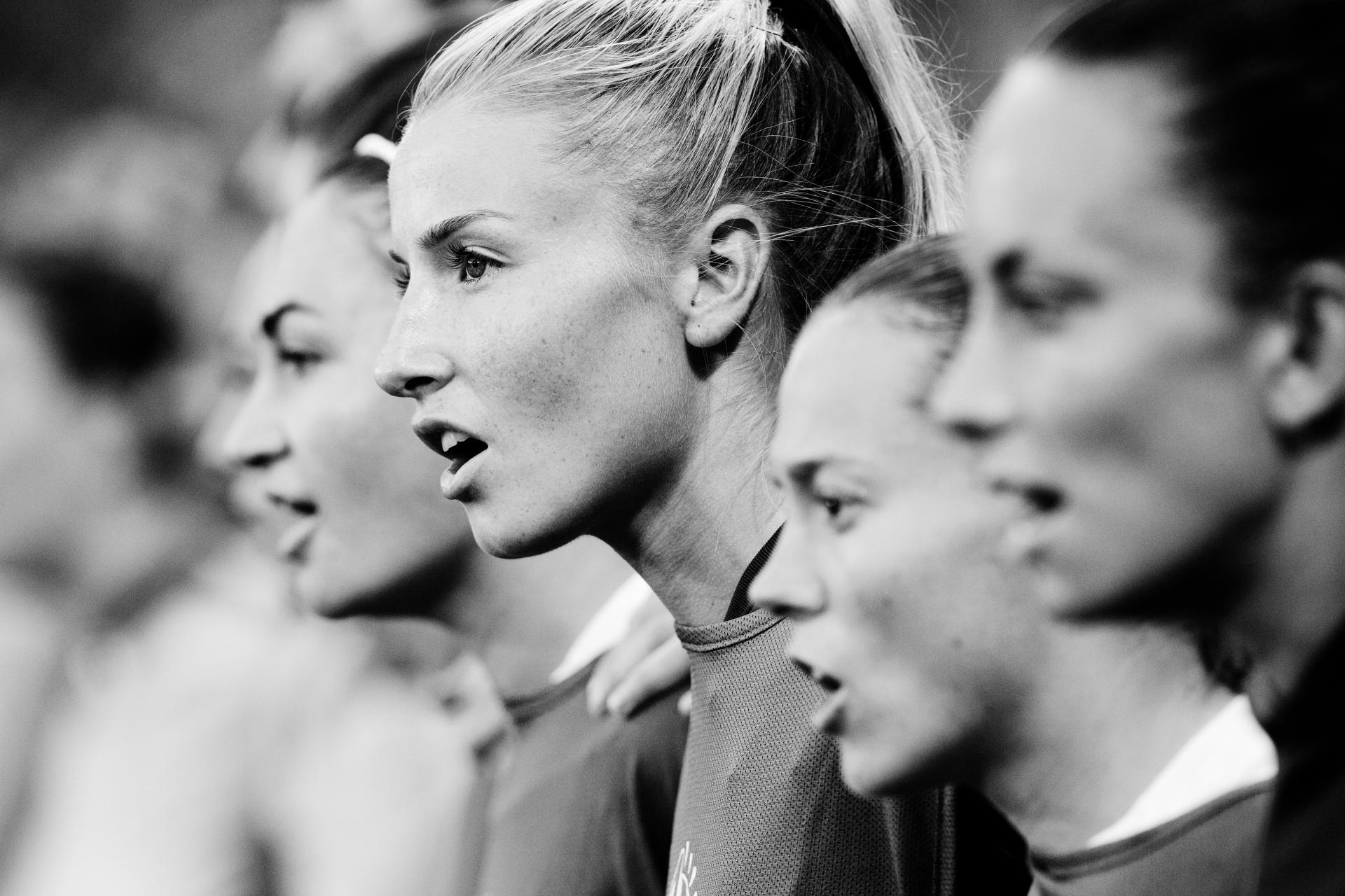 This photo of the famous English football player Leah Williamson was taken during the World Cup, with the players standing side by side to sing their respective anthems.