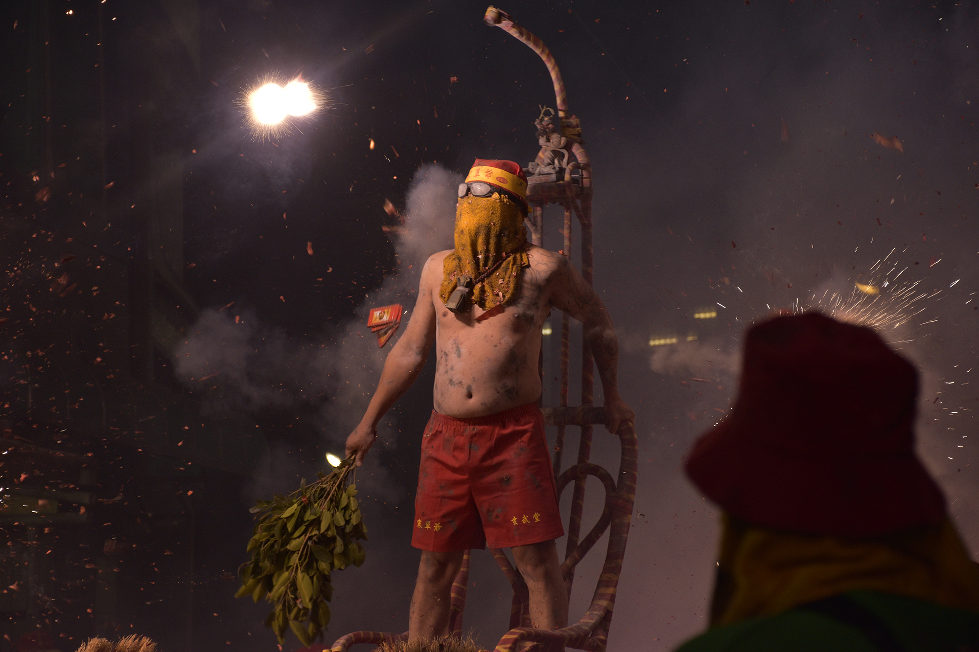 This is a very special ceremony in Taitung, Taiwan. It is generally believed that the Lord of Handan is the God of Wealth. Someone will be selected to play the role of Lord Handan. The man was wearing only a pair of red shorts and covered his face with a towel. He holds a branch in his hand to protect himself. He would then be carried on a sedan chair and firecrackers would be thrown at his naked body.