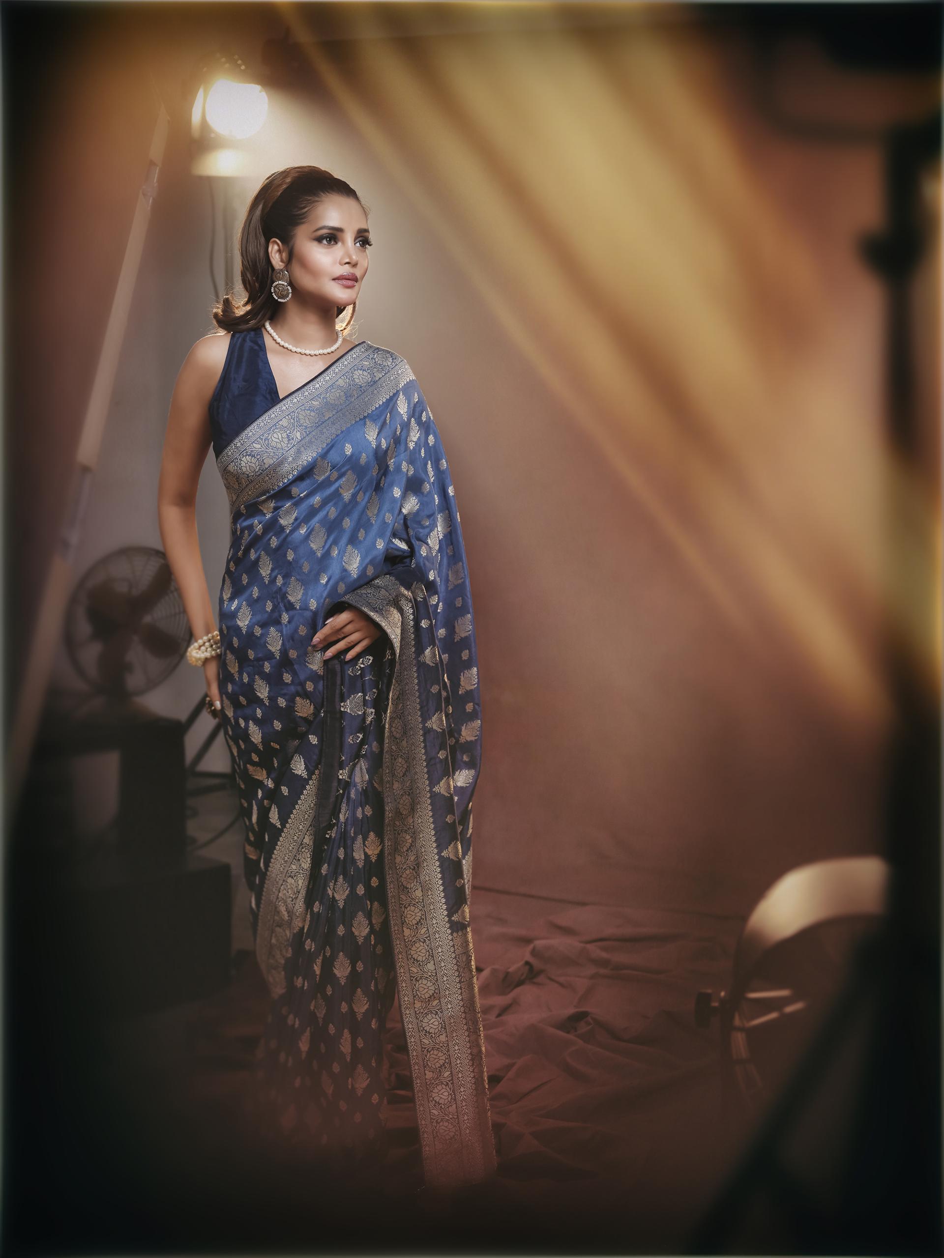 She stands bathed in golden beams, poised yet contemplative, an artist caught in the quiet moment before stepping into character. The studio lights carve gentle highlights across her saree, revealing textures of tradition against a backdrop of cinematic craft. The set around her remains visible: equipment, shadows, and the hum of preparation. Nothing is hidden. She is in the middle of transformation, suspended between who she is and who she is about to portray. This portrait celebrates the silent dignity of creation, the art of becoming through light, presence, and stillness.