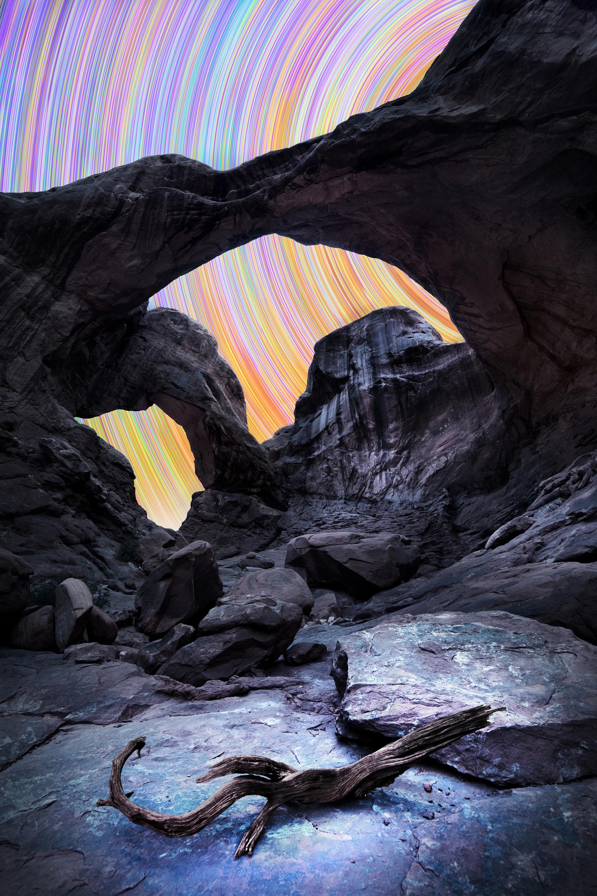 “Gateway to the Stars” is captured from over 600 twenty five second long exposures, five different programs and over a 3 months to plan/develop as well as a couple weeks alone to process and refine the resulting photograph with test prints. The colorful vibrant circles and arcs come from the stars subtle intrinsic colors, thin cloud movements and even air quality. Too many clouds, however, can ruin the entire night.