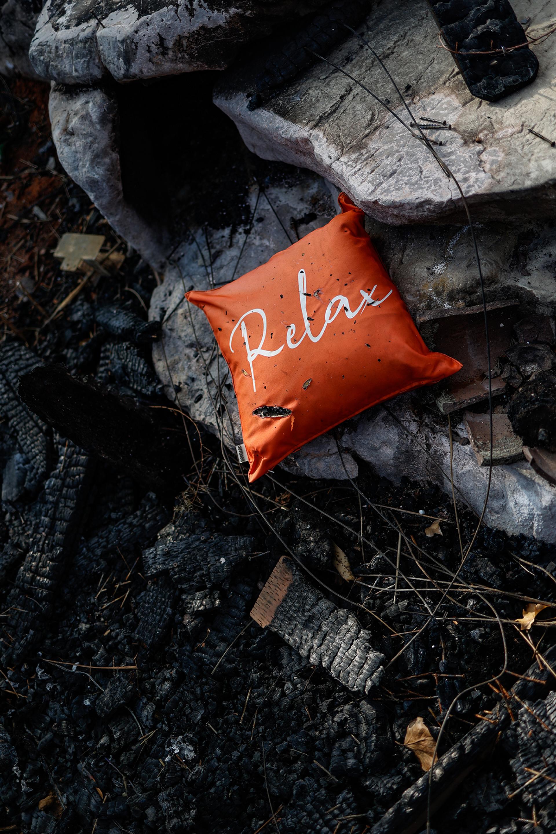 Last year, people close to me lost their homes in the Malibu fire. Once the flames were finally contained, weeks passed before anyone could return. When the roads reopened, I went with my family to help them search through what was left before it was all cleared away. The scene was both overwhelming and deeply emotional. We had celebrated Christmas there together not so long before, and now everything that had once been warm and full of love was gone. But one detail stood out: a lawn cushion, almost untouched, resting on the remains of the pool deck. It bore a single word—Relax.