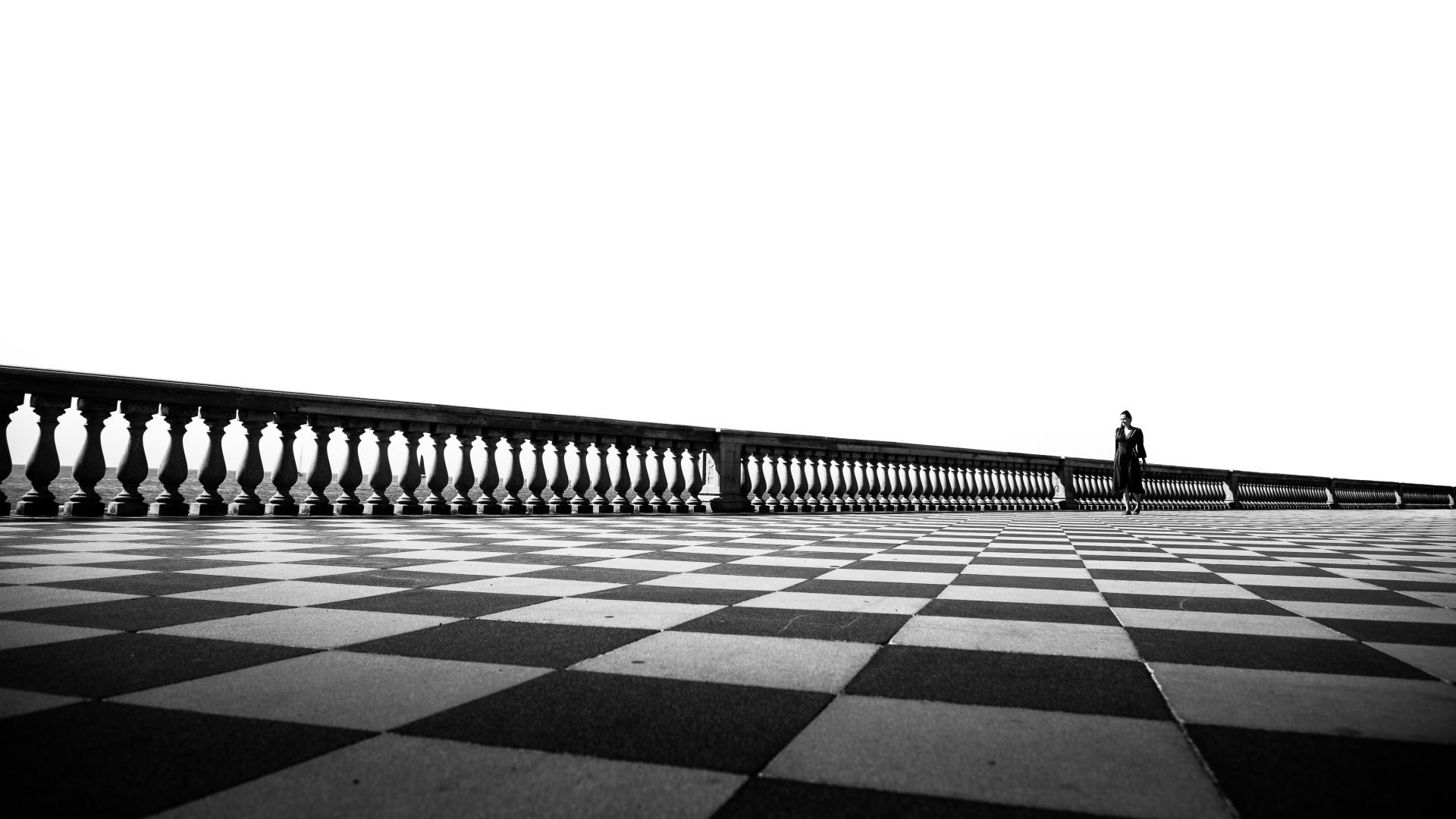 Clean geometry and repetition at the seafront promenade. The checkerboard pattern and long perspective create a bold, graphic composition—minimal, modern, and perfectly balanced.