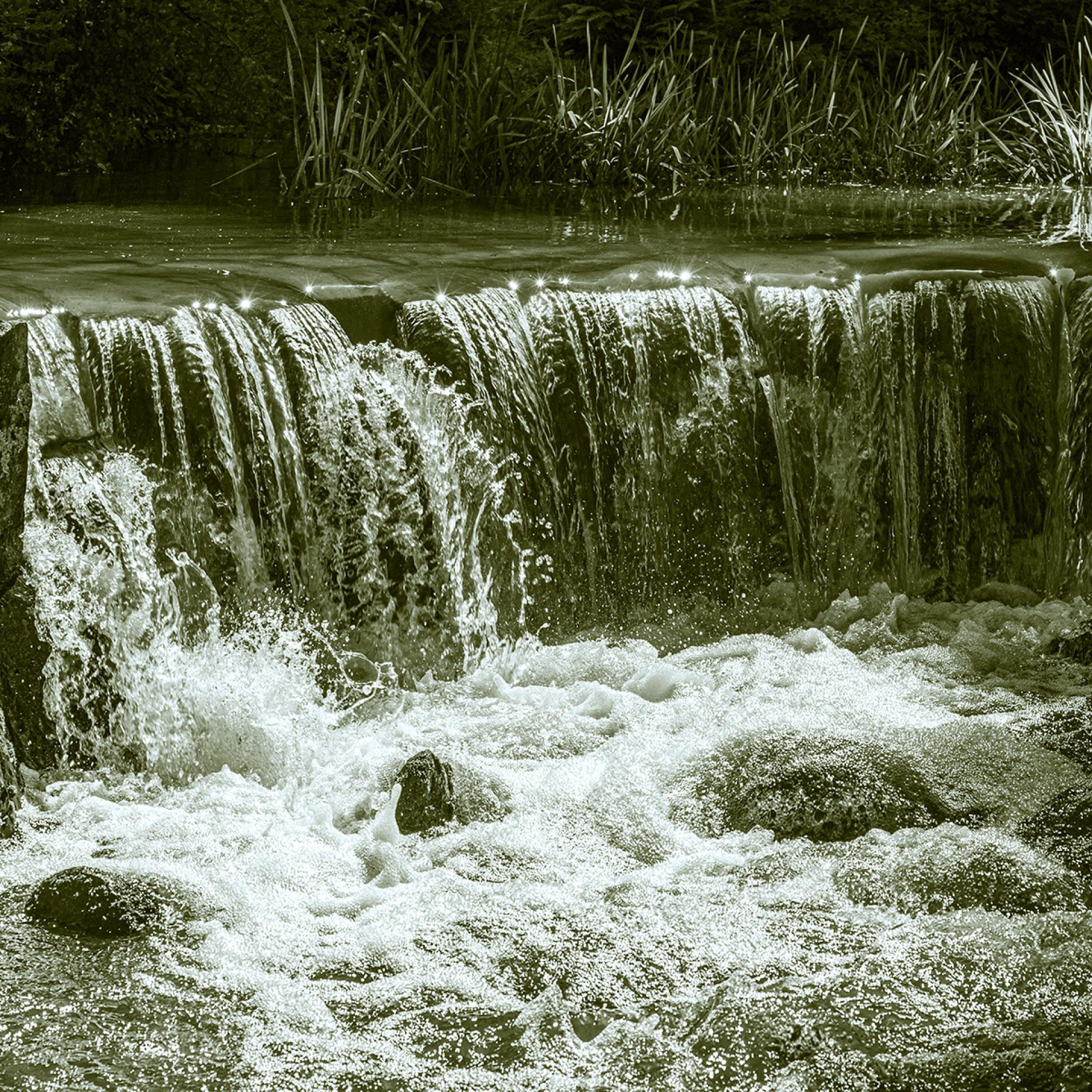 Rather than depicting a “waterfall”, the work frames a threshold: a brief drop where water loses its shape only to reclaim it moments later. Above, it glides as a calm plane, catching points of light along the lip; then it tips and breaks into threads, eddies and foam. Below, it becomes a bright, restless field, each droplet seeming to carry its own impulse—an elemental choreography. The vivid green is not merely toning but assimilation: the stream absorbs bank plants, shadow and damp air, pulling its surroundings into the flow. Nature is not backdrop here; it enters the current as colour, atmosphere, and response.