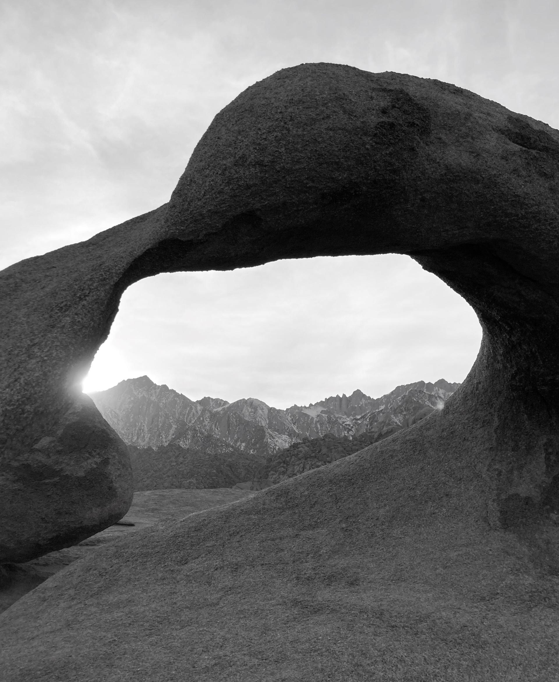 The natural architecture of the Alabama Hills in California is seen in this wind and water created rock arch. Beyond the arch you can see a partially snow covered Mount Whitney framed in the arch as the sun sets.