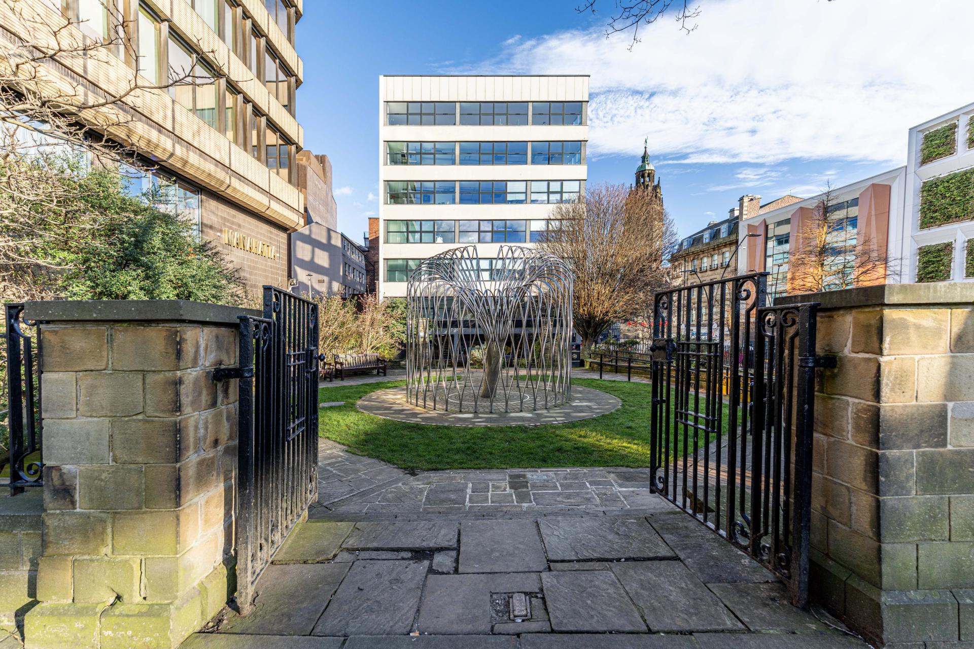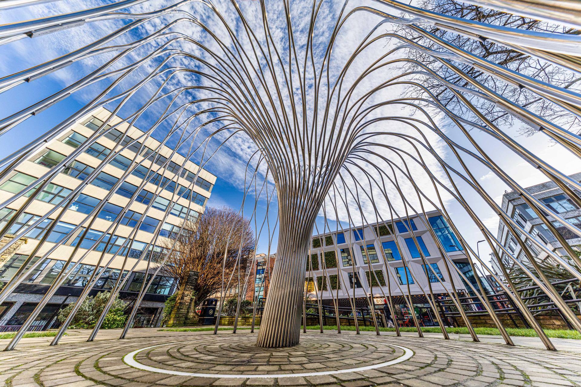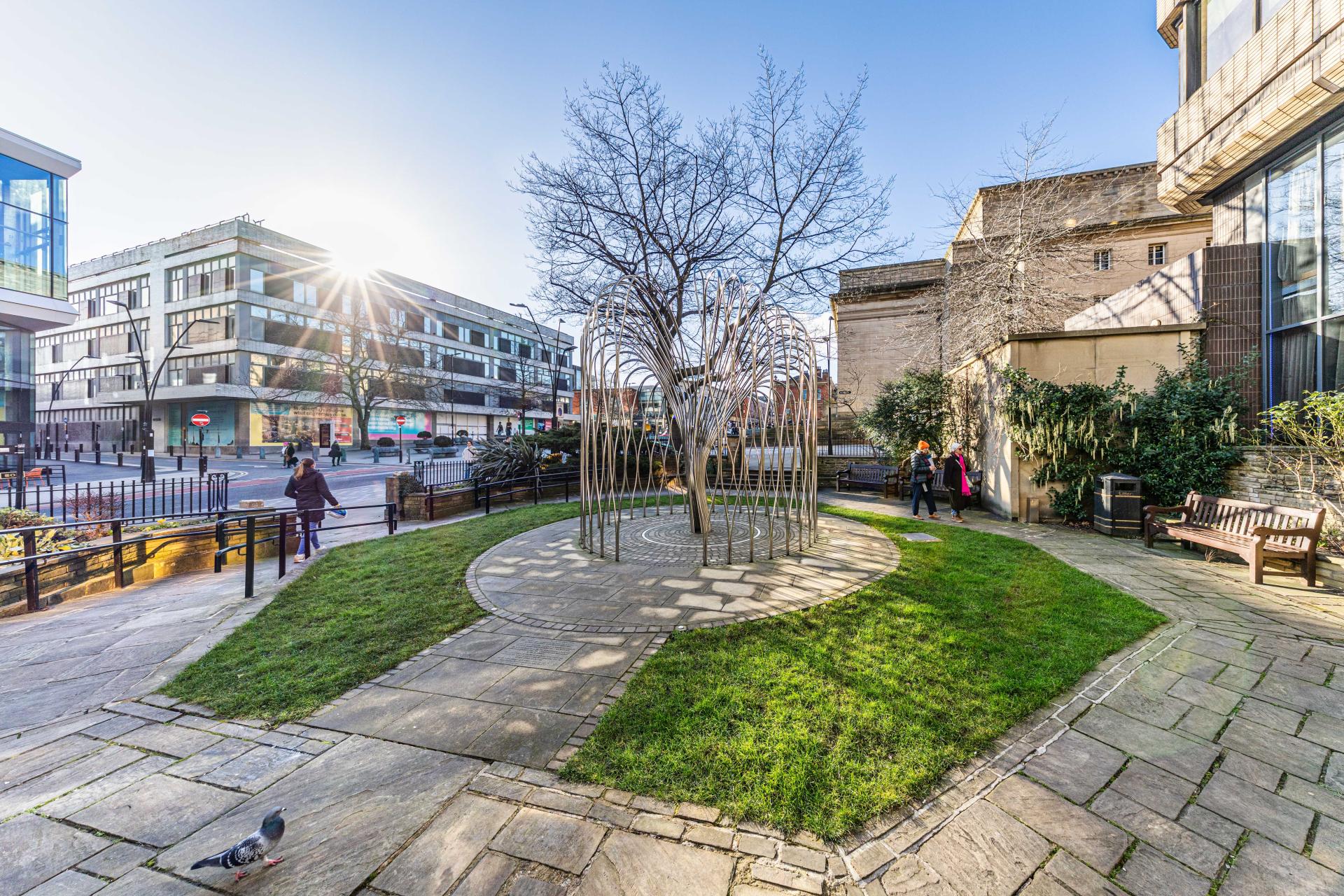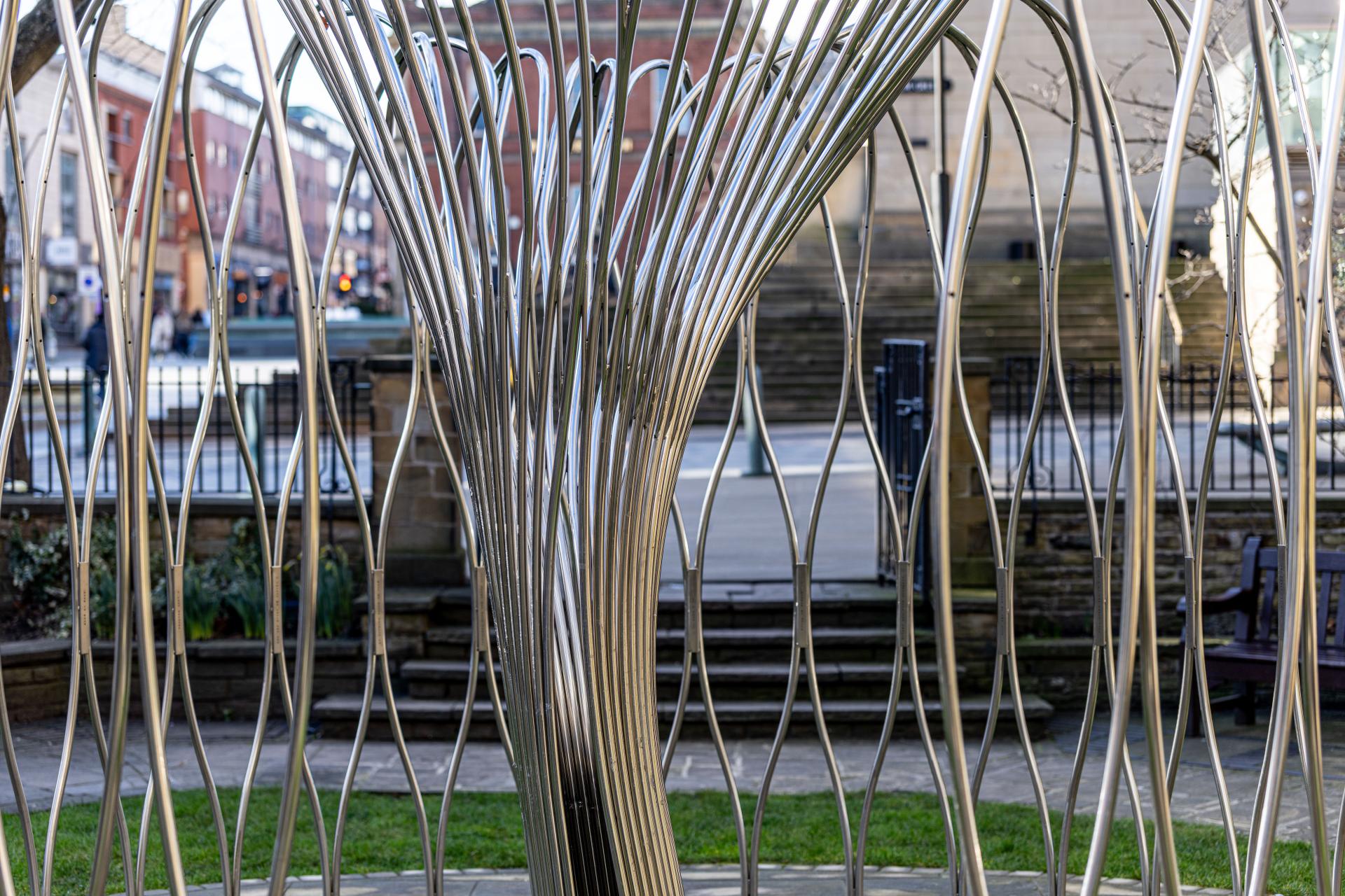 This sculpture, standing in Balm Green Gardens, Sheffield, serves as a powerful memorial to the COVID-19 pandemic. Its upward-reaching steel rods, surrounding a tree, symbolize resilience, unity, and remembrance. The etched phrase “We Are Still Here” reminds us of the lives lost, the strength of communities, and our continued presence in a changed world.