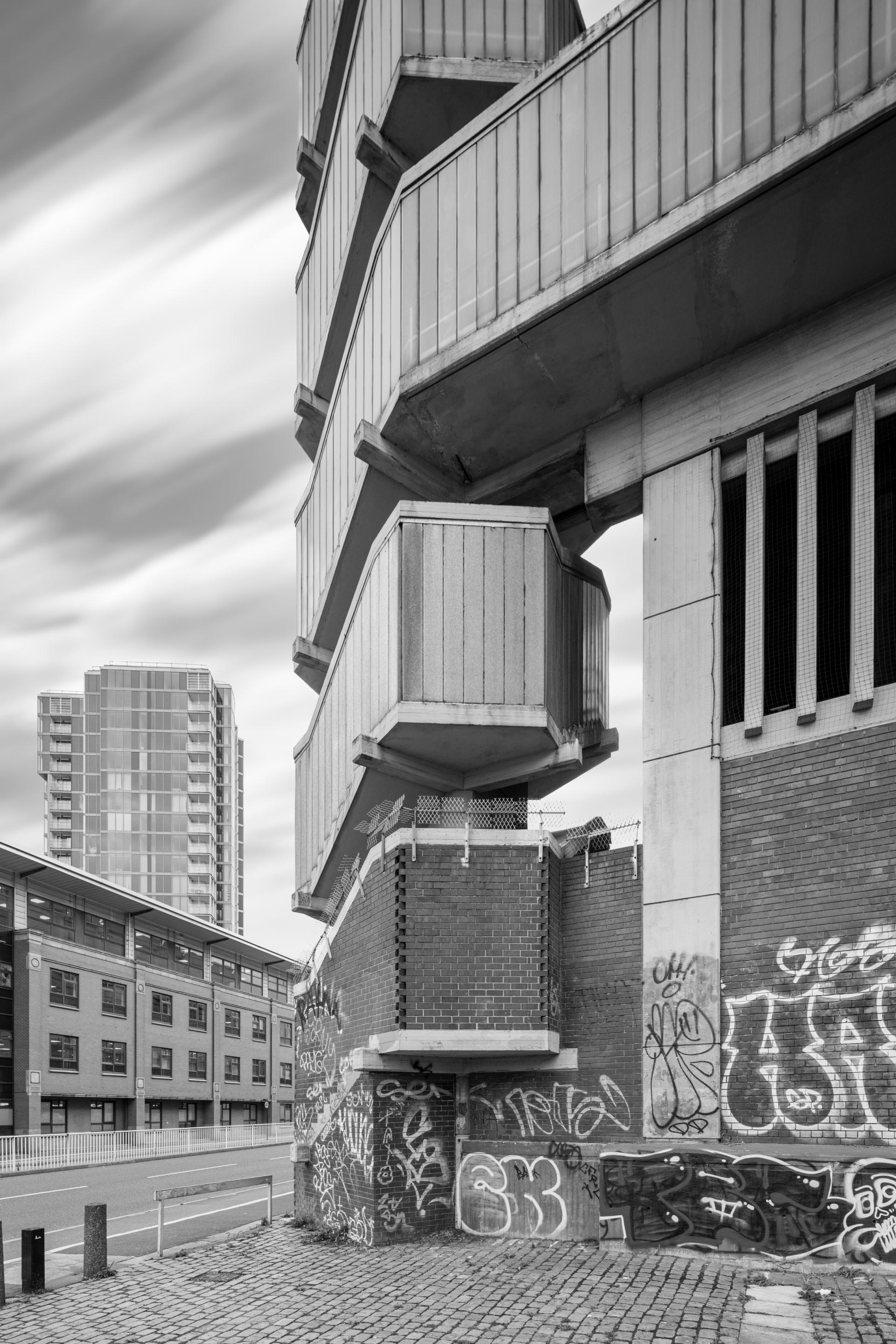 Timelines of Concrete documents these structures through photography, seeing them not only as visual forms but also as vessels that hold the passage of urban time. Their exposed concrete, weathered marks, and sharp geometric lines record the rise of ideals, their decline, and the city’s continuous process of renewal. Through long-exposure photography, I allow the sky to move while the buildings remain still. The drifting sky and the settled concrete reveal two different speeds of time that coexist within a single frame. Although Brutalism is often viewed as cold or oppressive, the camera reveals a restrained sense of poetry within it. Cantilevered volumes appear to float against logic, stair towers rise like sculptural forms, and the textures on their surfaces carry decades of weather, use, and abandonment. Each structure becomes a living relic, holding traces of those who built it, lived with it, and eventually forgot it.