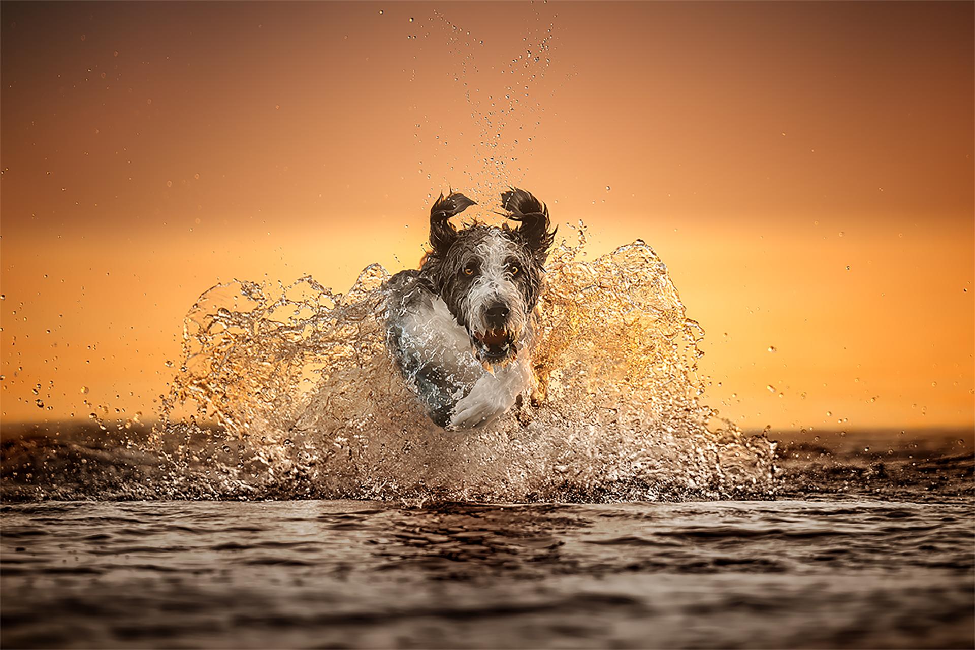 At sunrise, when the world hovers between stillness and motion, I stepped into the water as the first light broke across the horizon. The surface, once calm and reflective, erupted into a cascade of splashes — frozen midair like shards of liquid glass. Each droplet caught the golden light, transforming a fleeting movement into something luminous and almost weightless.