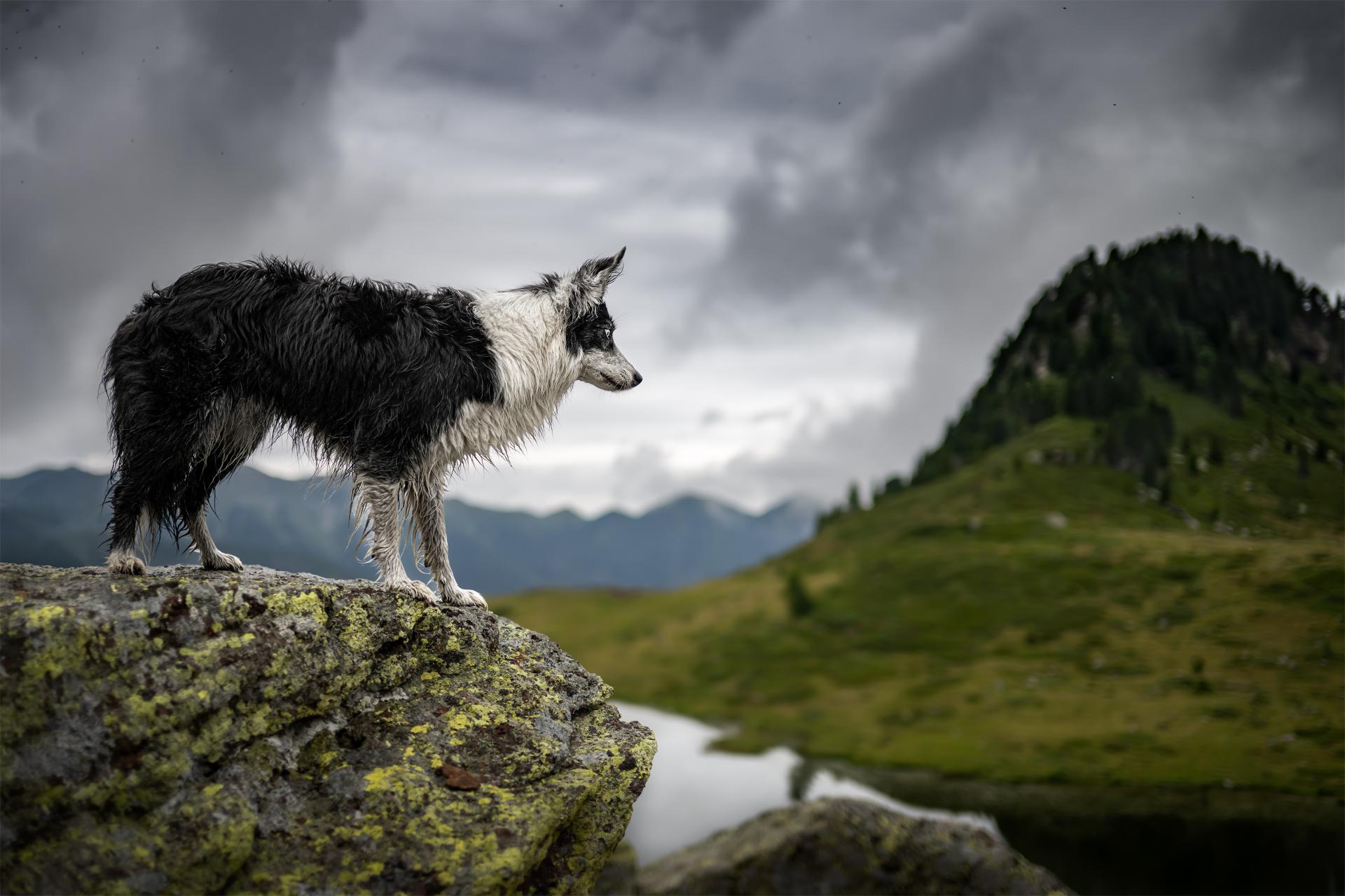 High in the Dolomites, beneath a sky heavy with rain and mist, a solitary dog stands at the edge of a cliff. The landscape dissolves into layers of shadow and cloud, where jagged peaks fade into obscurity. The mood is raw and elemental — wind, rain, and altitude shaping both the environment and the moment.