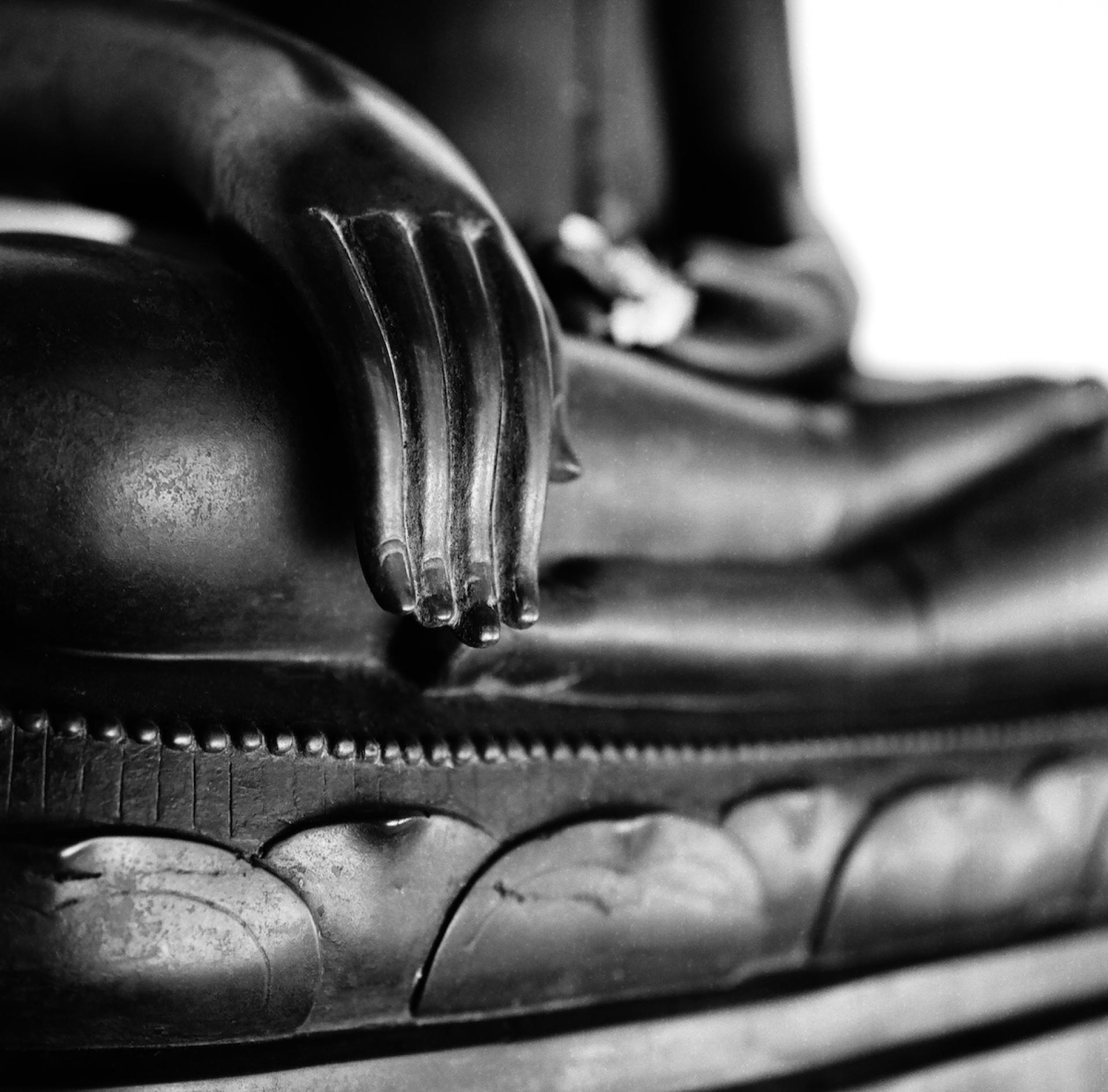 Detail of Buddha sculpture at the Wat Benchamabophit temple in Thailand. The Buddha's hand is shown in the 'Touching the Earth' mudra, calling upon the Earth to witness his awakening, according to Buddhist teachings.