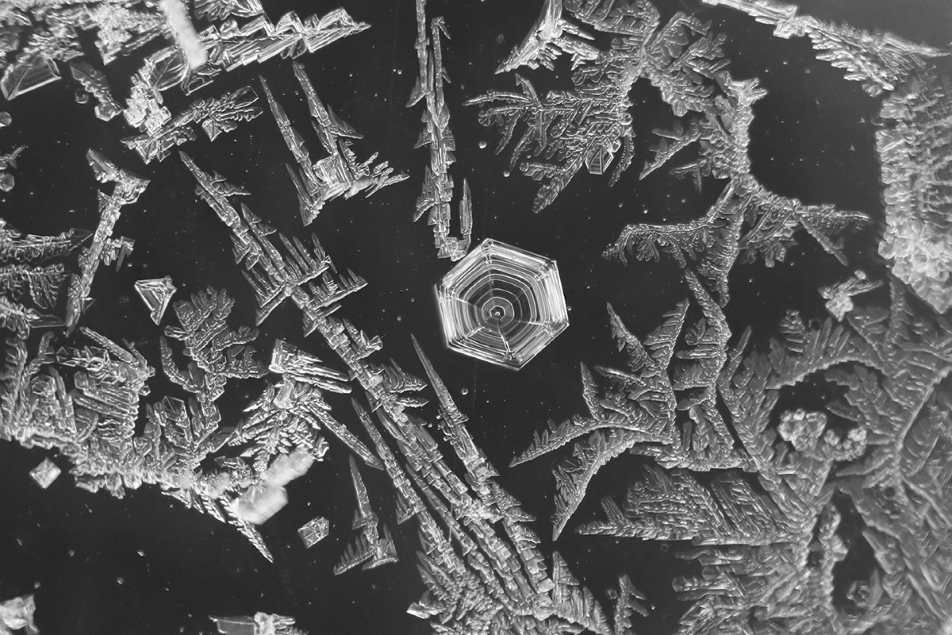 Frost has a way of creating designs that are absolutely magnificent to view up close. The way the ice crystals turn and build upon one another almost makes it look as if lace covered the windows. This frosty morning even gave way to some frosty snowflakes that grew in between the trails of ice. Captured in Warrenton, Missouri (USA).