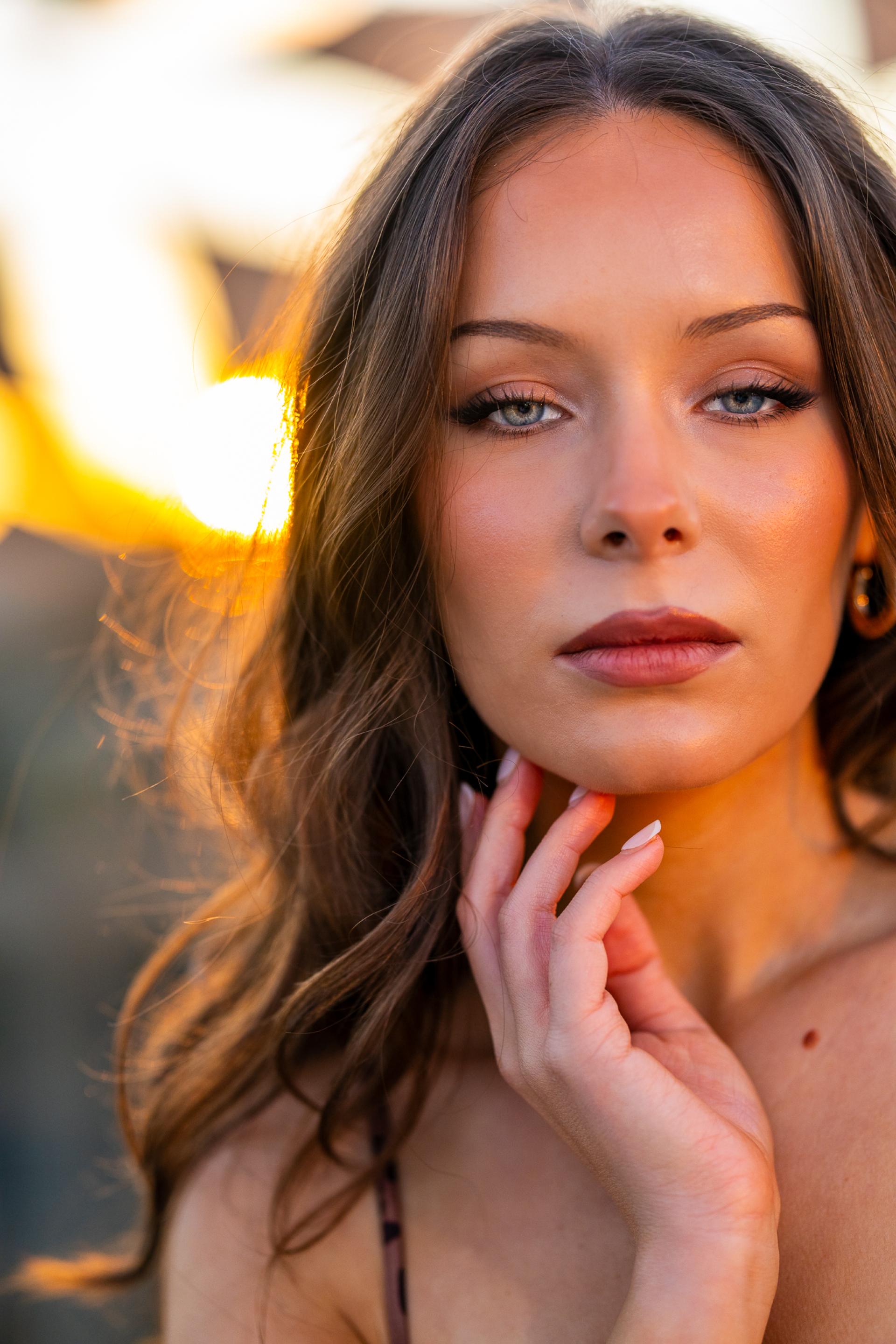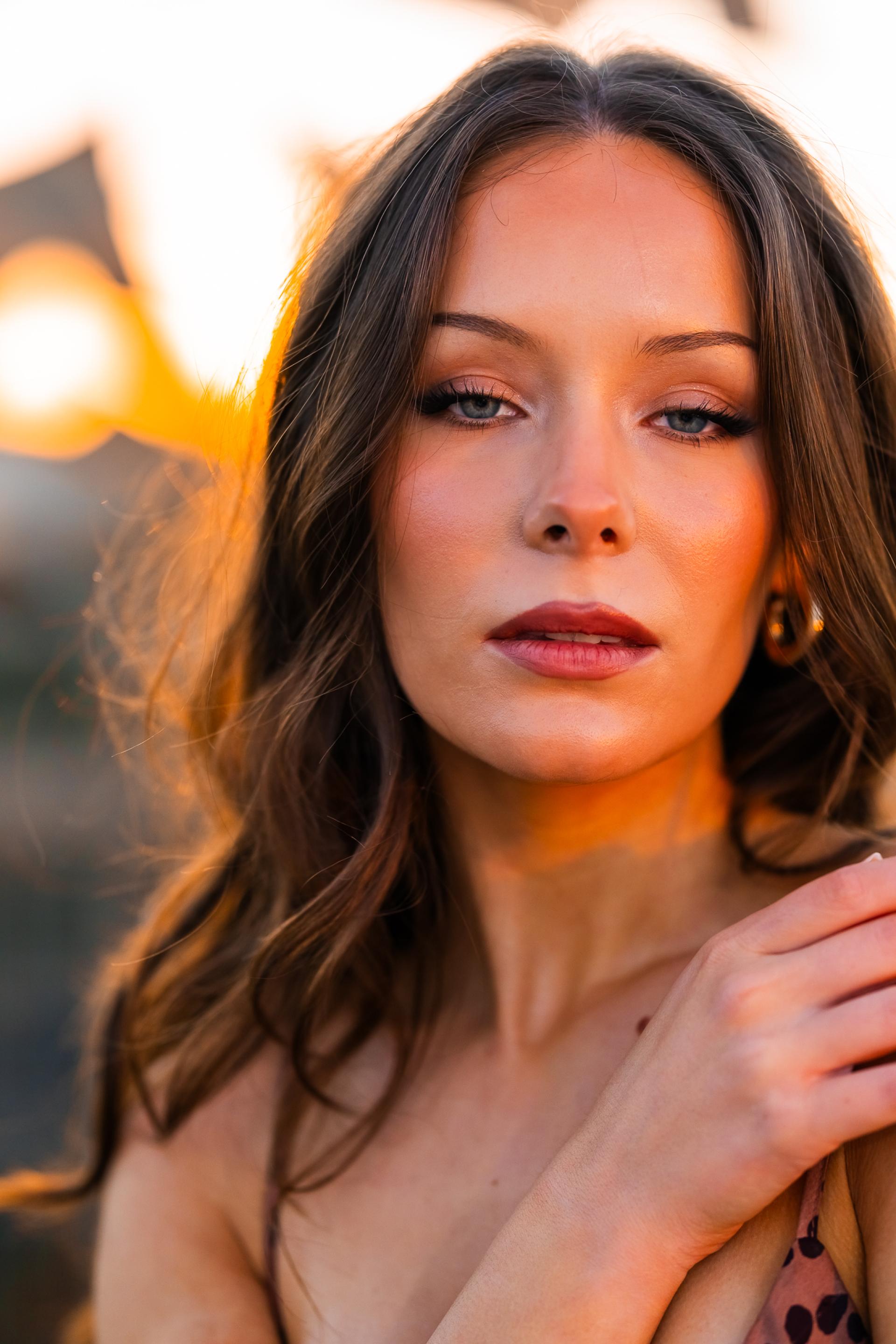 Capturing a golden hour portrait series, with the setting sun framing her with backlit highlights, an overhead pavilion providing abstract highlights in the sky, and reflected golden hour soft warm light to illuminate her features