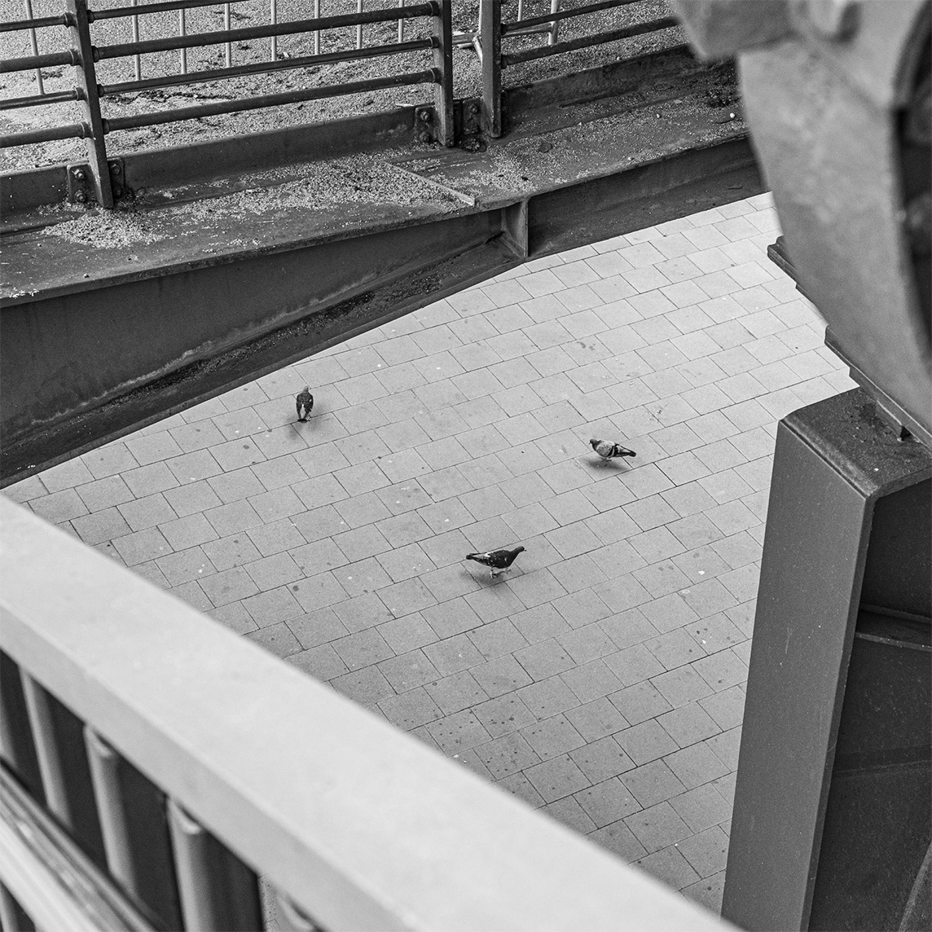 The narrative opens with "Kinetic Intervention" (Street 01), where the fluid motion of a skateboarder provides a dynamic counterpoint to the neoclassical stability of the background columns. This establishes the series' core theme: the fleeting presence of the individual within a monumental, often indifferent, setting. This theme is further explored in "Terzetto" (Street 02), a high-angle study where three pigeons occupy a paved expanse. Through the lens, these birds become rhythmic, calligraphic marks on a concrete canvas, highlighting the unexpected patterns found in everyday life.
