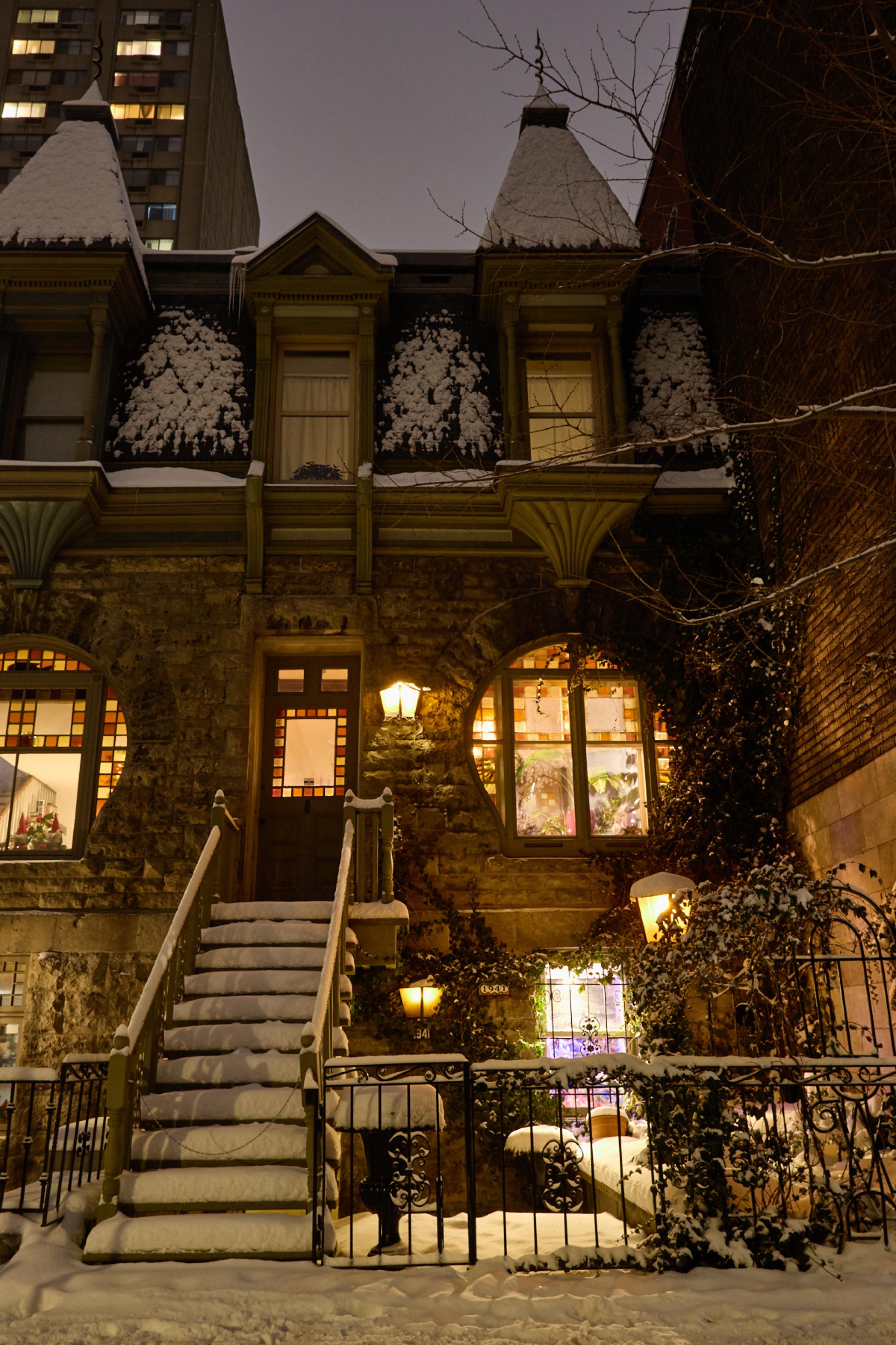 On a winter night in Montréal’s Shaughnessy Village, a historic stone residence emerges from fresh snow beneath a muted sky. Warm interior light glows through leaded panes, while porch lamps carve the façade into layered planes—arch, stair, and dormers—revealing textures of stone, slate, and woodwork. Above the roofline, the silhouette of a contemporary high-rise hovers in the background, quietly situating this intimate heritage scene within a denser, modern city.