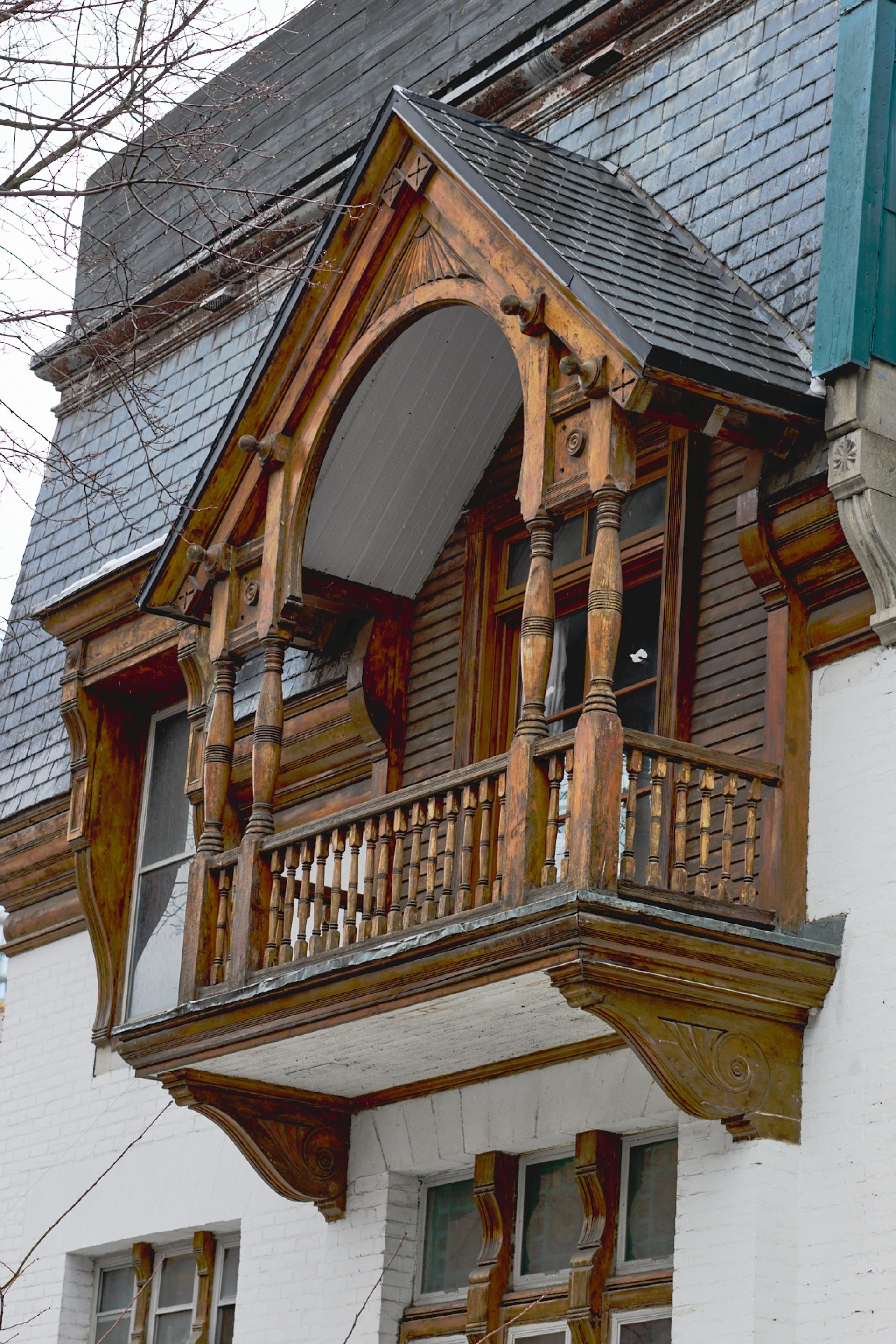 Photographed in Montréal’s Shaughnessy Village, this image focuses on a preserved upper balcony and dormer framed by a slate mansard roof. The composition isolates the craftsmanship of late-19th/early-20th-century domestic architecture—turned balusters, carved brackets, and a weathered wooden canopy—set against painted masonry and textured shingles. In soft, overcast light, the surface patina becomes legible: grain, wear, and repair reading like a record of time held in material.