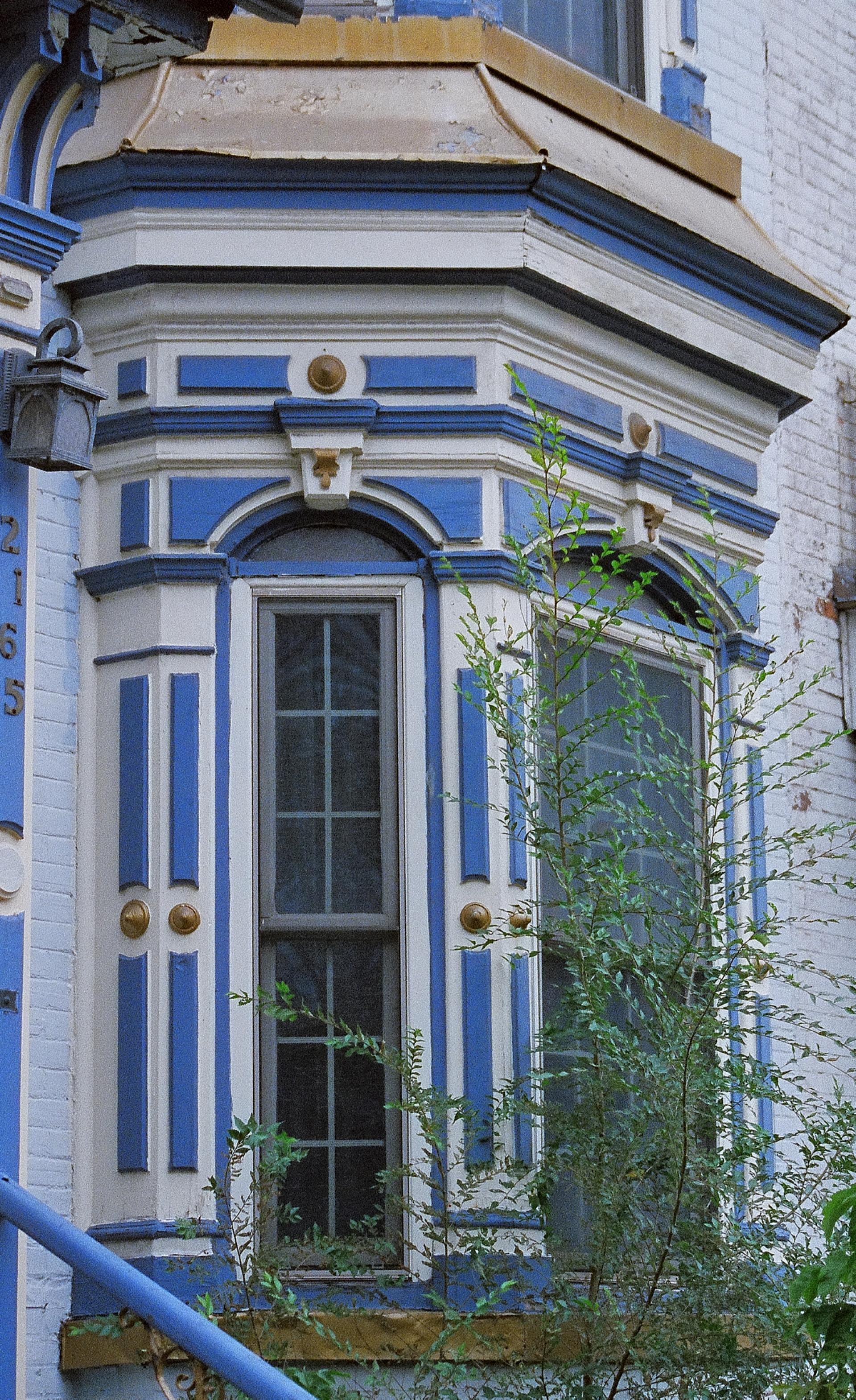 Shot on analog film in Montréal’s Pointe-Saint-Charles, this photograph isolates a façade detail: a bay window framed by painted woodwork in soft blues and creams, capped by a weathered metal roofline. The composition reduces the house to ornament, proportion, and patina—arched trim, layered mouldings, and small signs of age—partly veiled by a sprig of greenery. Film grain and the gentle tonal falloff give the scene a quiet, tactile presence, reinforcing the sense of memory embedded in surfaces.