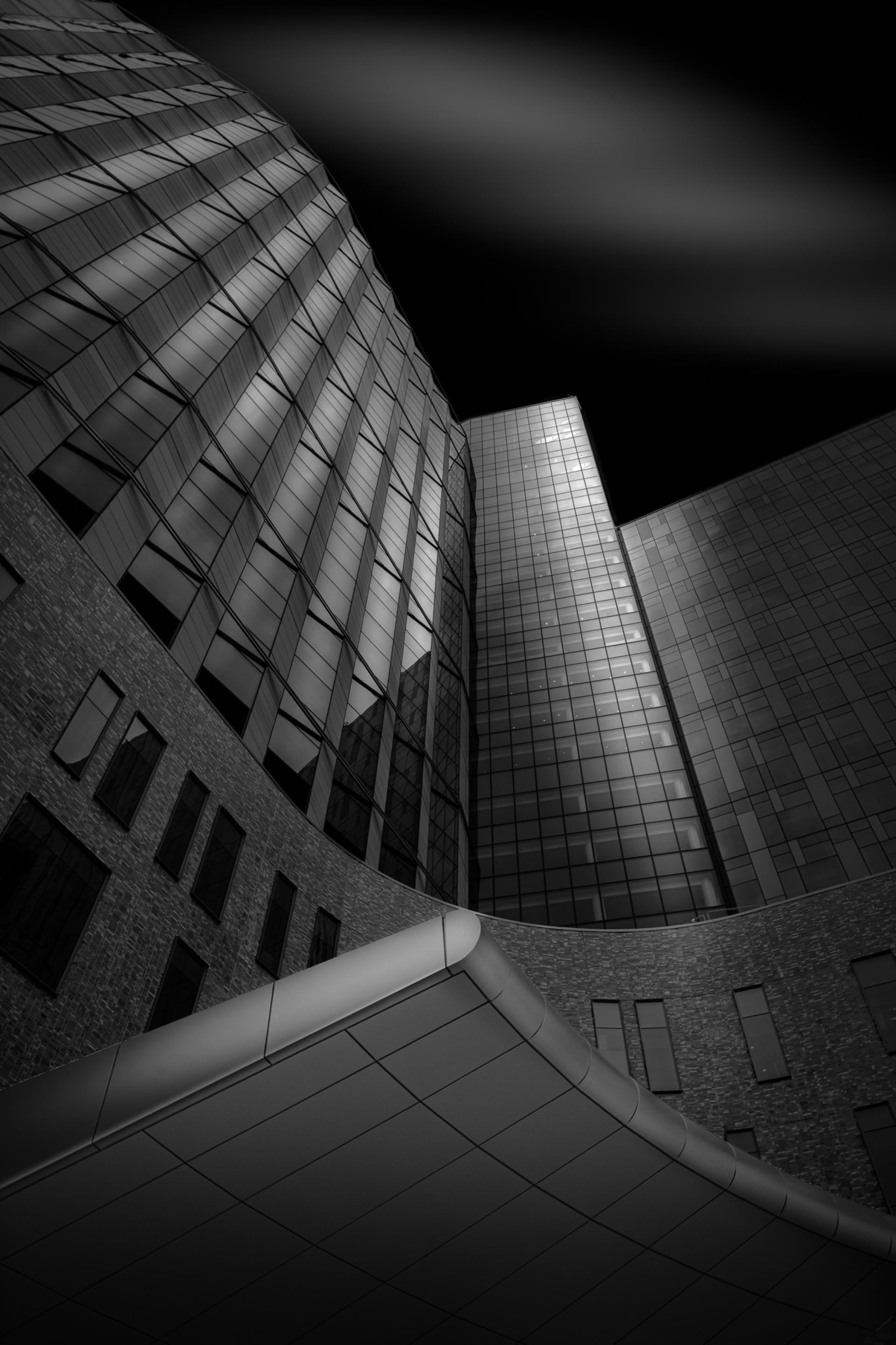 The drama of light and shadow on the front facade of the Medical Center building at The Ohio State University