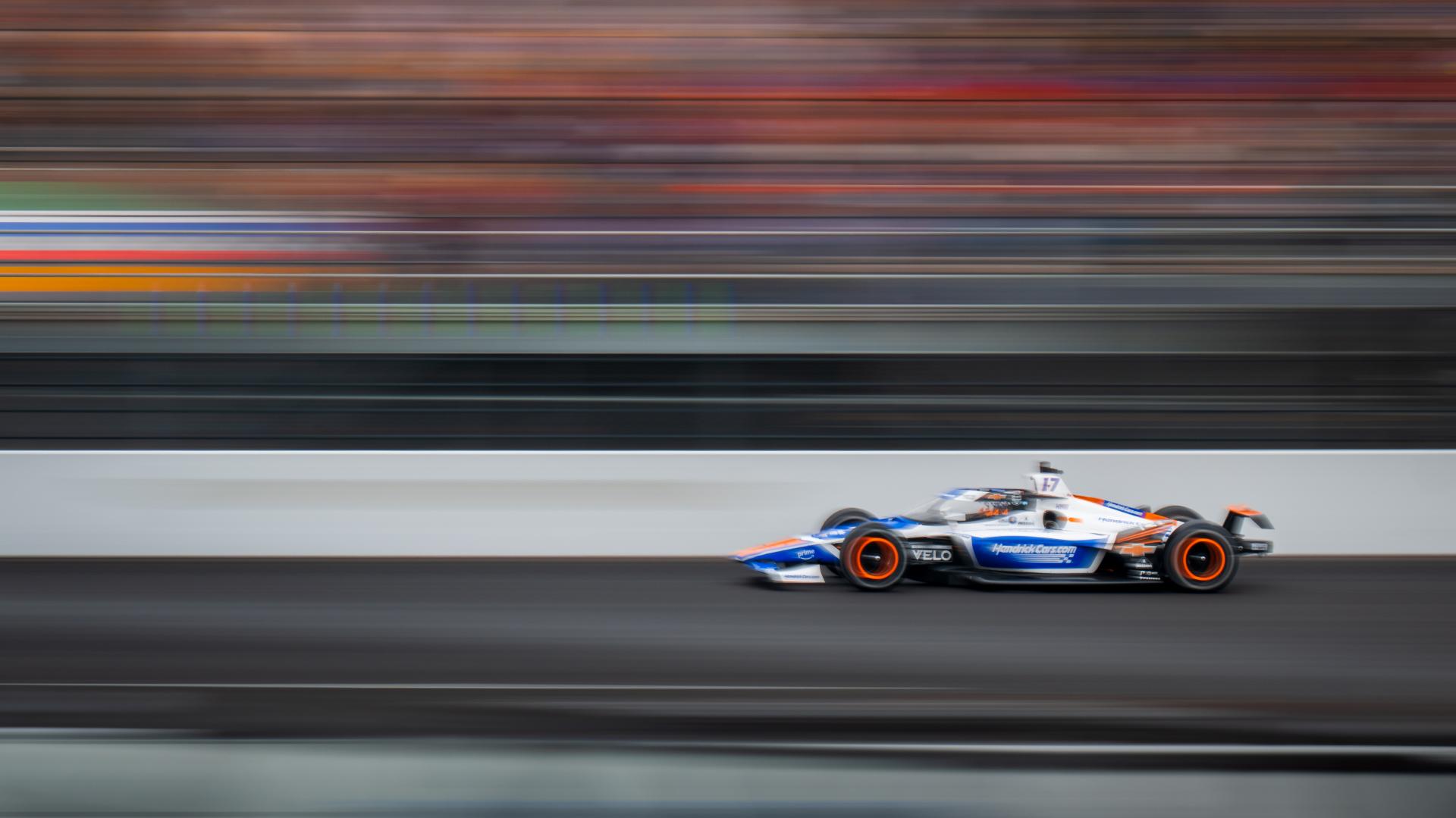 Kyle Larsen's car on the move at the 2025 Indianapolis 500.