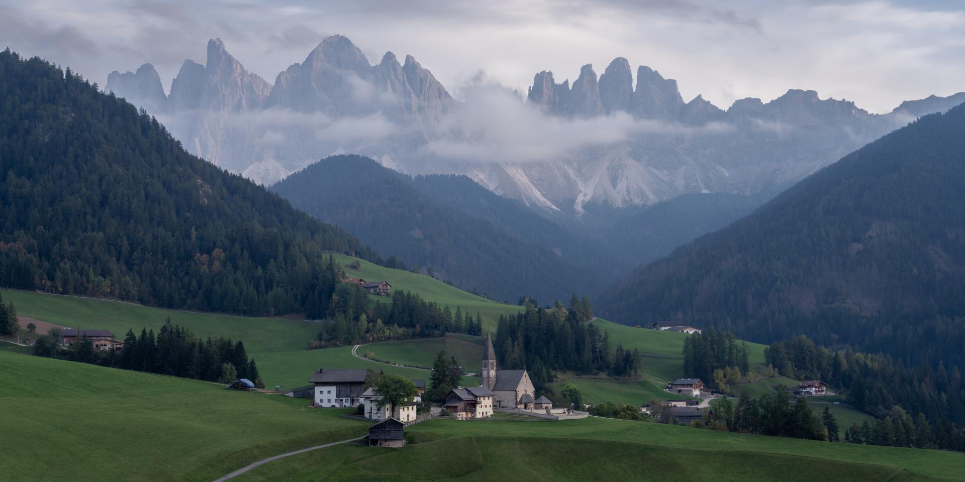 The Village of St. Magdalena, nestled in the Val di Funes in the South Tyrol region of the Dolomites.