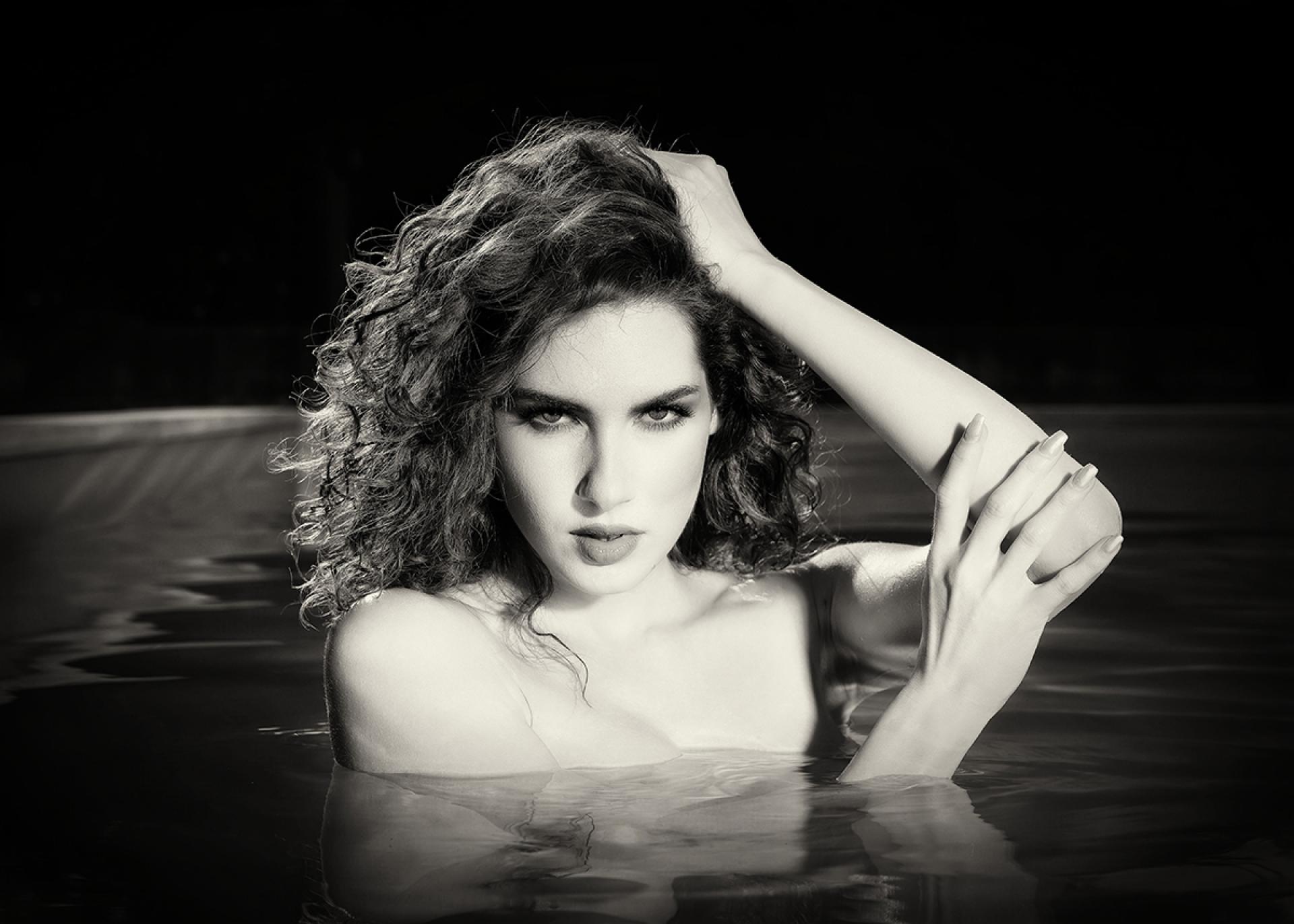 This picture features Dorka, a young Hungarian model who has become my muse over recent years. Captured in a swimming pool, she is immersed in water up to her chest, her nudity suggested rather than revealed. Though the viewer senses she is unclothed beneath the surface, the composition emphasizes self-assurance and presence over exposure.