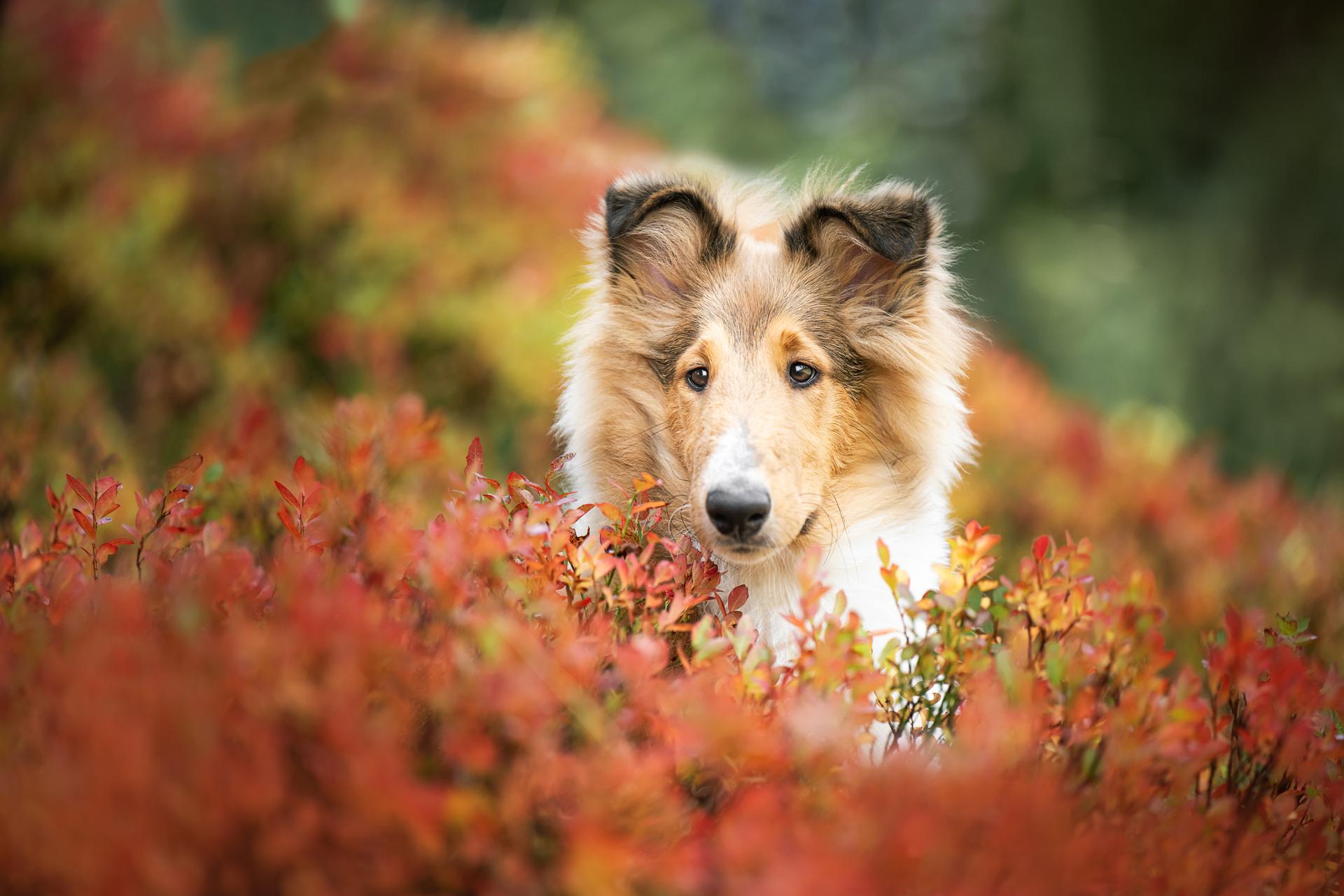 In a sea of vibrant red autumn leaves, the young Collie Collin appears – curious and gentle at the same time. His golden fur glows warmly in the soft light, as if it were reflecting the colors of autumn itself. With attentive eyes and a soft, fluffy mane, he looks like a little explorer. The surroundings are calm – almost magical.